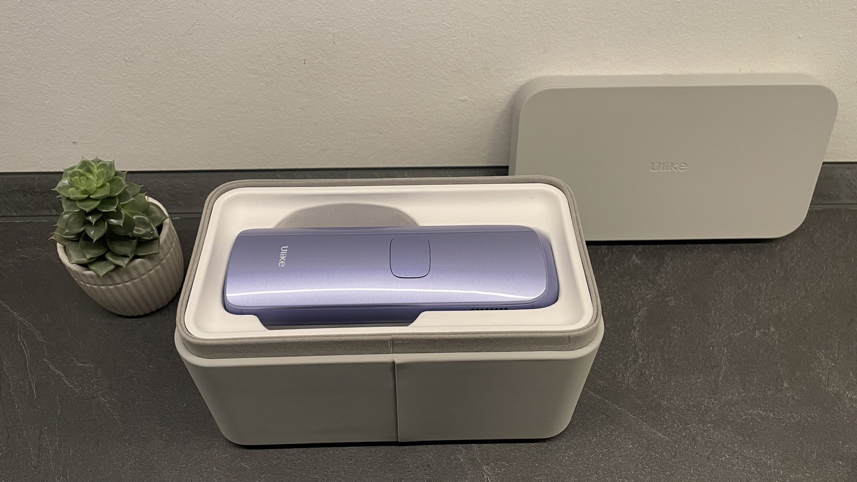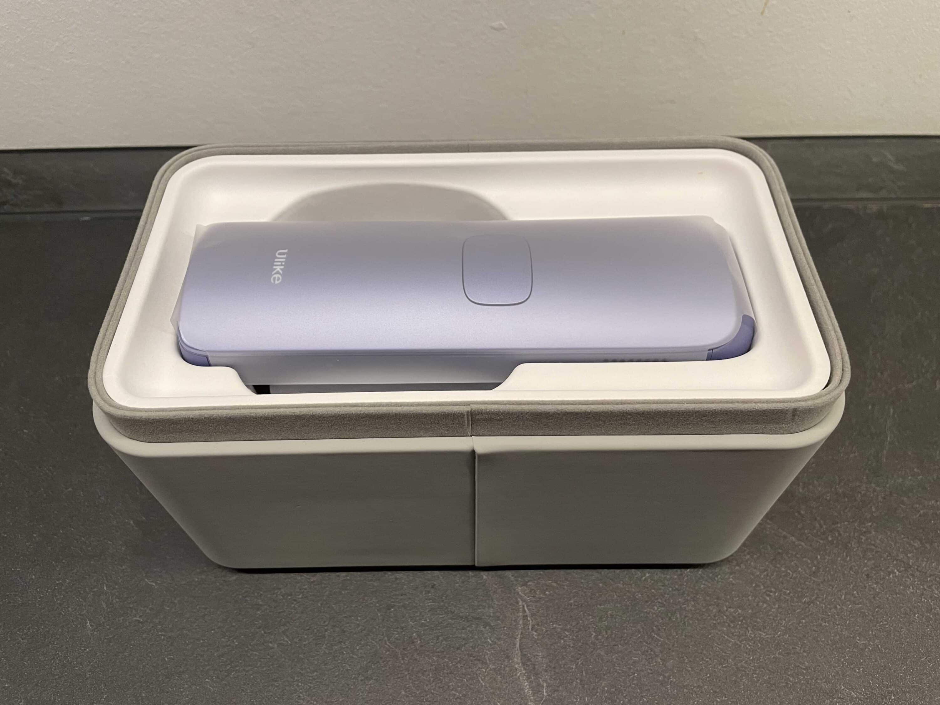There is another button on the side that you can use to switch the device on and regulate the intensity of the pulses. The light unit is located at the top and the input for the power cable at the bottom. The device itself and the accessories impress with their high-quality choice of materials and great workmanship. Really practical: there is a matching box for the Ulike Air 3. This makes it easy to take the IPL device with you on vacation or place it in the bathroom or bedroom.