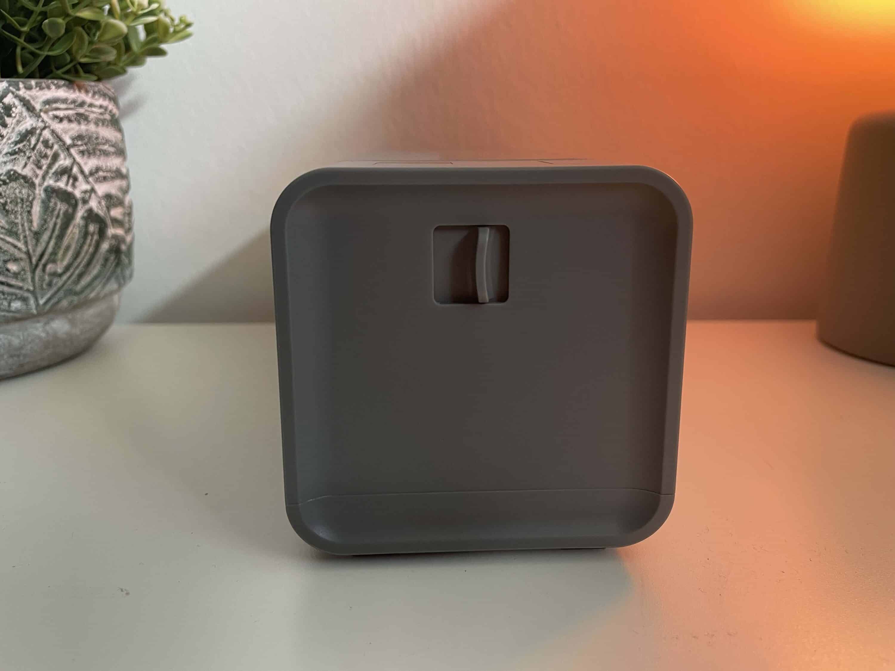 The label output is located at the front, from which the finished printed labels emerge. A look at the underside reveals four rubber feet. These are designed to prevent the label printer from slipping during operation. A button on the right-hand side allows you to lift the lid of the printer.