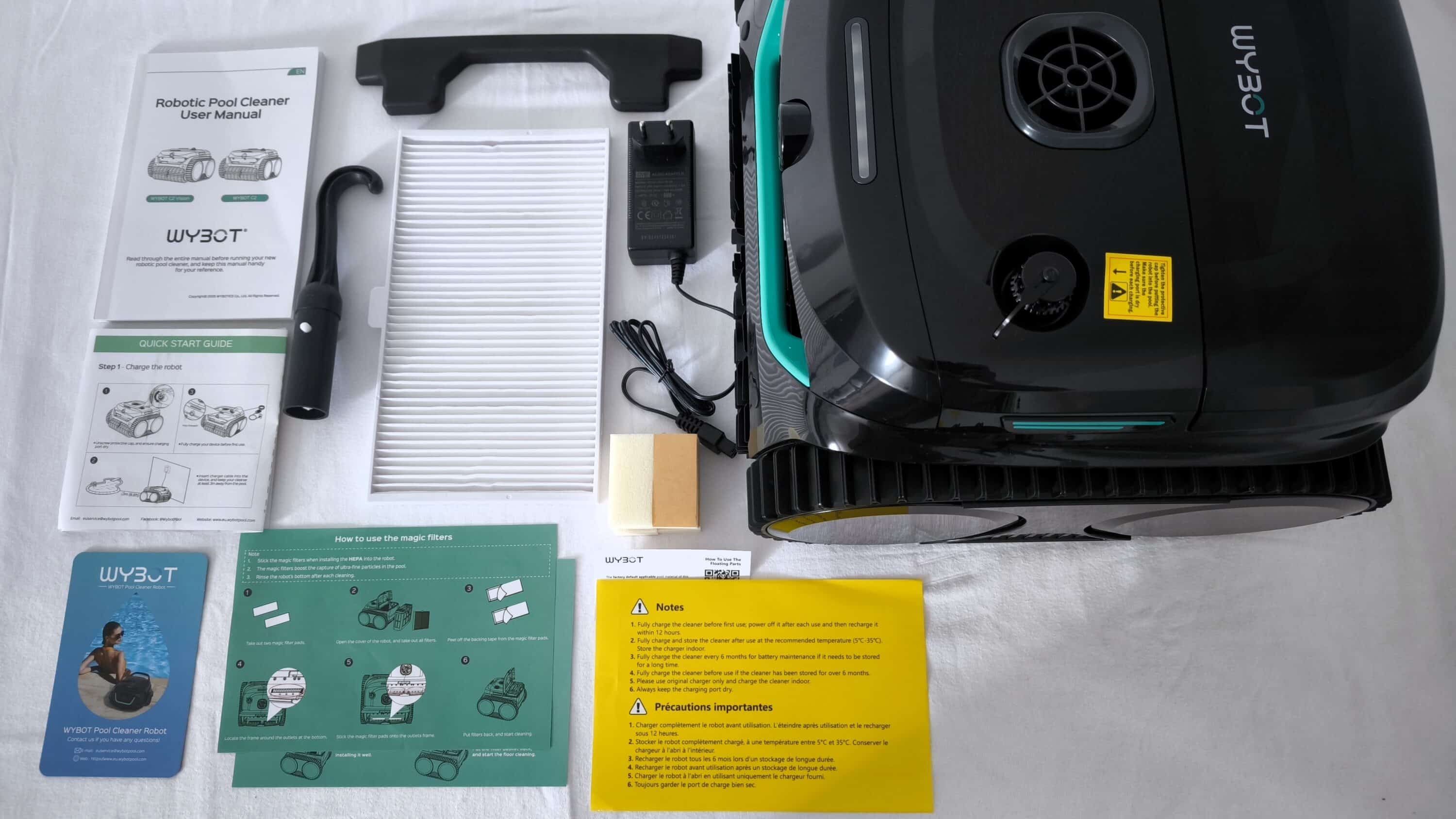 In addition to the device itself, the scope of delivery of the WYBOT C2 Vision pool robot also includes the associated power supply unit and a retrieval hook. A second filter insert is also included, which can be used as an optional fine dust filter. For easier navigation in the pool, you also receive some floating elements, although their use is not mandatory. The scope of delivery is completed by the operating instructions including some further instructions for use.