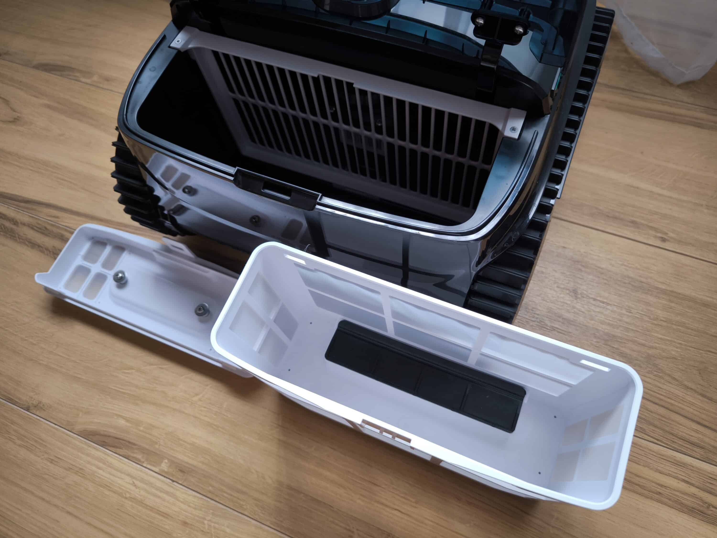 To clean the pool robot, pull the bracket on the back upwards, which opens the housing cover. This reveals the filter basket, which can also be removed. A positive new feature of the WYBOT C2 Vision is that the cover flap has been repositioned at the top. For comparison: With the WYBOT C1, the filter basket had to be opened from below, where all kinds of debris stuck directly to it.