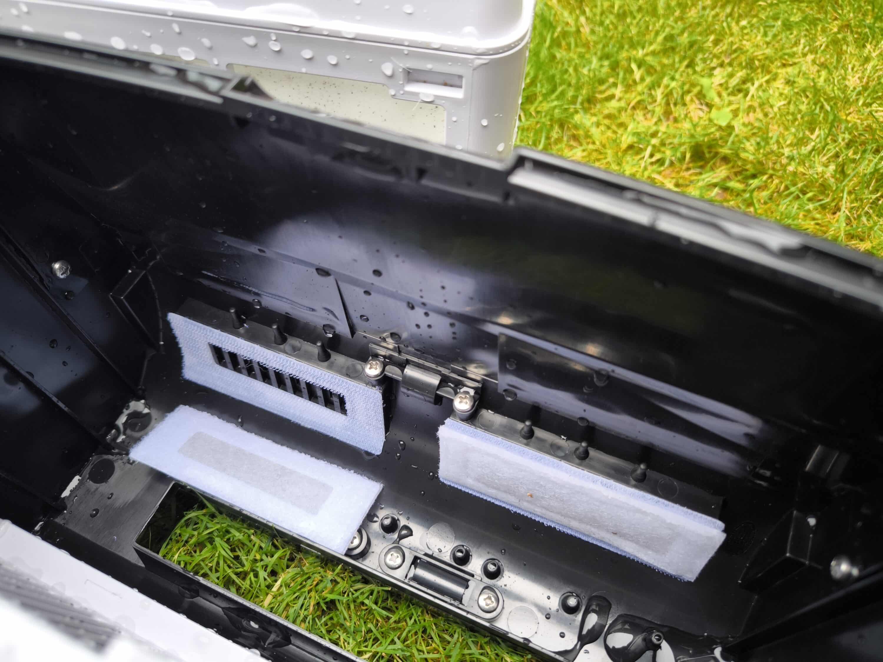 In terms of design, the WYBOT C2 Vision is already very similar to its predecessor model and has many features in common. These include the left control button on the top, the centrally positioned fan and the power connection to the right of it. The somewhat narrow carrying handle of the previous model has now been moved further forward and sits directly above the two thick roller brushes. This change creates space for an additional LED strip and an AI vision camera. The filter basket is located on the opposite side of the interior. Its housing can be opened from the outside using a push button.