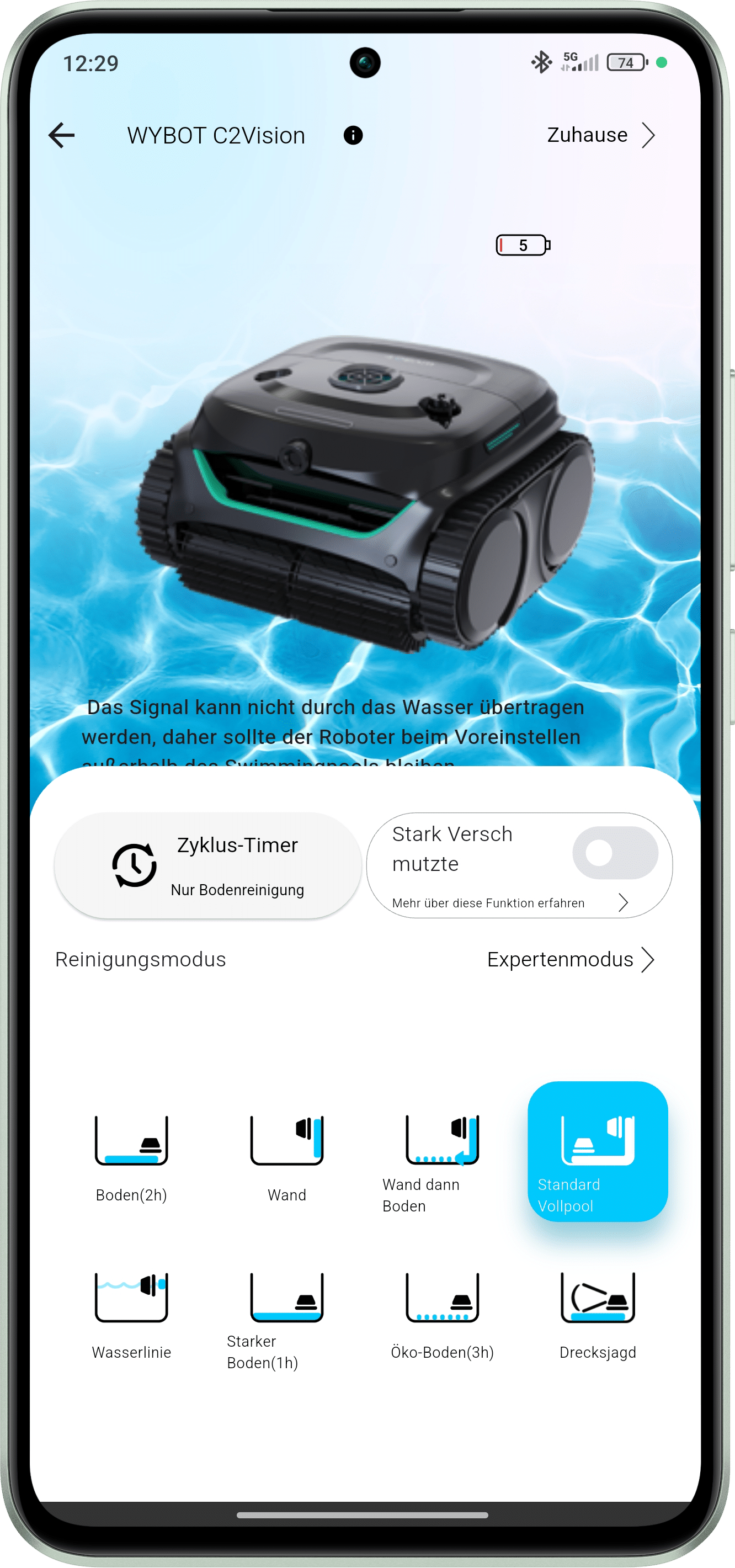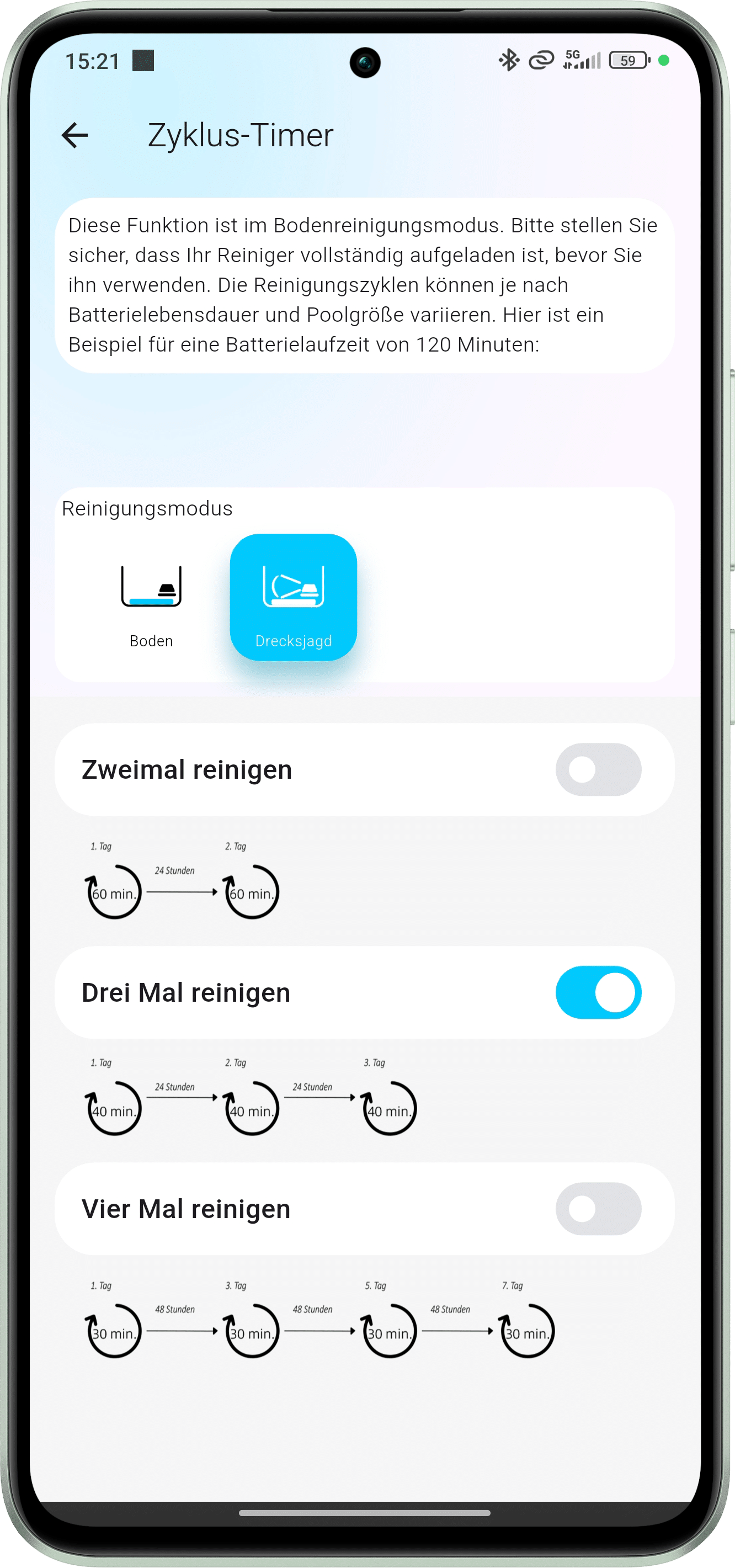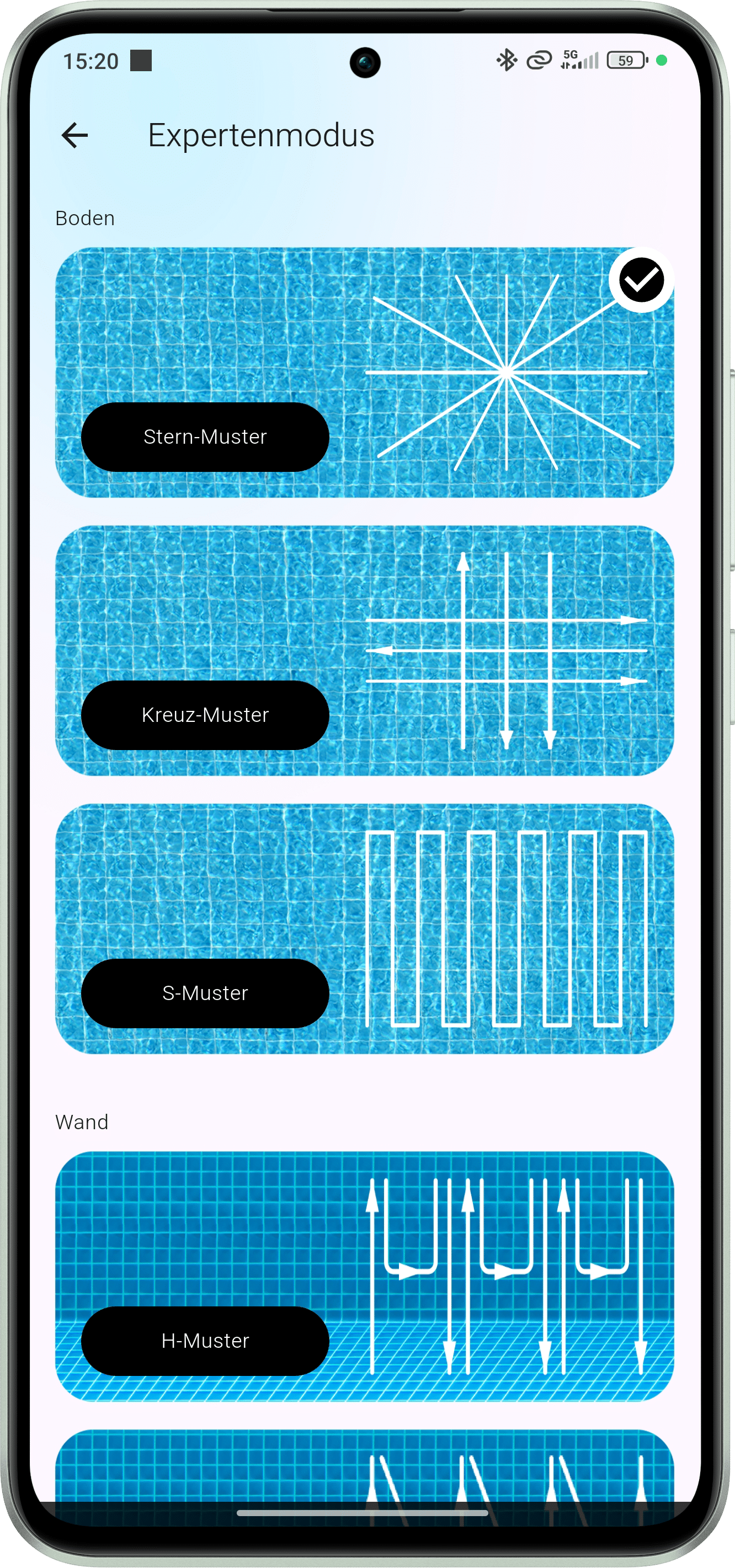 After a new registration, a pool should be added to get started and the appropriate information on the design, inclination and type of pool material should be entered. It is then possible to specify different cleaning patterns for the pool robot. You can choose between wall or floor cleaning only and explicit cleaning of the waterline. In the “Standard full pool” mode, all cleaning types are used, which should be the most practical for the general public. A new option is the somewhat strange-sounding “dirt hunt”, which only targets the dirt detected using the integrated camera.