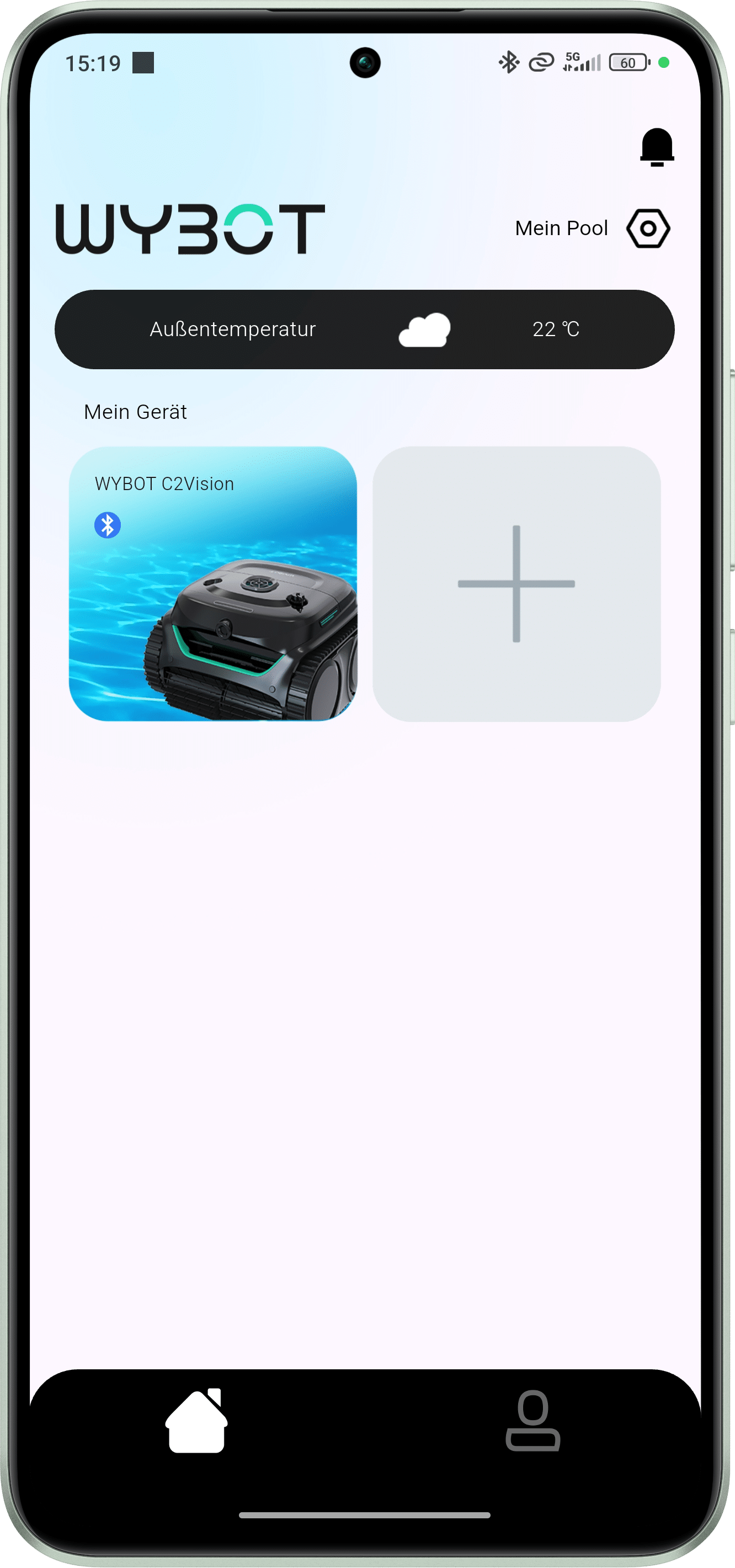 The manufacturer’s “WYBOT” app is available for further functions of the WYBOT C2 Vision. This requires you to create an account if you do not already have one. You are then taken directly to the app’s home screen, where you can easily add the new pool robot using the plus symbol. An active Bluetooth connection is required during the initial setup, after which the pool robot can be operated via Wi-Fi.