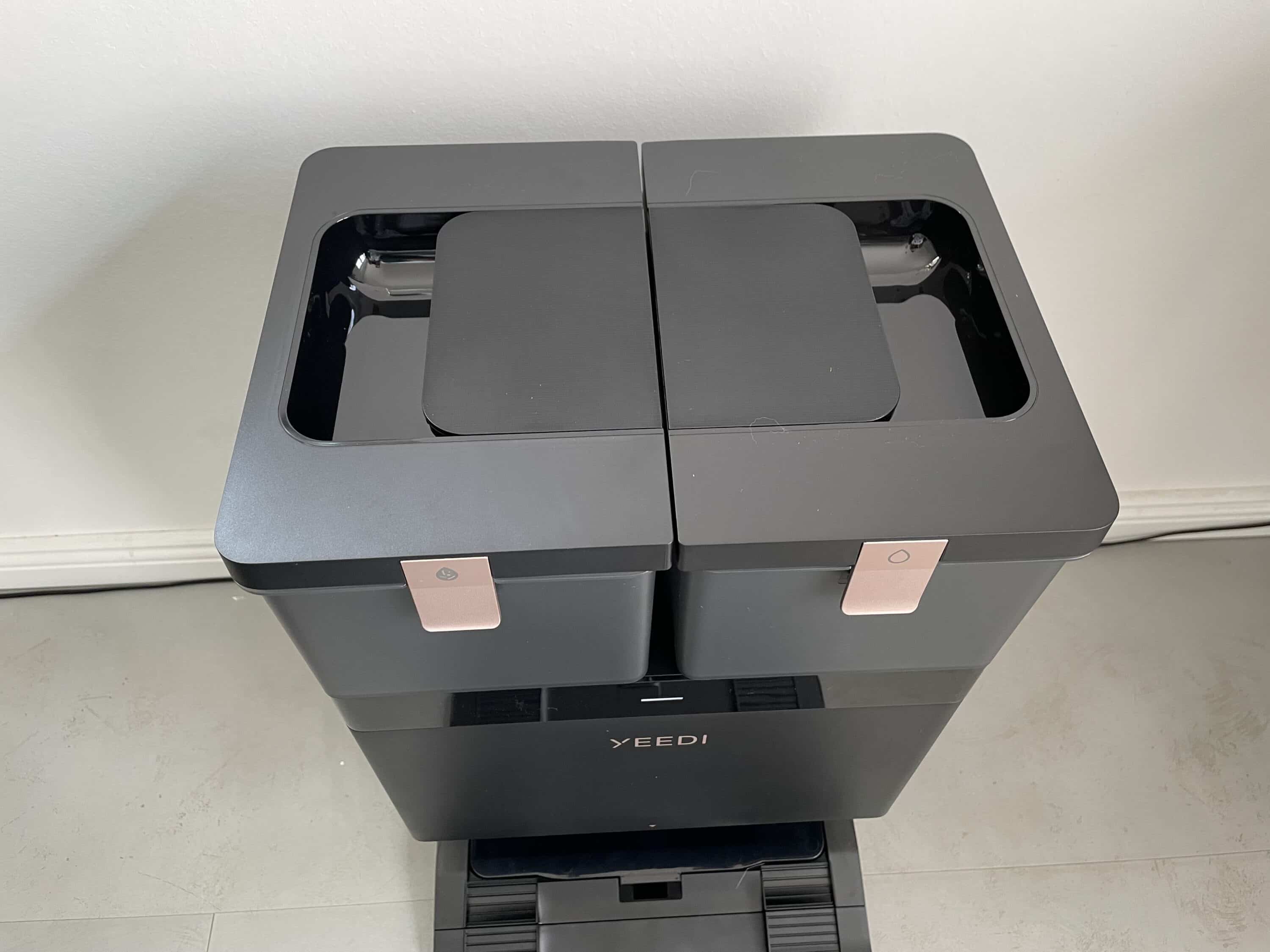 But apart from the form factor, the YEEDI S14 PLUS all-in-one station has the edge in pretty much every respect – from my point of view also visually. The station is designed in the same striking colors as the robot. Inside you will find two separate tanks – one for fresh water and one for dirty water. Both offer a considerable volume of 4 liters. By comparison, the Cube has 1 liter and 1.2 liters respectively.