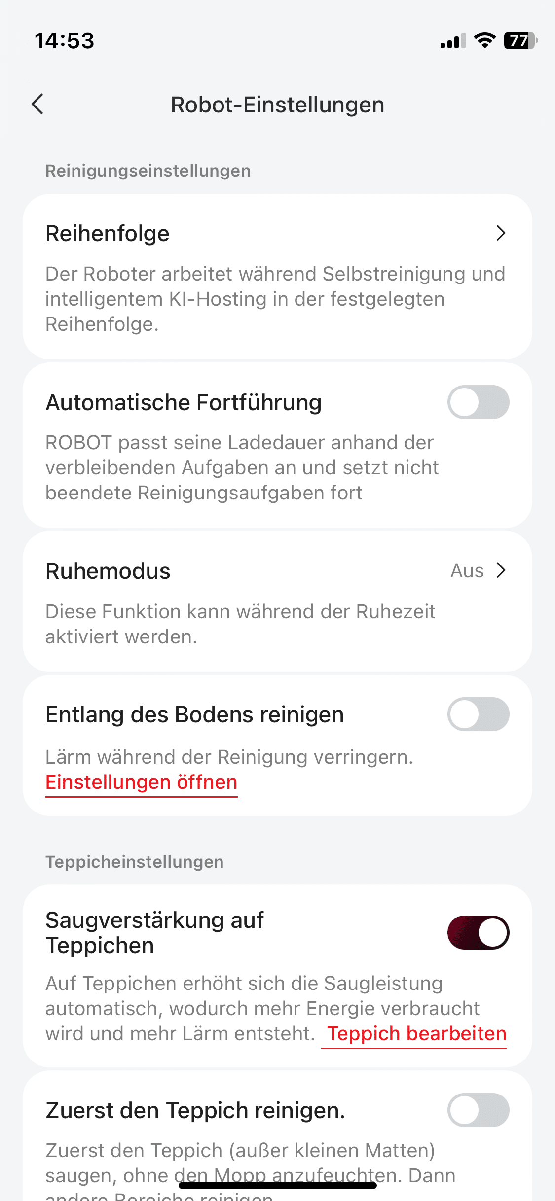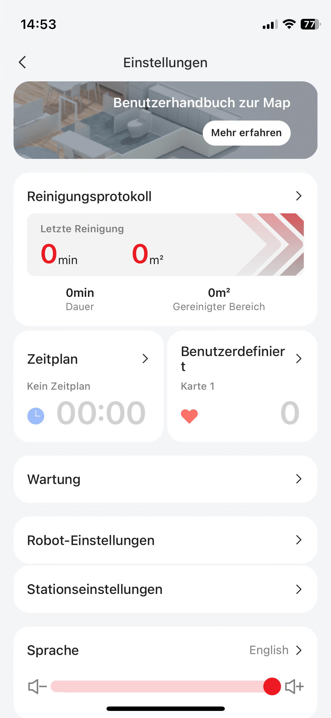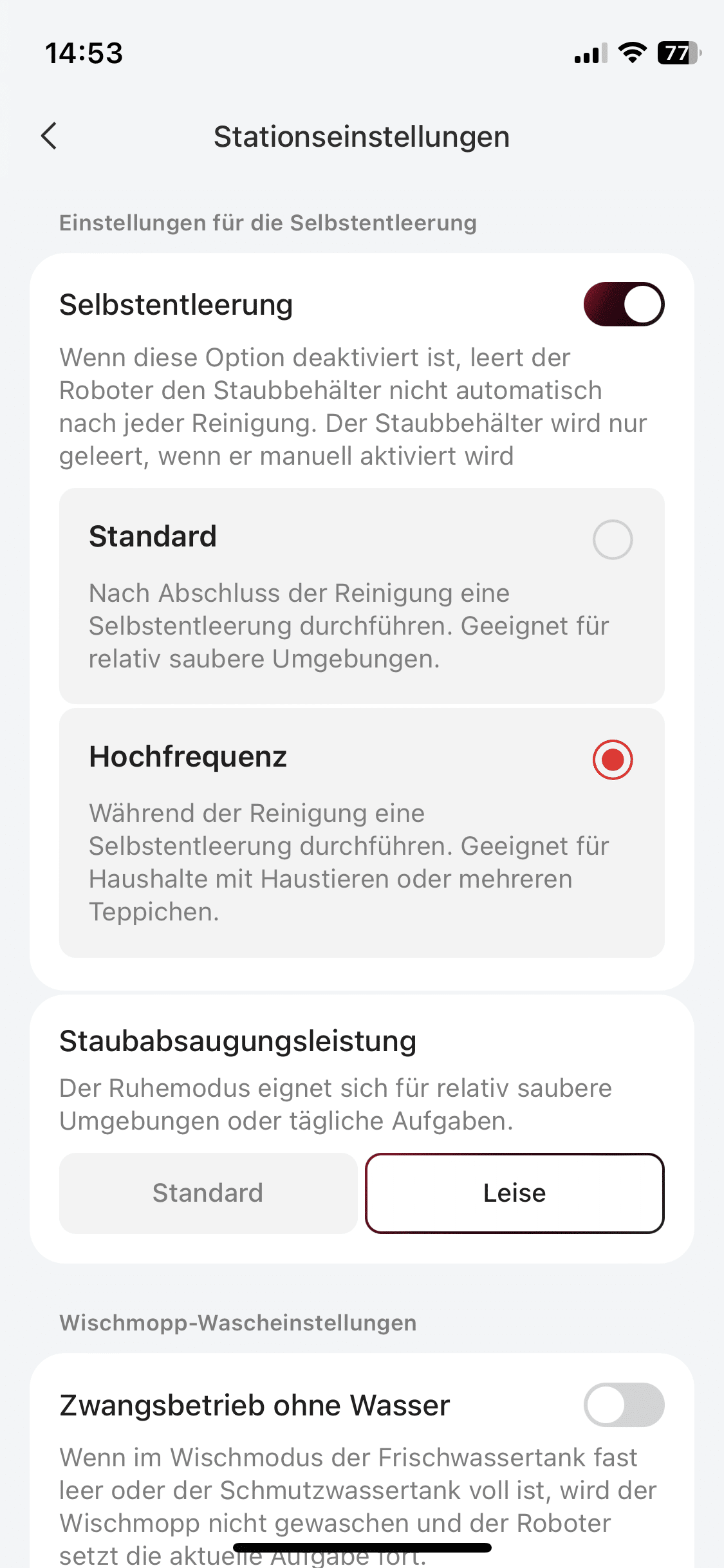 The app not only allows you to start and stop the robot remotely. You can also make many different settings. For example, the suction power. Here you can choose between four different power levels. To increase the mopping performance, you can also increase the water flow rate. Not only the Robo, but also the station can be adjusted in some parameters, such as the drying time of the hot air drying.