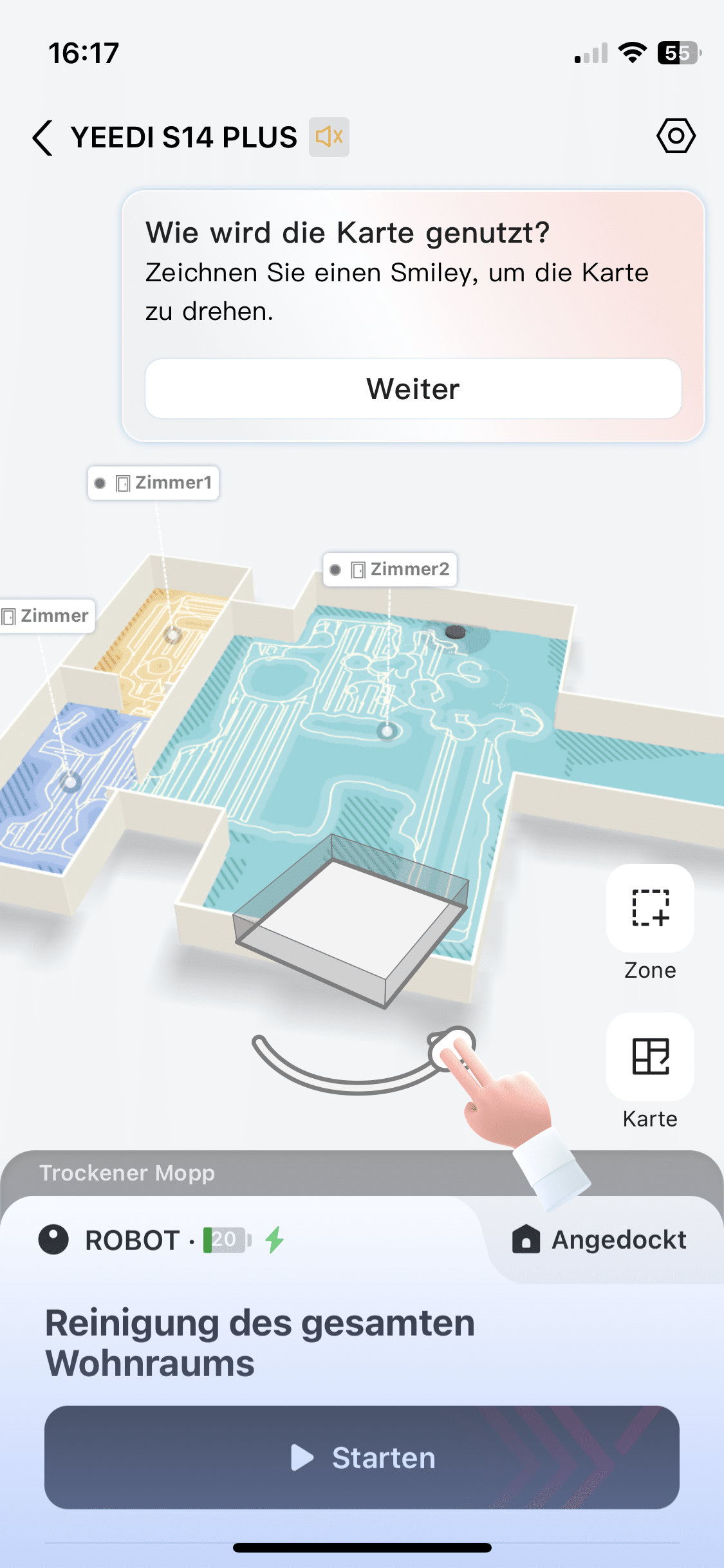 You can then view the final result in the app. If this deviates from reality, you can make further adjustments in the map. Now fill the fresh water tank with water and the YEEDI S14 PLUS can get started. You can start the first cleaning tour either via the app or by pressing a button on the robot itself.