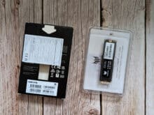 The Acer Predator GM9 is supplied in a compact black box. On the front is a picture of the SSD as well as information on the capacity and interface. Further information such as the model name and model number can be found on the back. The SSD itself is also visible through a cut-out on the back of the box. The box contains the SSD, a thermal pad made of graphene and copper and a screw for mounting the SSD.