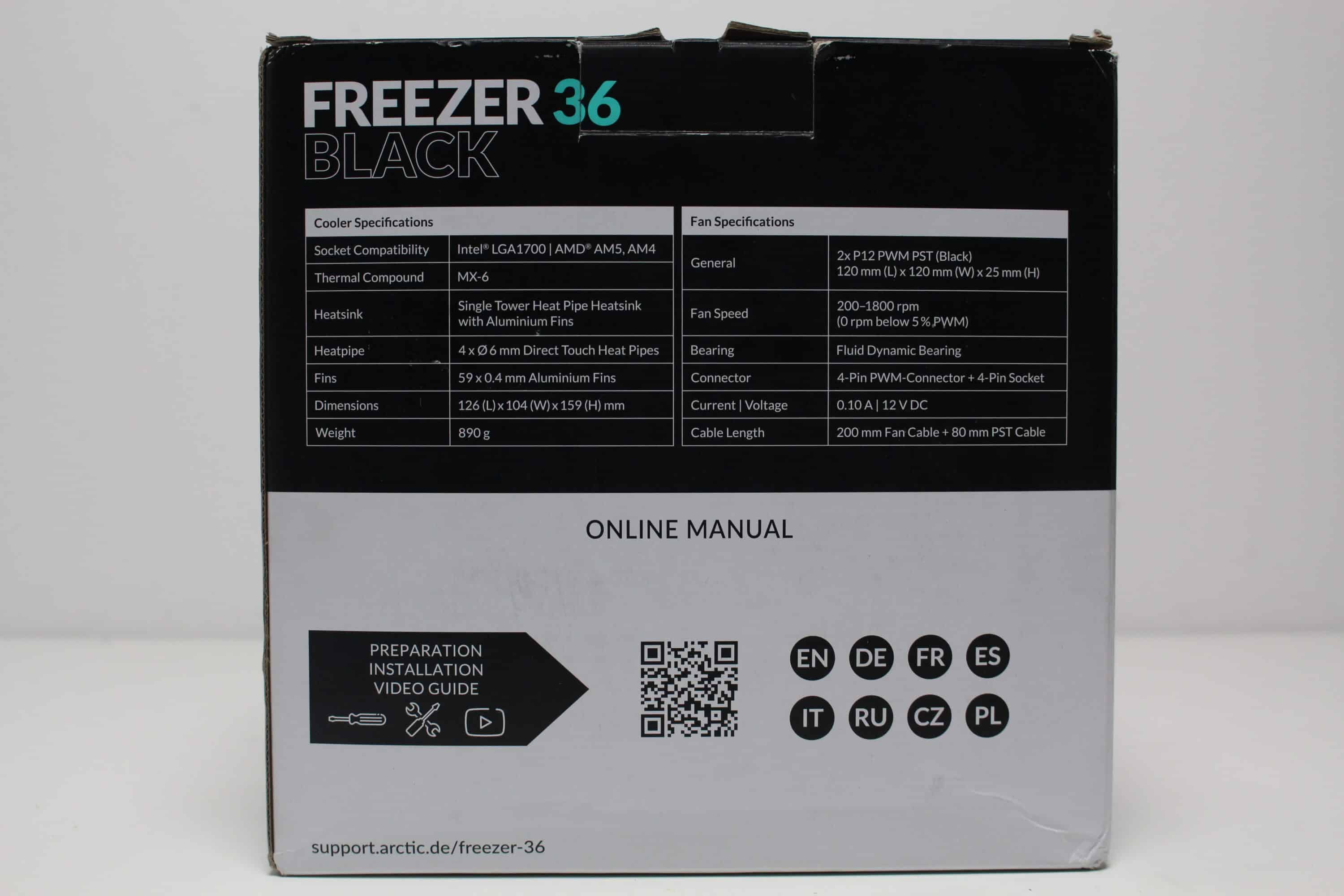 Arctic packs the Freezer 36 in a compact cardboard box dominated by the main colors black and white. In addition to the manufacturer’s logo, we also find the product name and a schematic drawing of the CPU cooler on the packaging. A table with all the technical data and a list of the package contents can also be seen on the back.