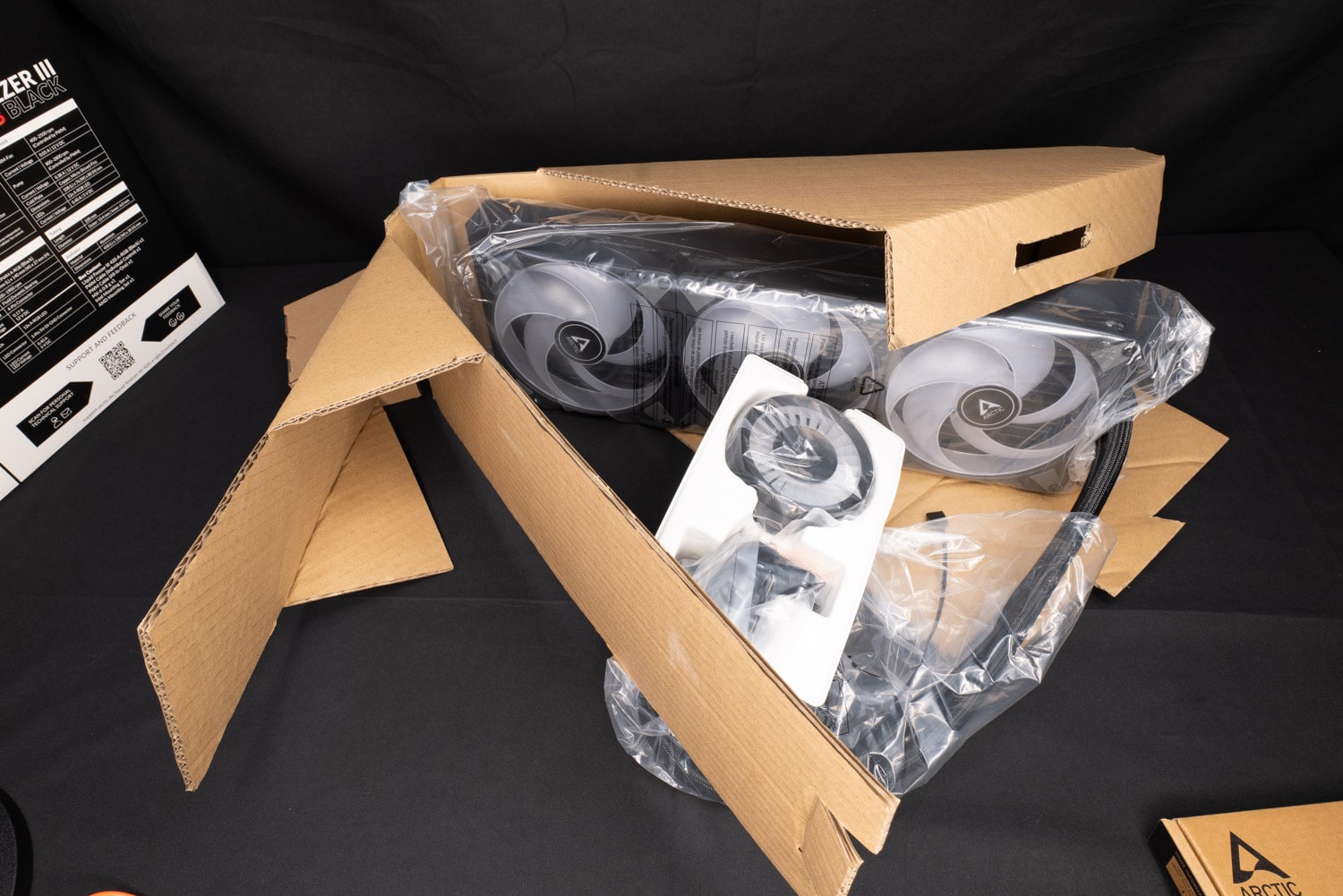 The unusual packaging of the Liquid Freezer III 420 A-RGB stands out from the rectangular packaging of its smaller siblings with its almost triangular shape. What looks like a nightmare for stockists turns out to be a space- and resource-saving packaging design that also looks good on the shelf when unpacked.