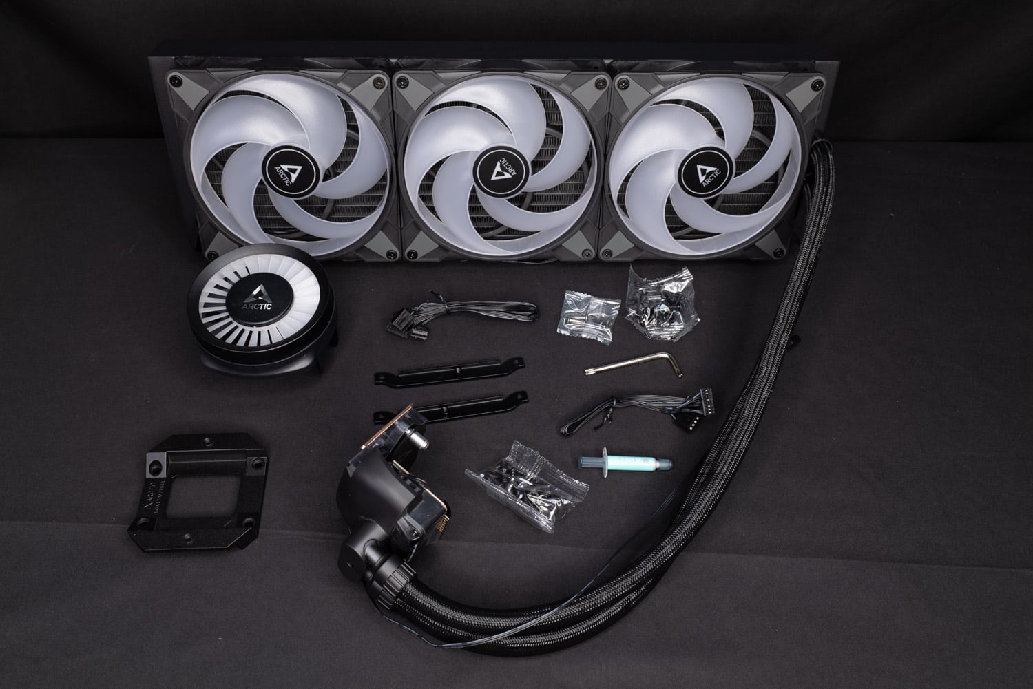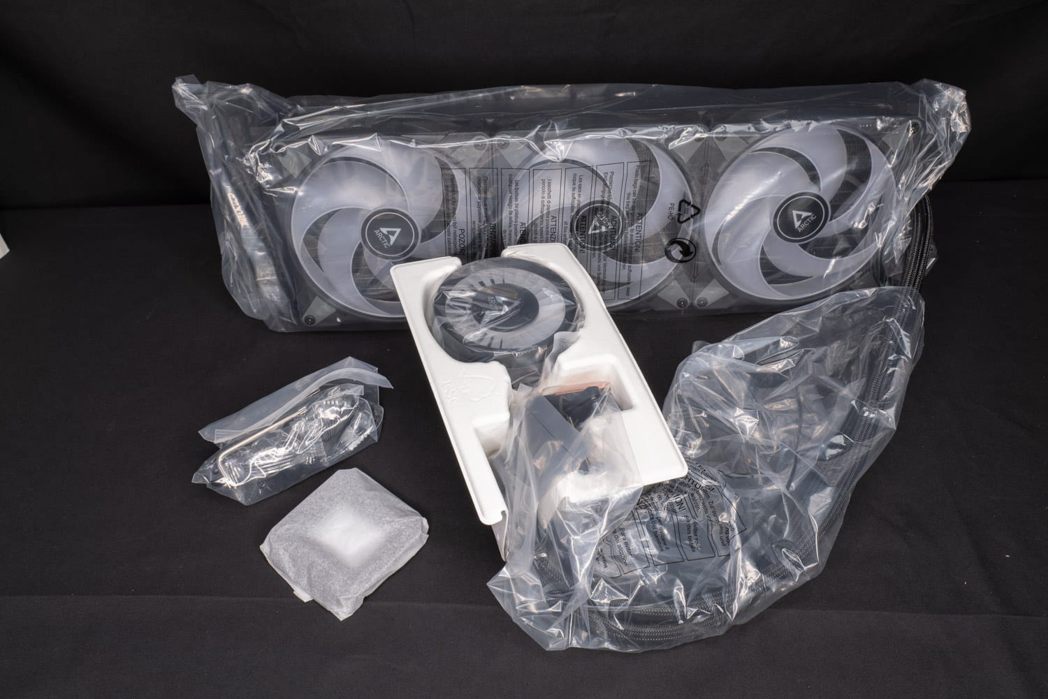 The style of the individual components is predominantly minimalist. It could also be described as industrial, simple and restrained. This best applies to the matt black radiator, on which three 140 mm fans are pre-installed. The matt black plastic frames of the fans stand out from the radiator with clear, geometric lines and gray rubber contact surfaces. In contrast, the fan blades are made of transparent white plastic and feature long, sweeping curves.