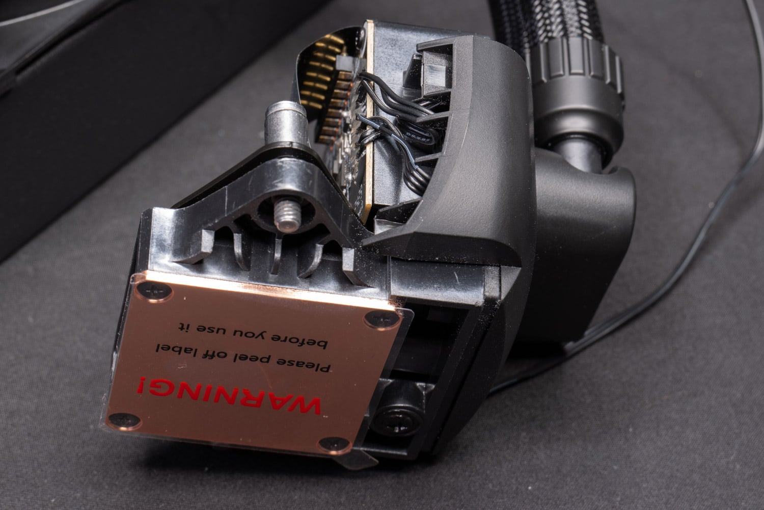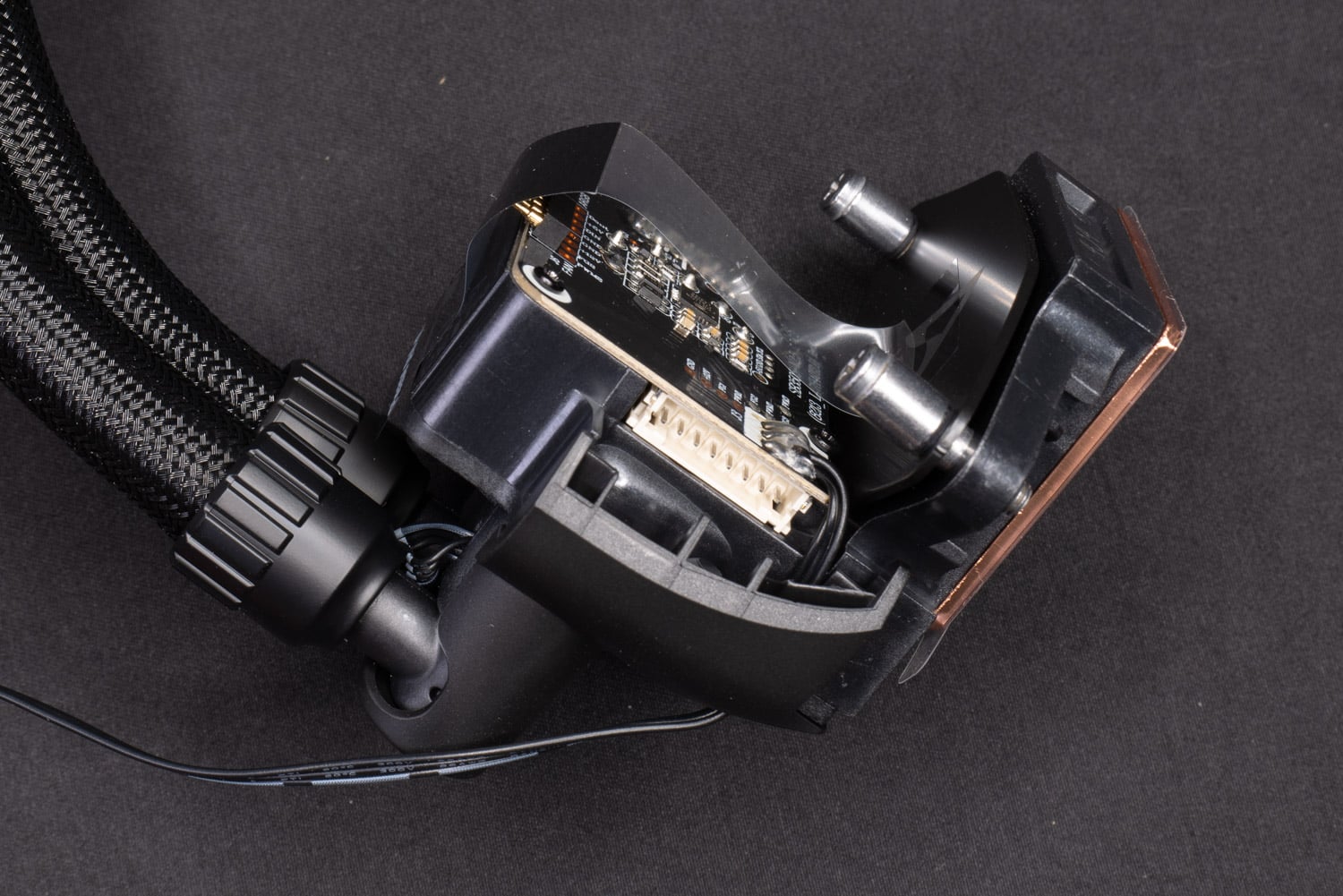 With its visible control electronics, the cooler looks much more technical than the other components. It houses the cooling plate, hose connections, PWM socket and the contacts for the VRM fan module. The cooling plate on the underside of the cooler is made of copper and has been processed using the so-called Skived Fin process. In this process, cooling fins are “scraped” out of a metal block with high precision. This enables a high thermal cooling capacity thanks to narrow fin spacing.