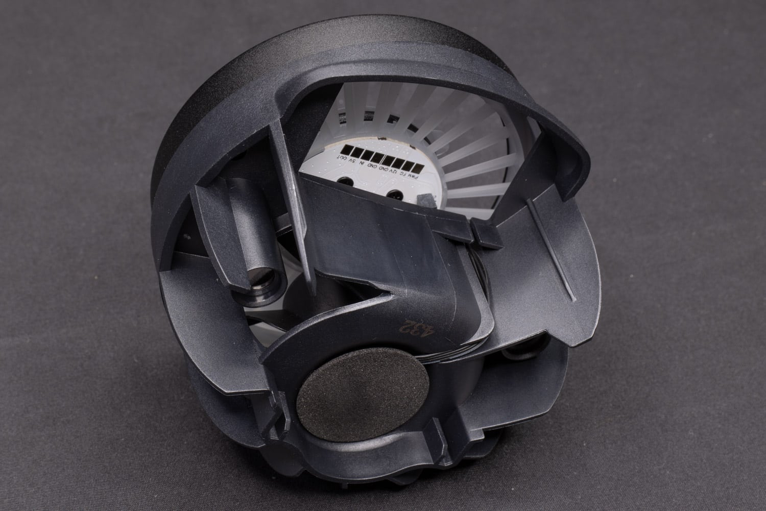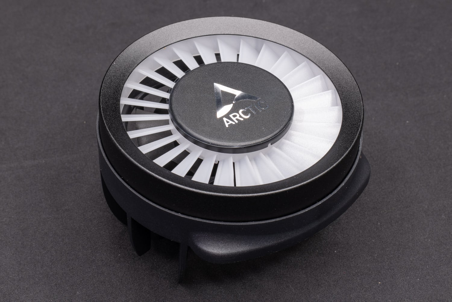 The VRM fan module adheres magnetically to the radiator. It is supplied and controlled via superficial electrical contacts and is visually reminiscent of an aircraft engine. The “turbine” is made of matt white and the housing of matt black plastic, with a silver ARCTIC logo in the center.