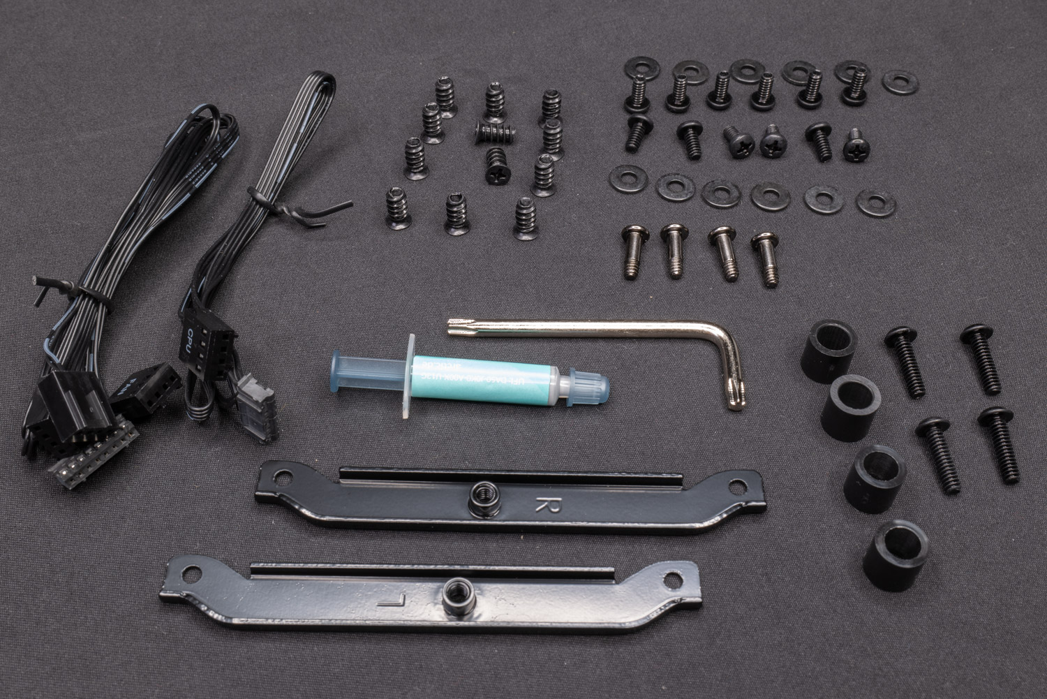All parts of the contents are again packed in plastic, the cooler and the VRM fan module are in a mold made of papier-mâché. Screw sets are packed individually, as are the mounting kits for AMD and Intel sockets. Both the copper plate of the cooler and its circuit board are covered with a protective film.