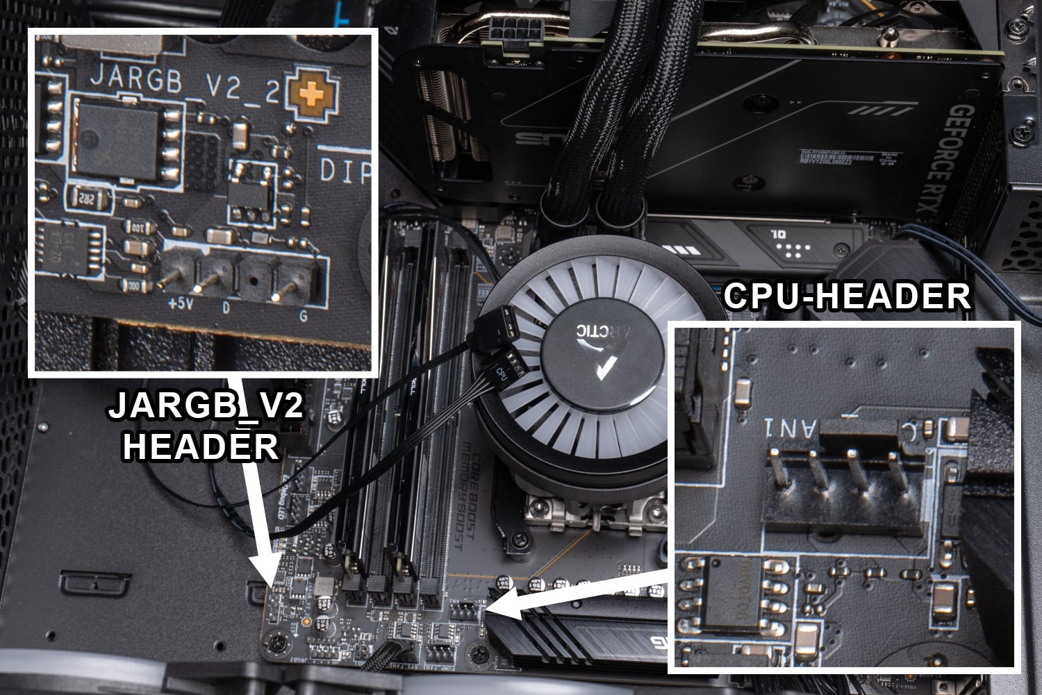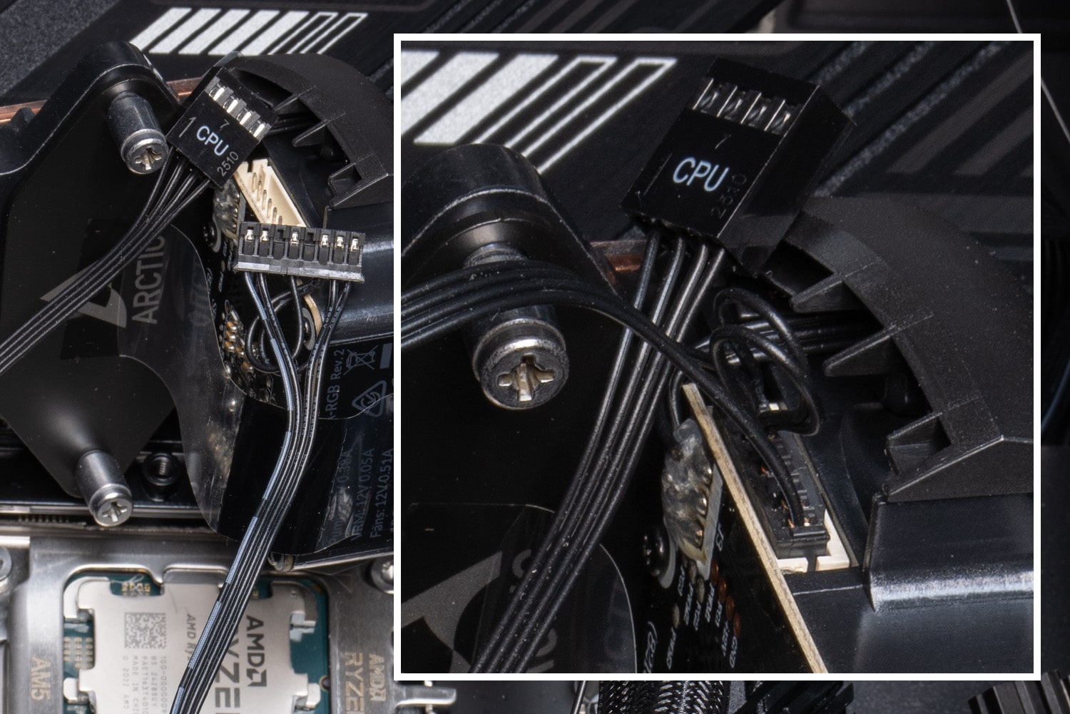 The last step is to connect the cables to the respective headers of the mainboard or other control hardware. In the case of the All-in-One PWM cable, only the CPU fan header of the mainboard would need to be used to connect the cooler. It may also be necessary to set the fan control in the BIOS to PWM instead of DC.