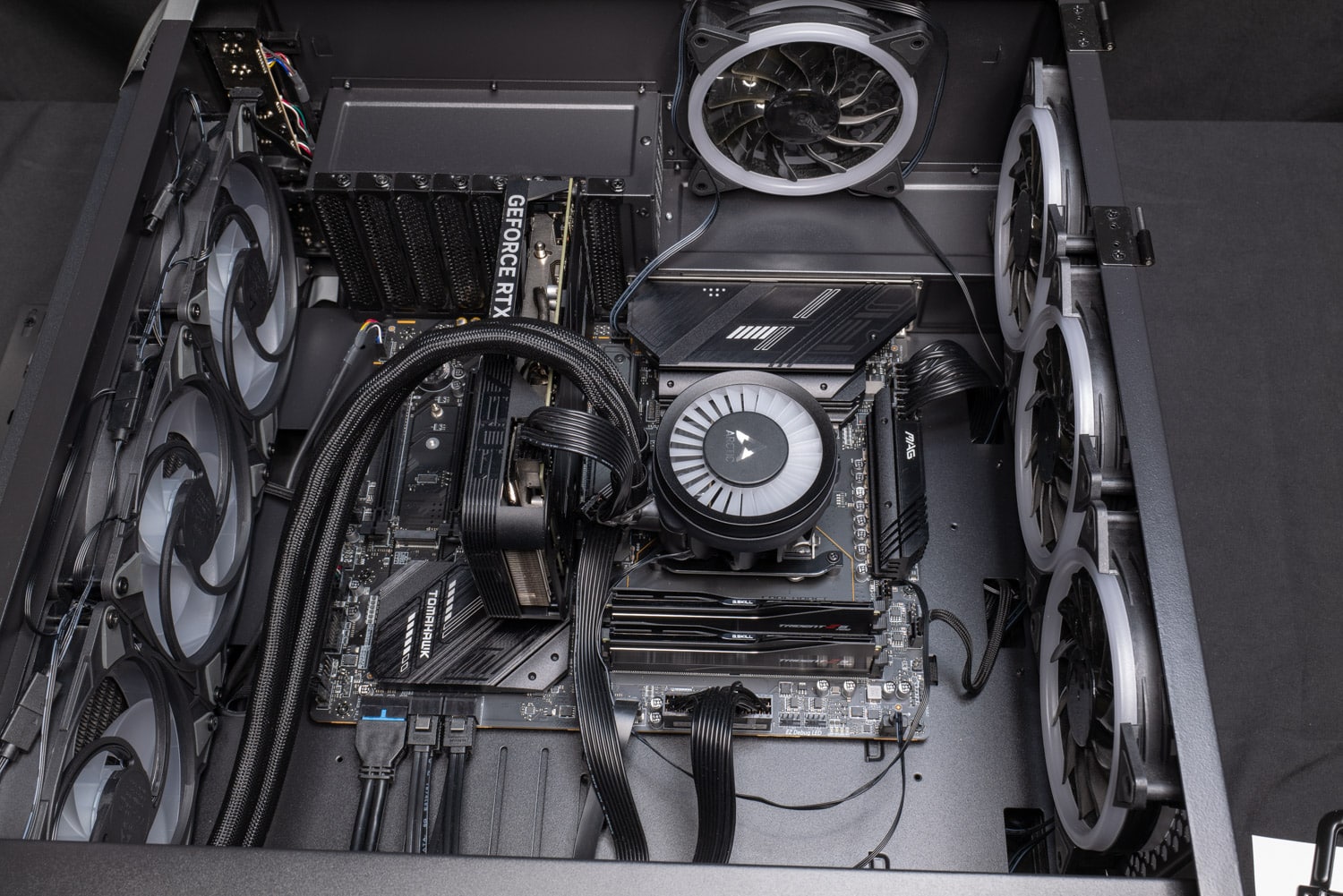 For this ARCTIC Liquid Freezer III 420 A-RGB test, the compact CPU water cooling system was installed in the following system. It should be noted that the Liquid Freezer III 420 could not be fully installed in the test case due to the 38mm thick radiator. Nevertheless, the case was used for the test due to its good ventilation. The radiator was simply inserted loosely into the front of the case and not screwed in.