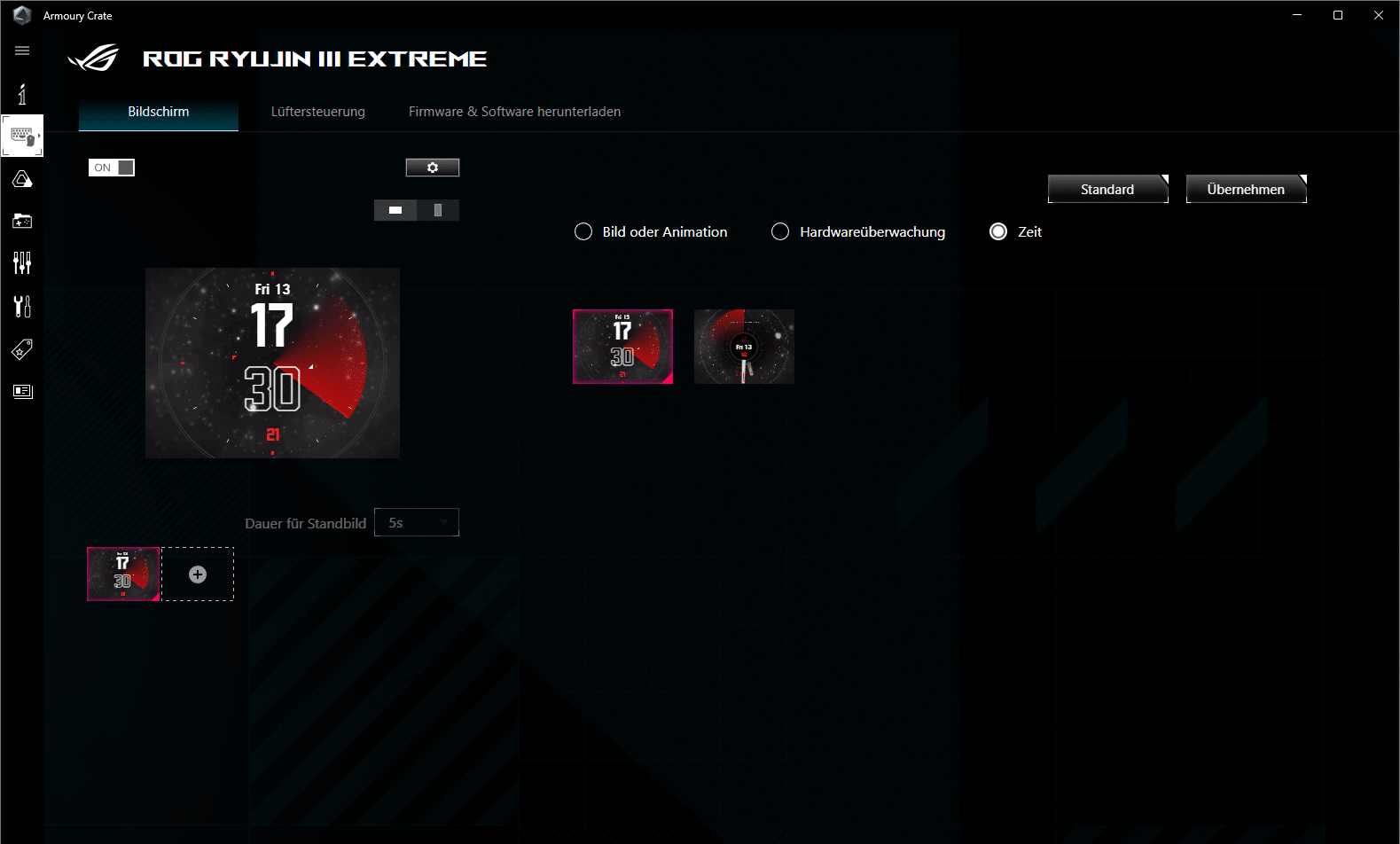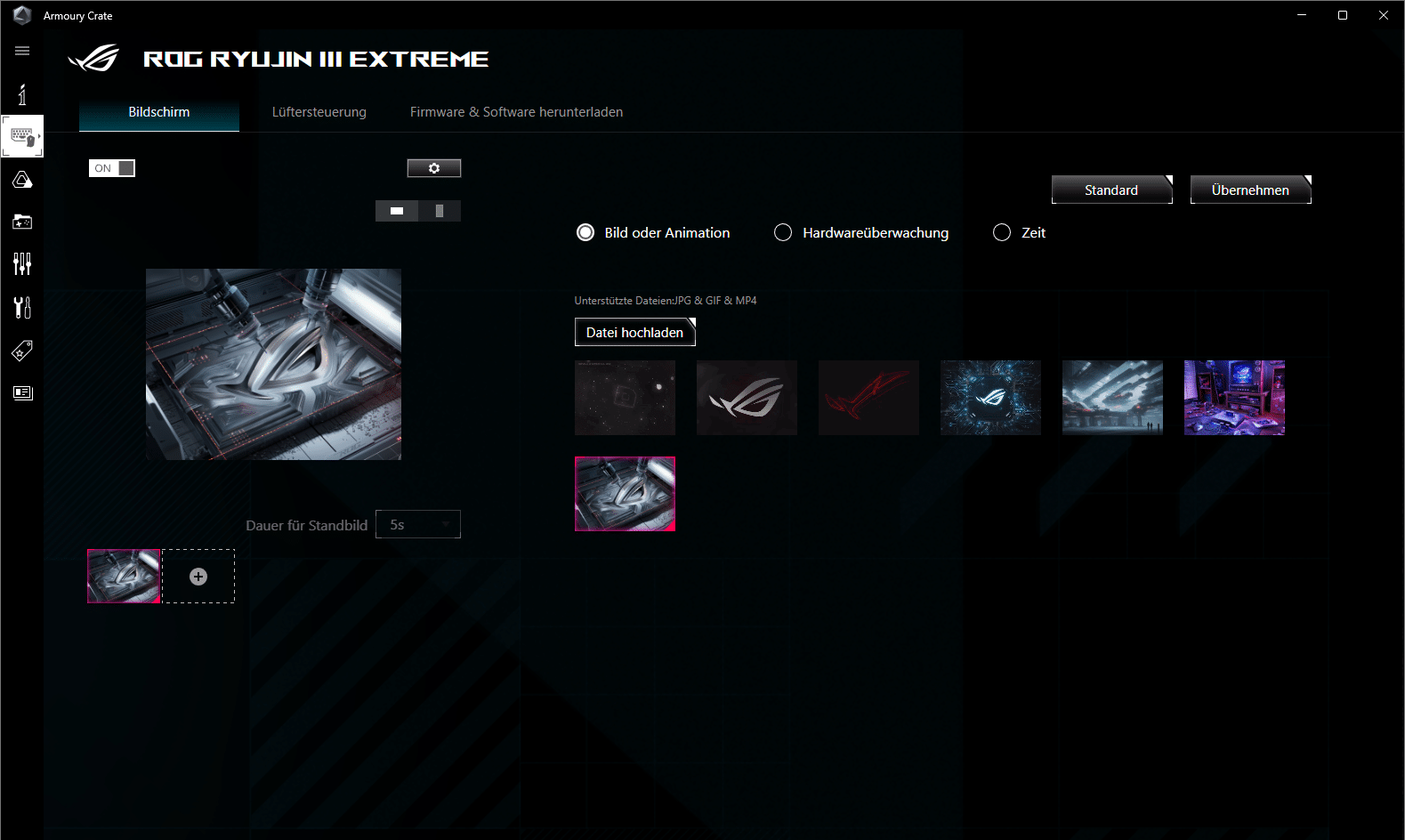 A special feature of the ASUS ROG Ryujin III 360 ARGB Extreme is the 3.5″ LCD display in the pump cover, which should impress with a resolution of 640×480 pixels and a refresh rate of 60 Hz. It is connected via a USB 2.0 header and therefore offers very individual personalization options. Be it the animated display of hardware information, the time or the display of customized GIF animations or static images. So there are no limits to creativity here. The display must be configured using the ASUS Armory Crate software.