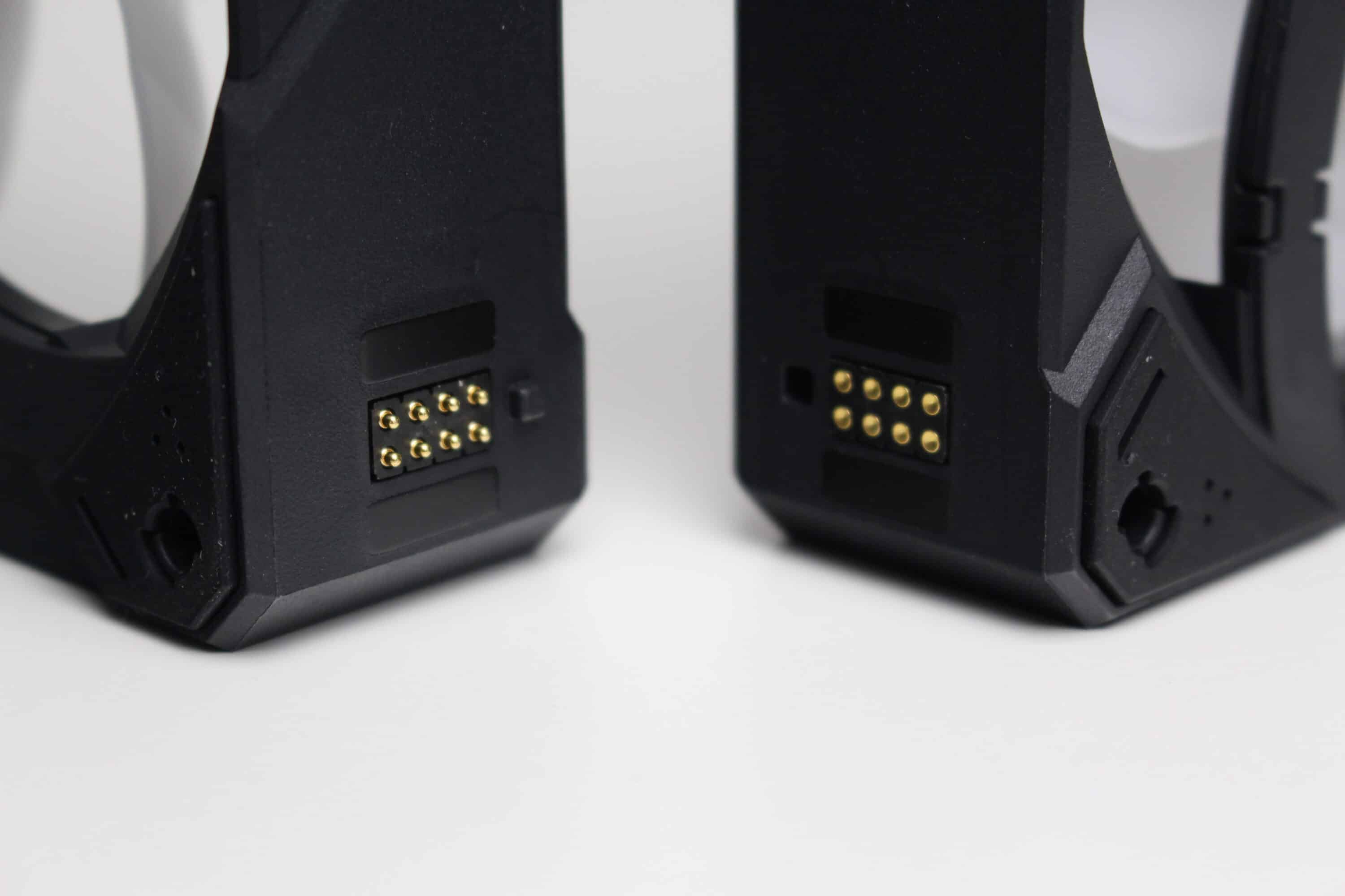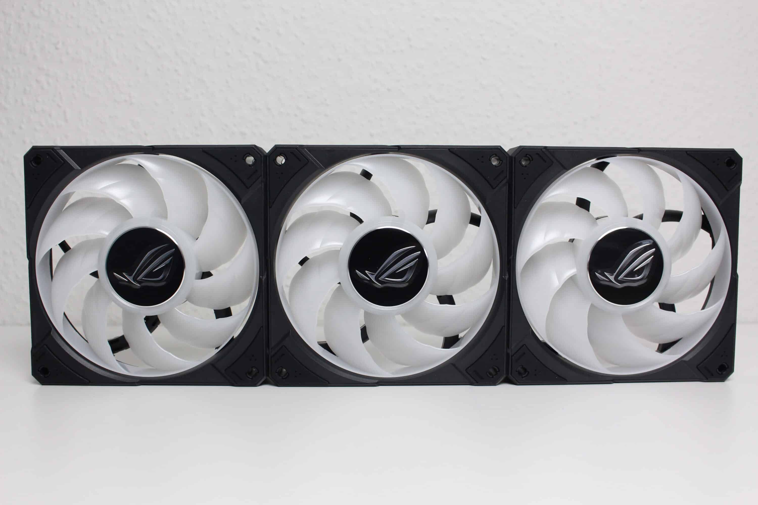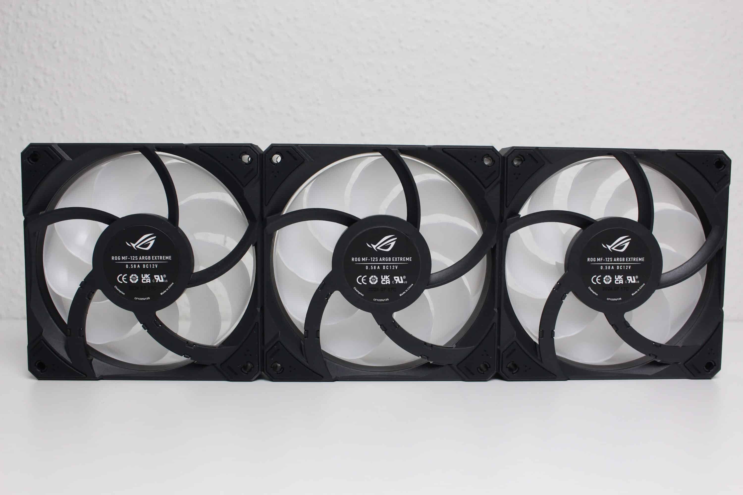 The three included ROG MF-12S ARGB Extreme fans have a frame width of 120 millimeters and are 30 millimeters deep. The frame is black and the rotor has a milky white design. The latter consists of seven fan blades, which are connected via an outer ring. A special feature is the side and magnetic contacts, which allow the fans to be simply plugged together. The cable harness, consisting of a 4-pin PWM and a 3-pin 5V ARGB header, is also attached to the front or rear end of the fan trio in this way. The ARGB LEDs are also located in the fan hub.