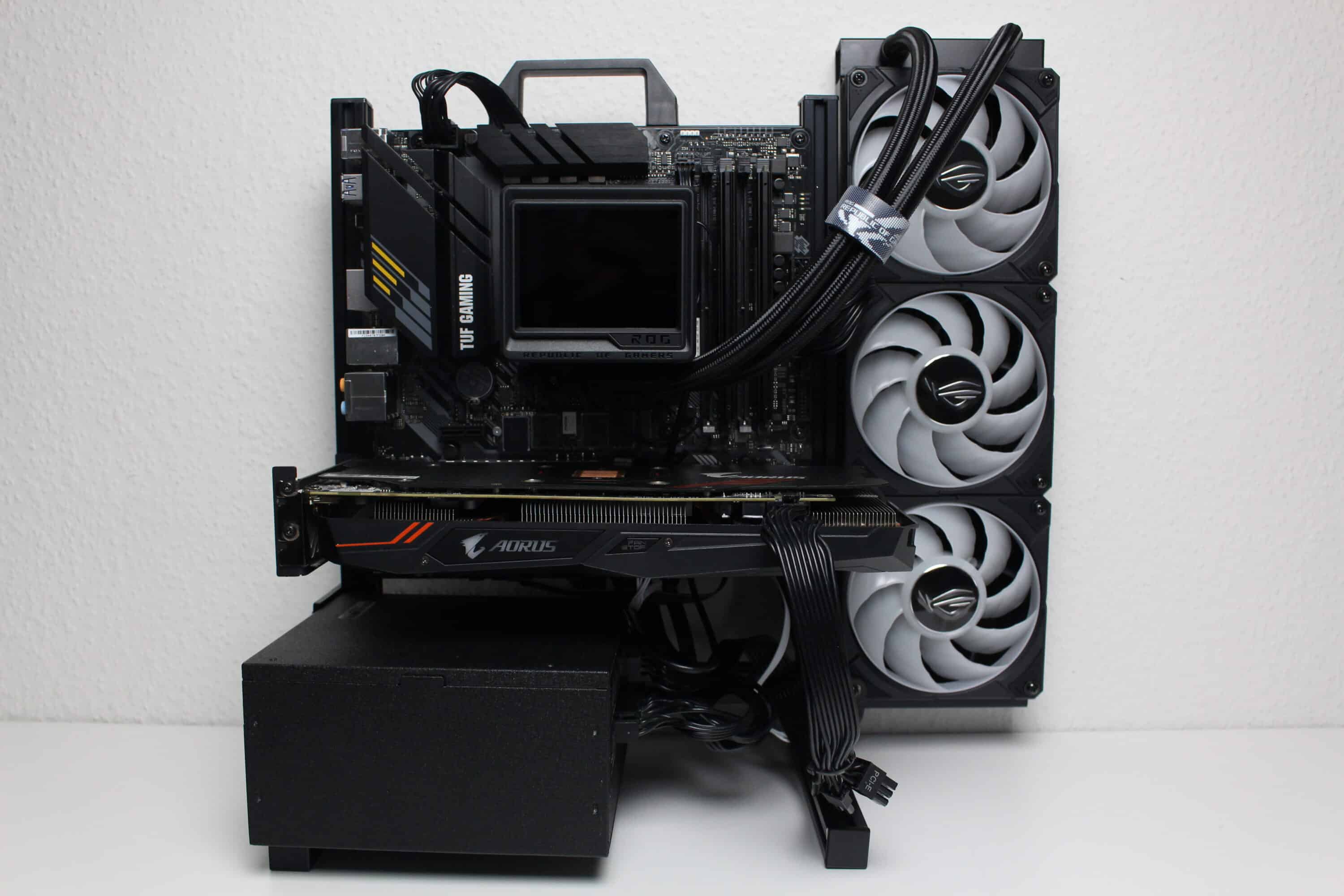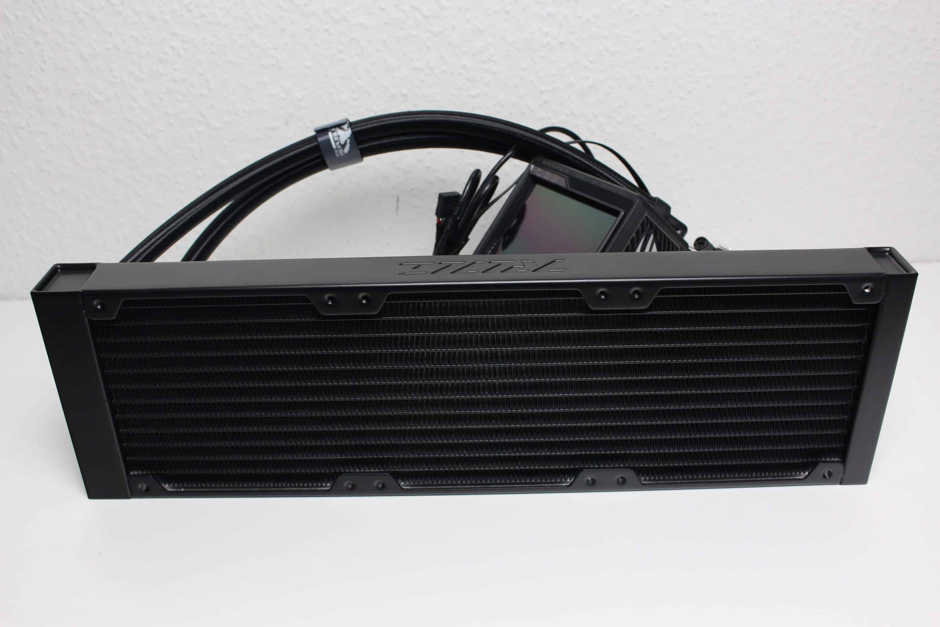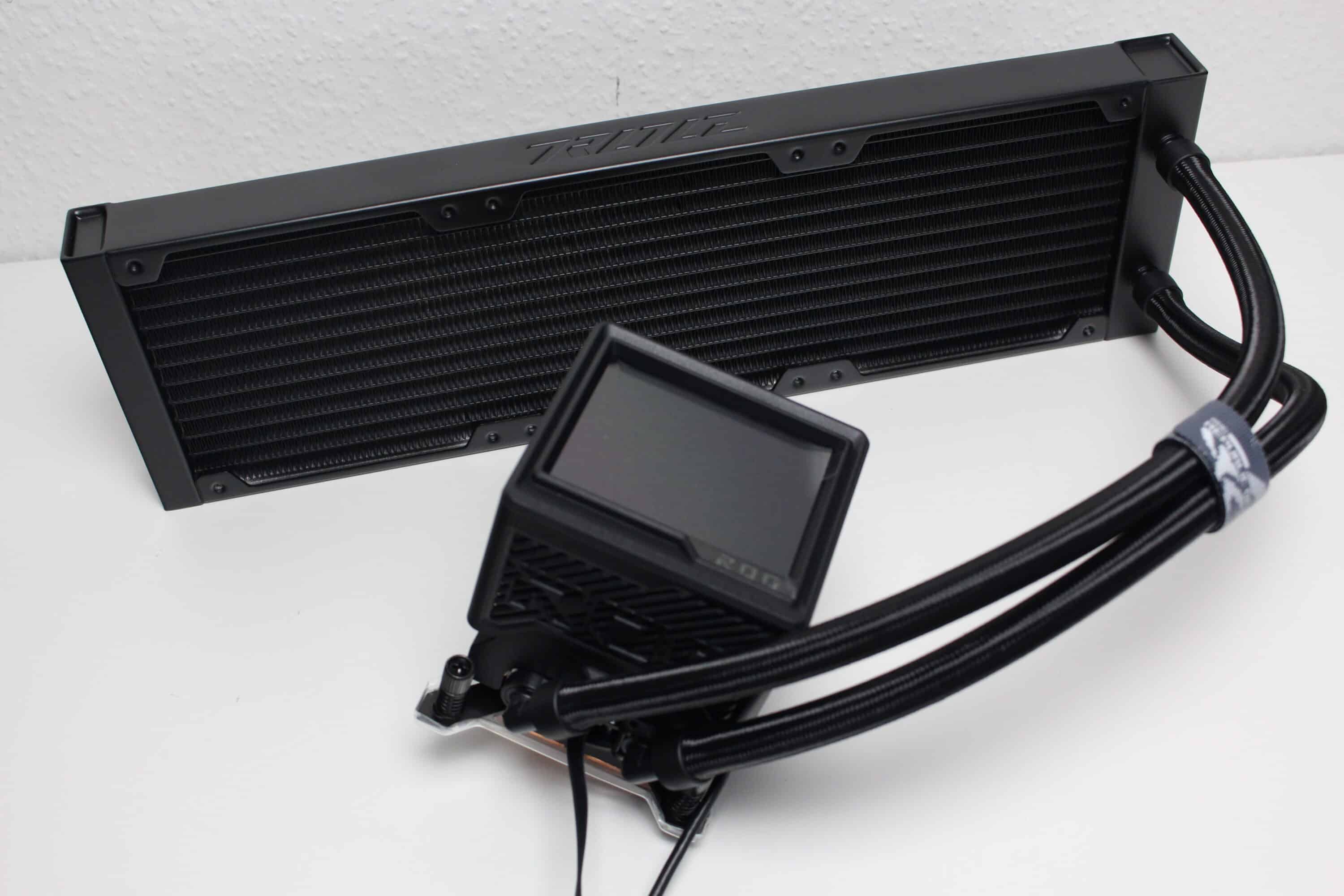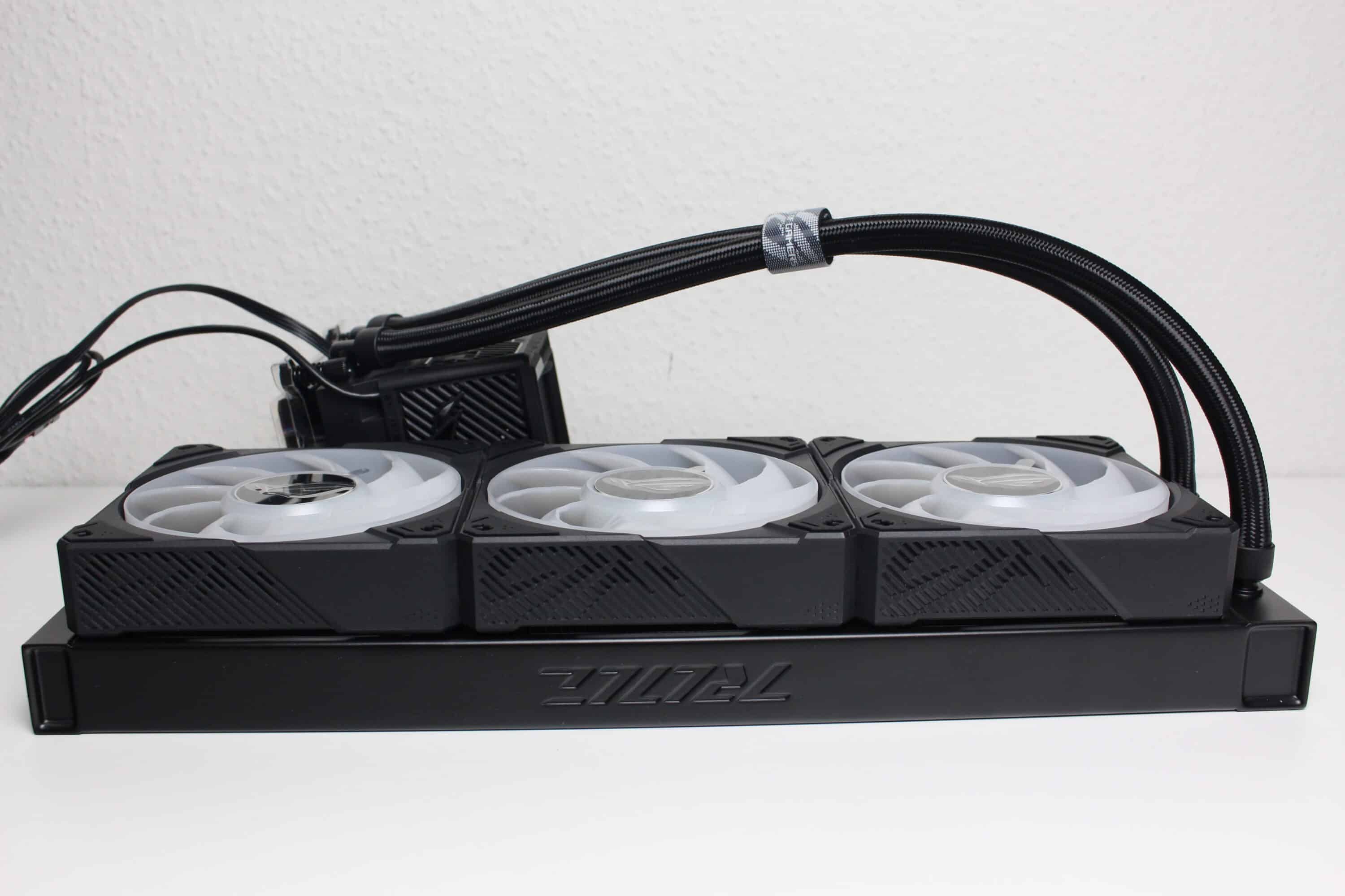 With Intel, the assembly works in a similar way. The only difference, however, is that ASUS includes a suitable backplate in the scope of delivery. The CPU block is then screwed to this backplate. Regardless of the socket, the protective caps are then removed from the radiator, the magnetic fans are plugged together and screwed to the radiator and the compact water cooling system is placed in the housing.