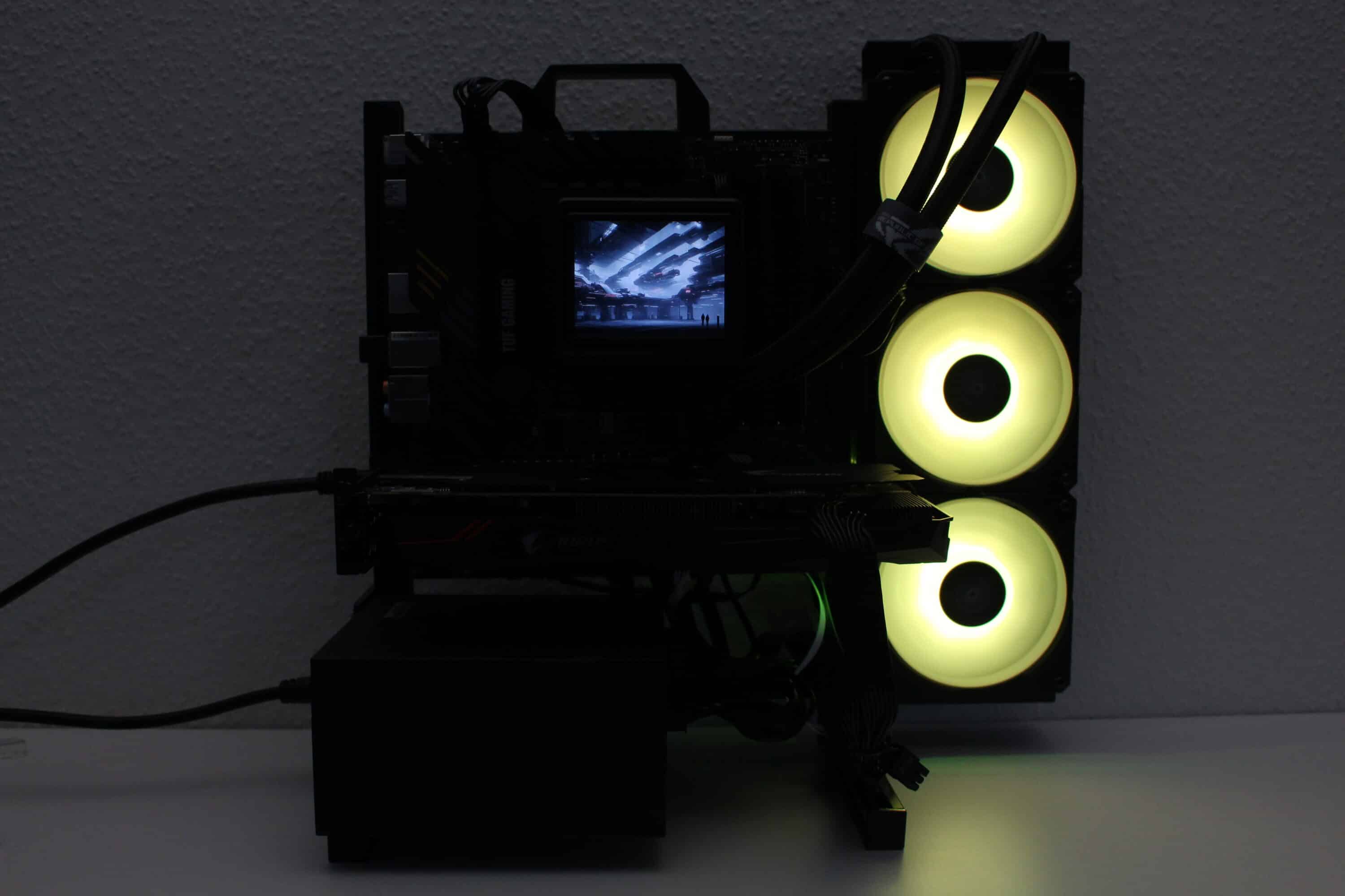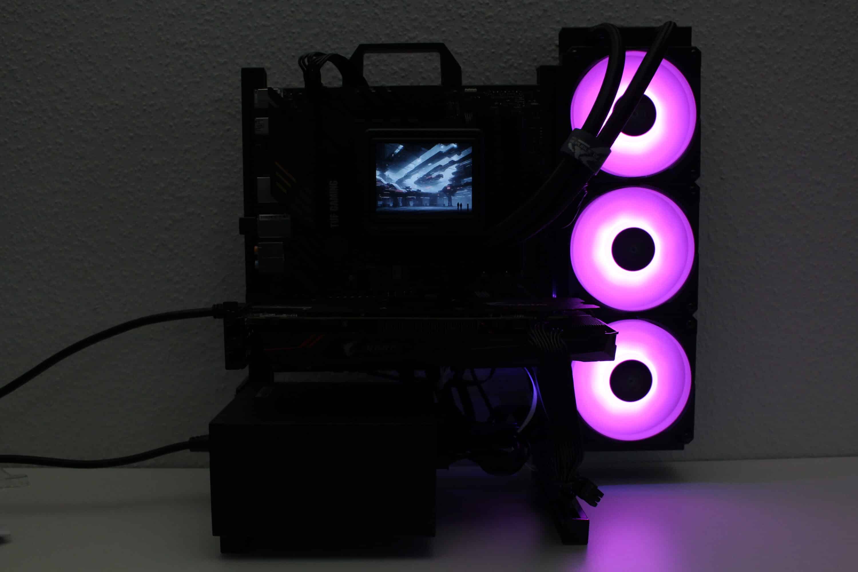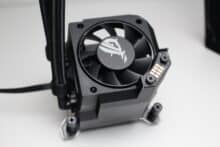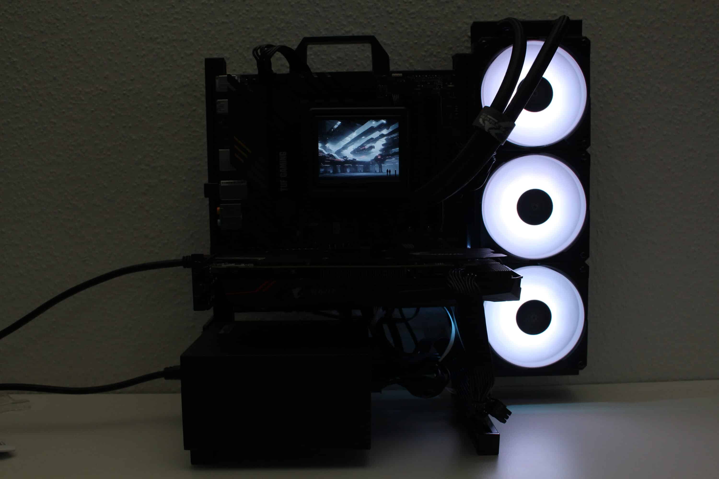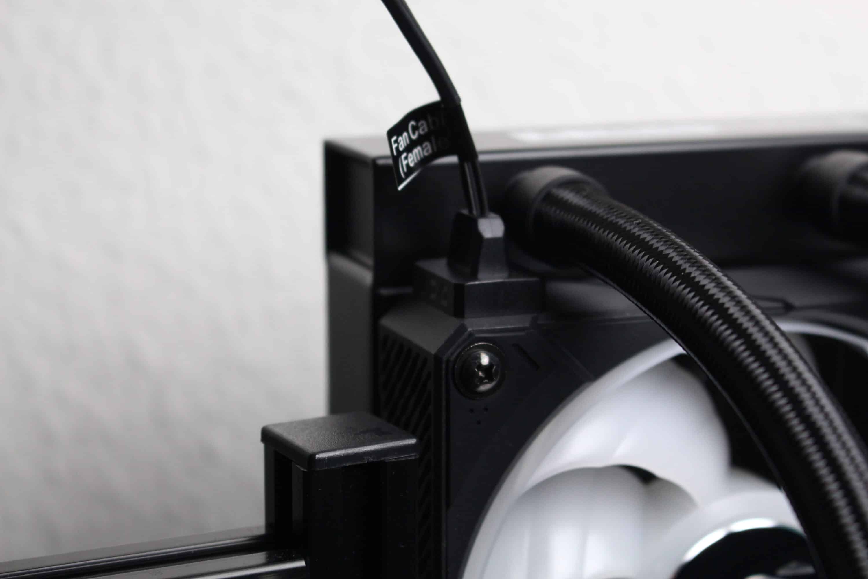 With Intel, the assembly works in a similar way. The only difference, however, is that ASUS includes a suitable backplate in the scope of delivery. The CPU block is then screwed to this backplate. Regardless of the socket, the protective caps are then removed from the radiator, the magnetic fans are plugged together and screwed to the radiator and the compact water cooling system is placed in the housing.