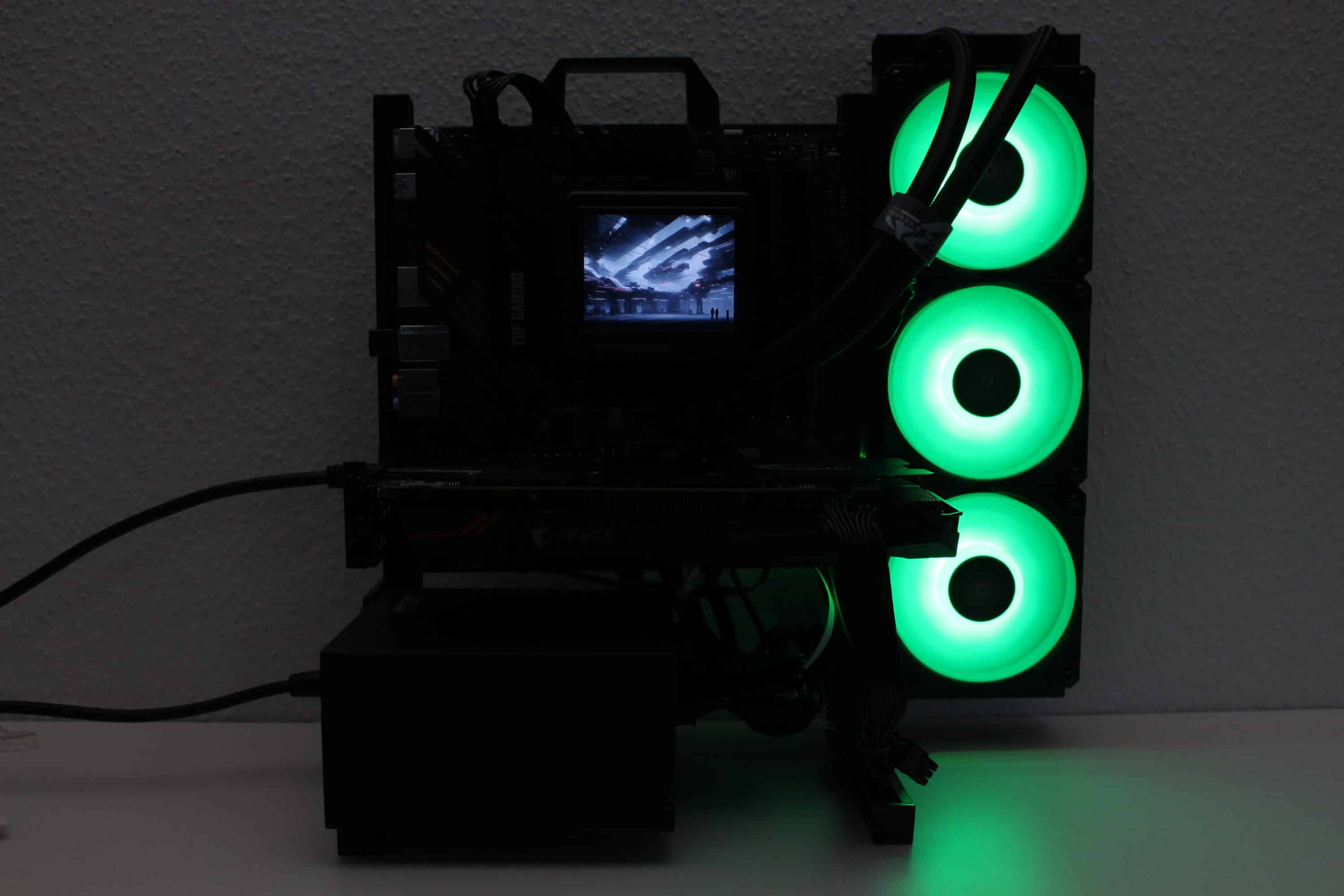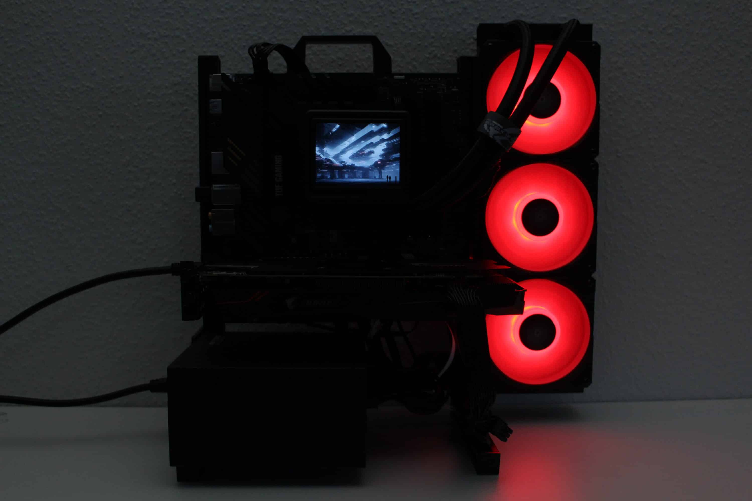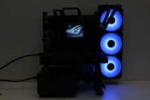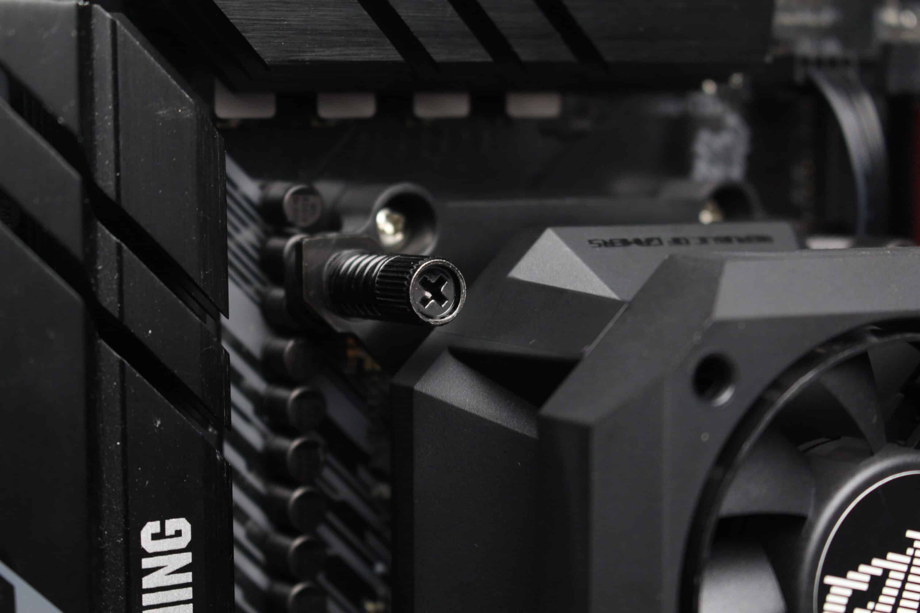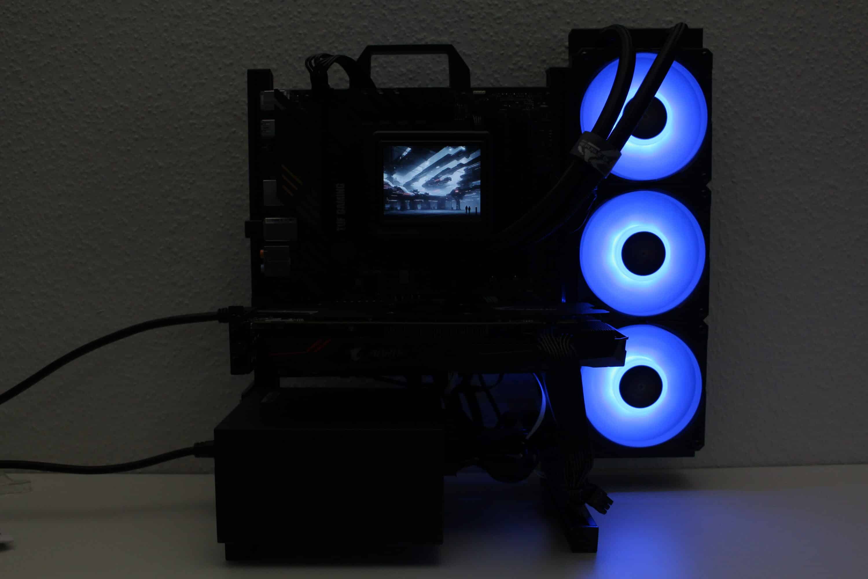With Intel, the assembly works in a similar way. The only difference, however, is that ASUS includes a suitable backplate in the scope of delivery. The CPU block is then screwed to this backplate. Regardless of the socket, the protective caps are then removed from the radiator, the magnetic fans are plugged together and screwed to the radiator and the compact water cooling system is placed in the housing.