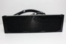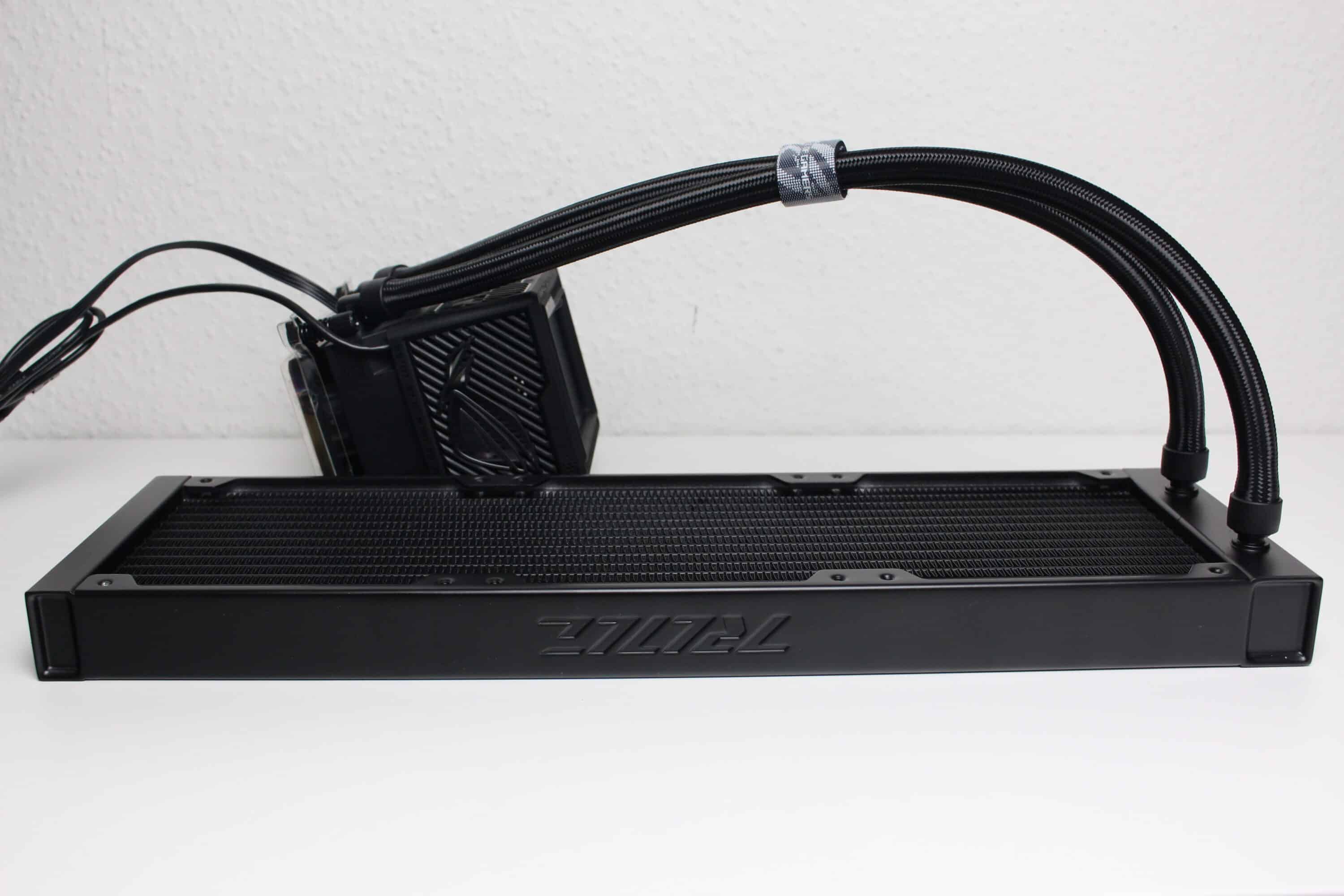The radiator of the Ryujin III 360 ARGB Extreme is made of aluminum and measures 399.5 x 120 x 30 millimeters. In terms of thickness, this is slightly above the typical standard of 27 millimeters. Visually, ASUS has kept the frame and slats in a subtle black. The embossed ROG lettering on the side adds a little pep. The radiator has no other eye-catching design elements or even lighting.