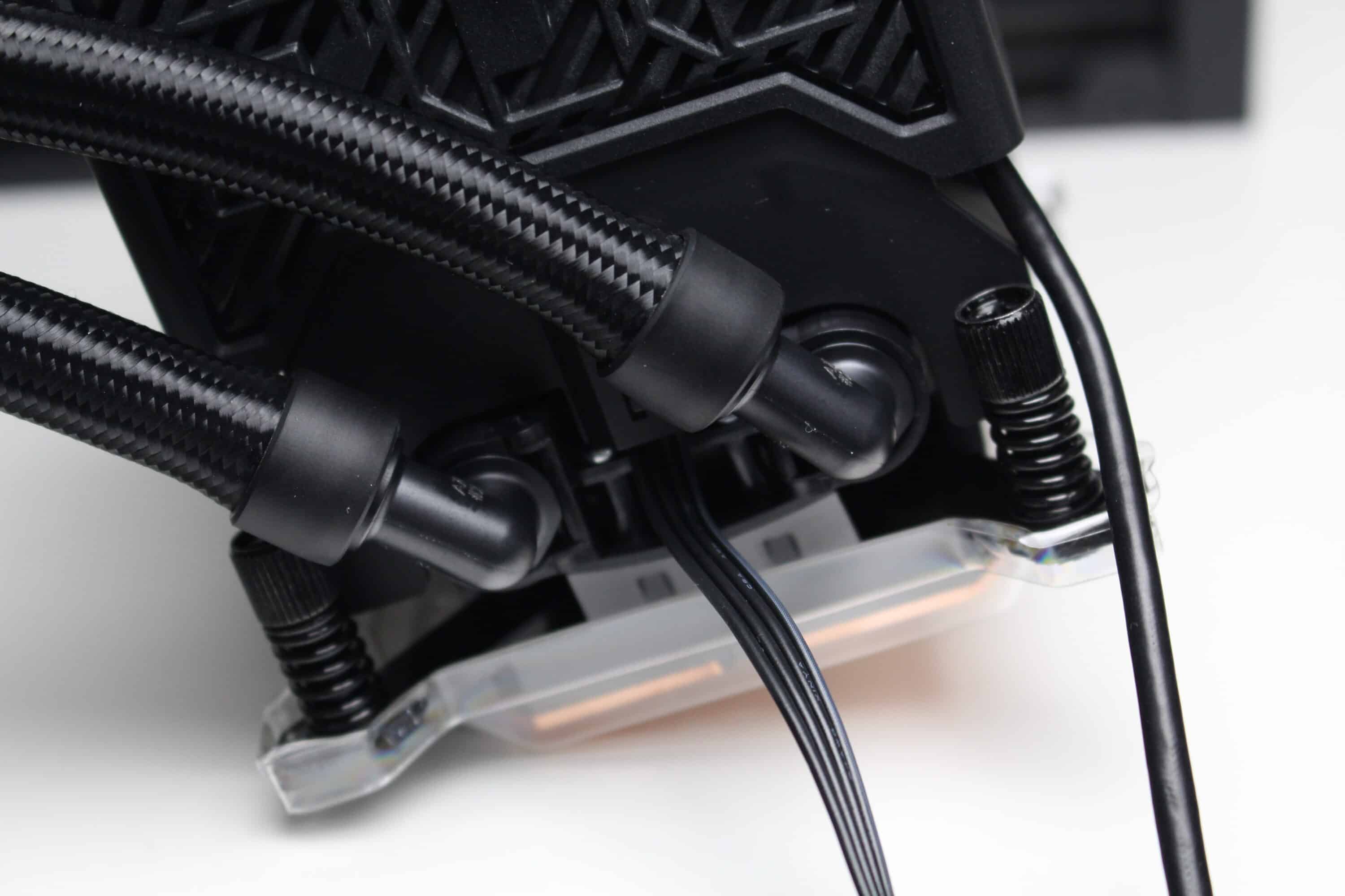 The water hoses of the compact water cooling system are 400 millimeters long and are encased in a close-meshed nylon sleeve. ASUS has attached the hoses rigidly to the radiator and pressed them into plastic sleeves. The hoses were also fixed to the CPU block using plastic sleeves. However, the manufacturer has implemented two rotatable joints here, although these cannot be swiveled very far. Considering the price and compared to some competitor products, the type of fixation unfortunately looks a little cheap.