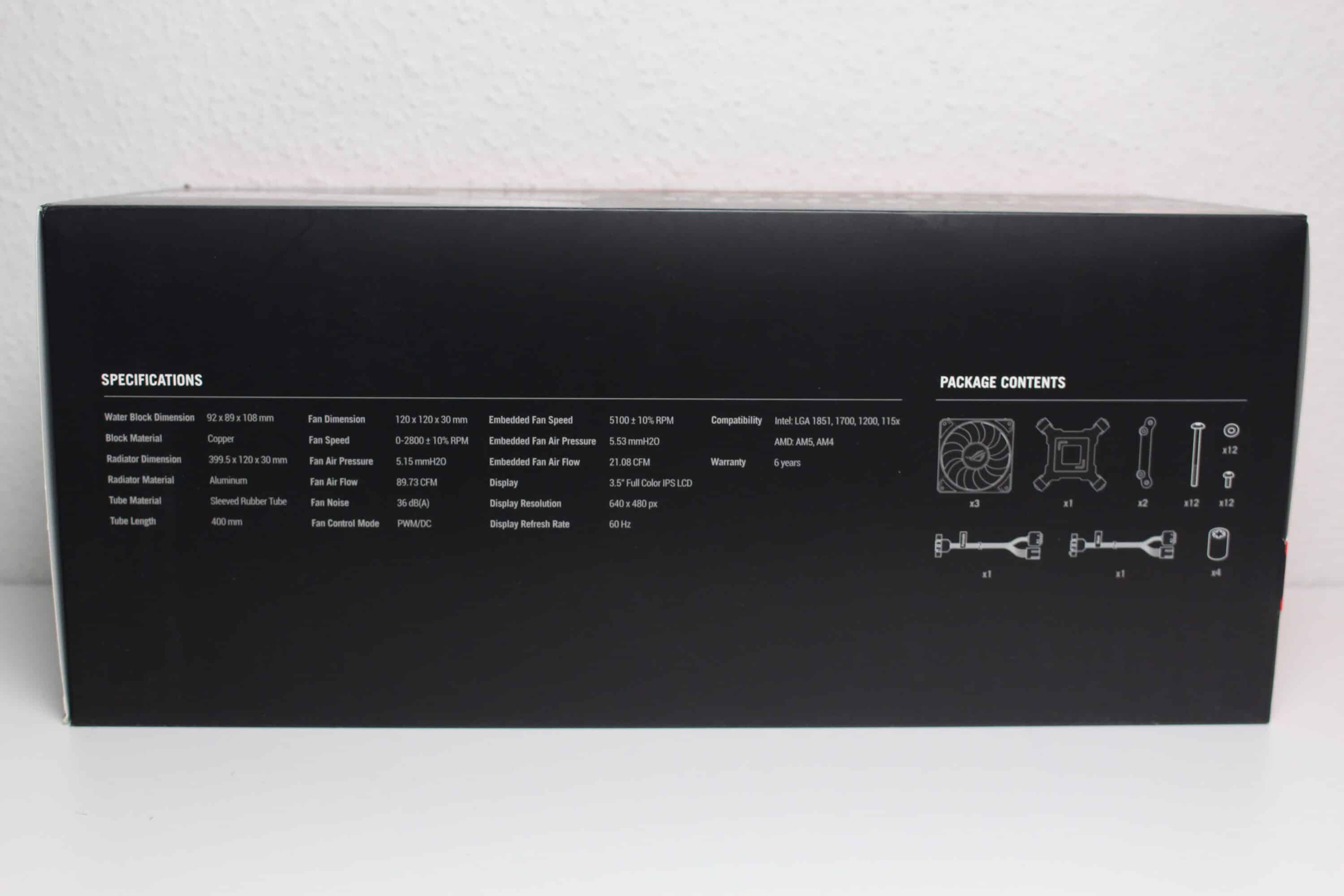 The fact that the Ryujin III 360 ARGB Extreme is a product from the ASUS ROG series is made clear by the manufacturer’s packaging design. The large cardboard box is dominated by the color black and features red accents and white lettering. In addition to a picture of the compact water cooling system, ASUS also has other product illustrations printed on the side to show the most important features. We also find a table with the technical data and a list of the packaging contents on the back.