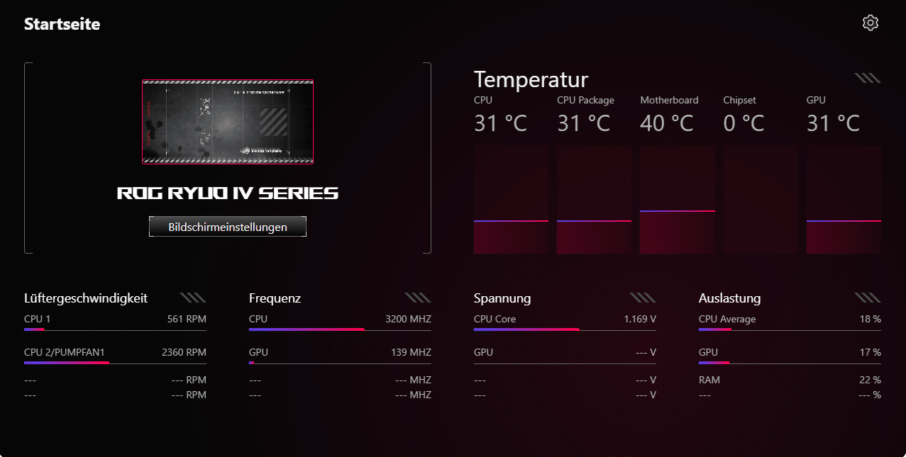 As with the ASUS ROG Ryujin III 360 ARGB Extreme, the ASUS ROG Ryuo IV SLC 360 ARGB can also be very loud but also very quiet. Although the pump is audible at full speed, it might not be so noticeable in the general background noise of other components. The fans, on the other hand, are absurdly loud and more than annoying when they rotate higher than 1800 rpm. Fortunately, the cooling performance is still very good even at greatly reduced speeds, so you only have to optimize the curves manually in the BIOS.