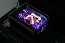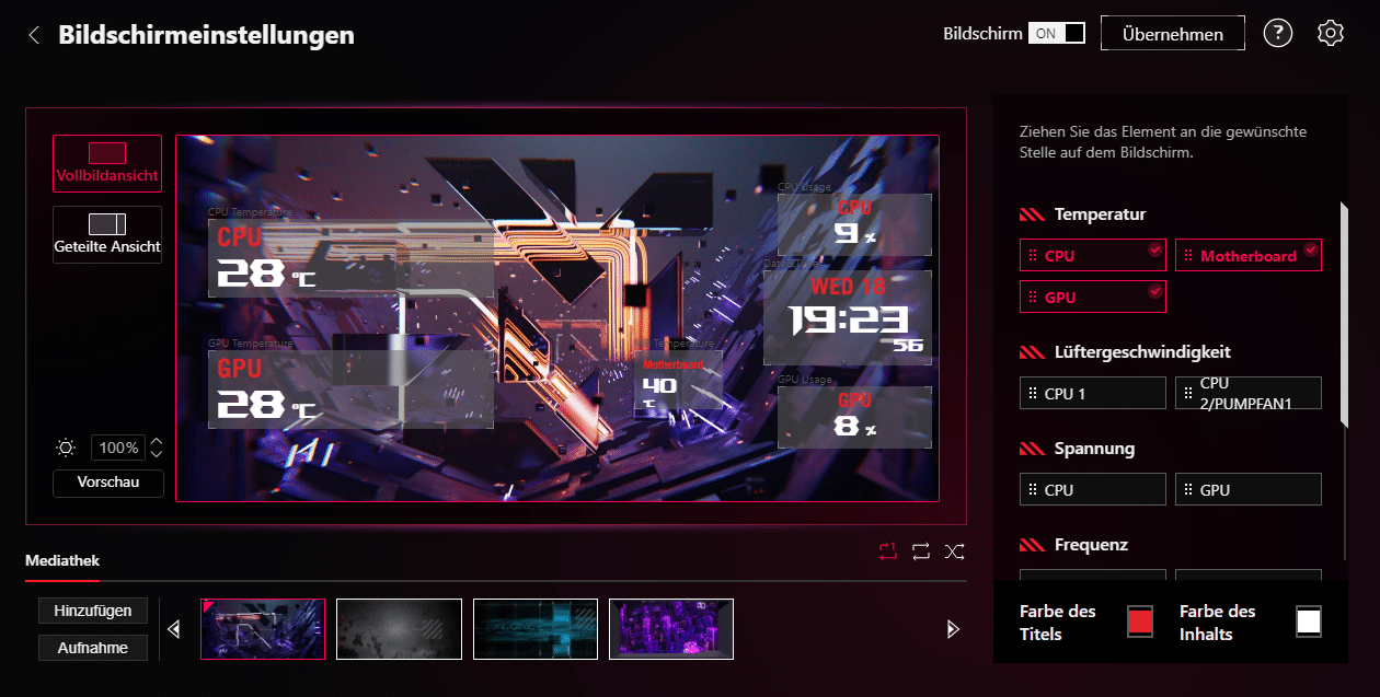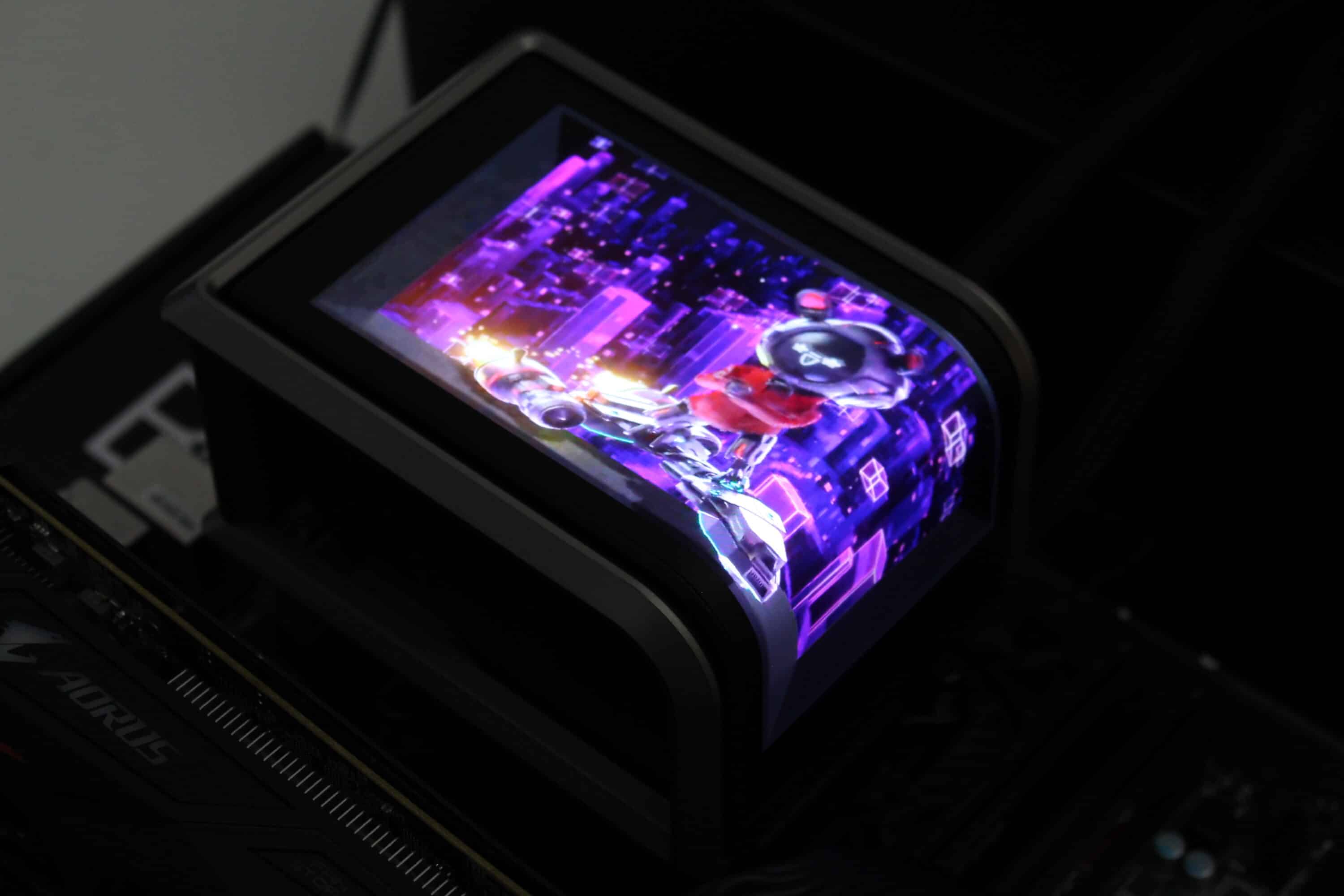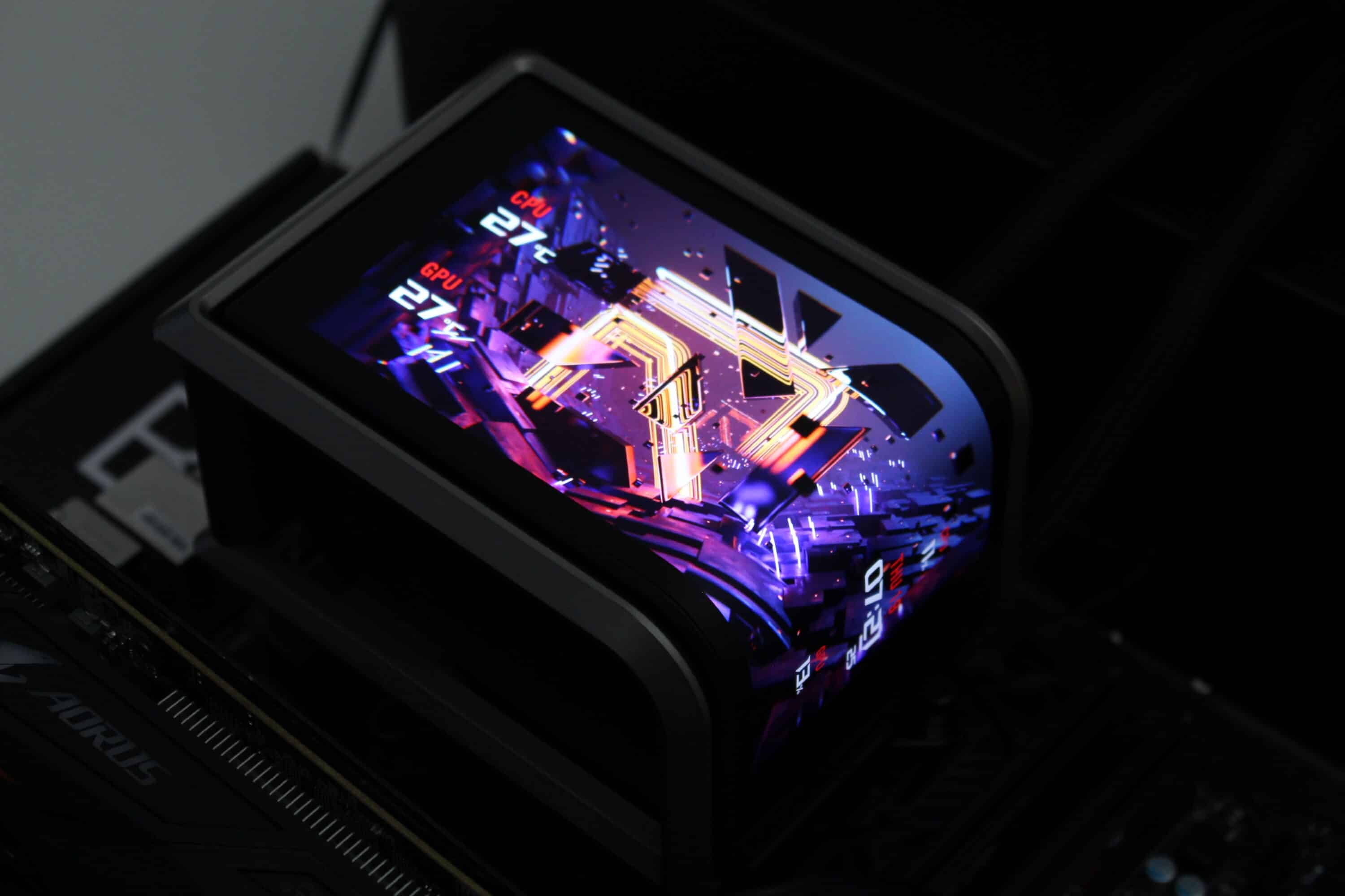 One feature that ASUS is particularly keen to promote in the ROG Ryuo IV SLC 360 ARGB, however, is the curved 6.67″ 2K AMOLED display with a refresh rate of 60 Hz, which is attached above the pump using a magnet. The display is connected via an internal USB 2.0 header and therefore offers very individual personalization options. These include the animated display of hardware information, the time or the display of customized GIF animations or static images. However, the display must be configured using the ASUS Info Hub software.