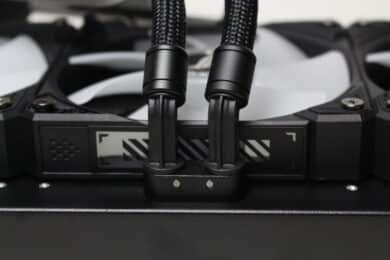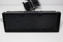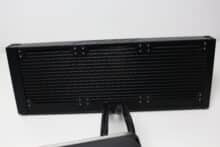 The radiator of the ASUS ROG Ryuo IV SLC 360 ARGB is made of aluminum and measures 394 x 140 x 32 millimeters. This puts it well above the standard for typical 360 mm radiators in terms of width and thickness. Visually, ASUS has kept the frame and fins in a subtle black. However, the embossed ROG lettering on the side adds a little pep. It is also noticeable that the radiator has 24 mounting points for fans on each side. This means that the three 120 mm fans can be mounted in two different positions if required.