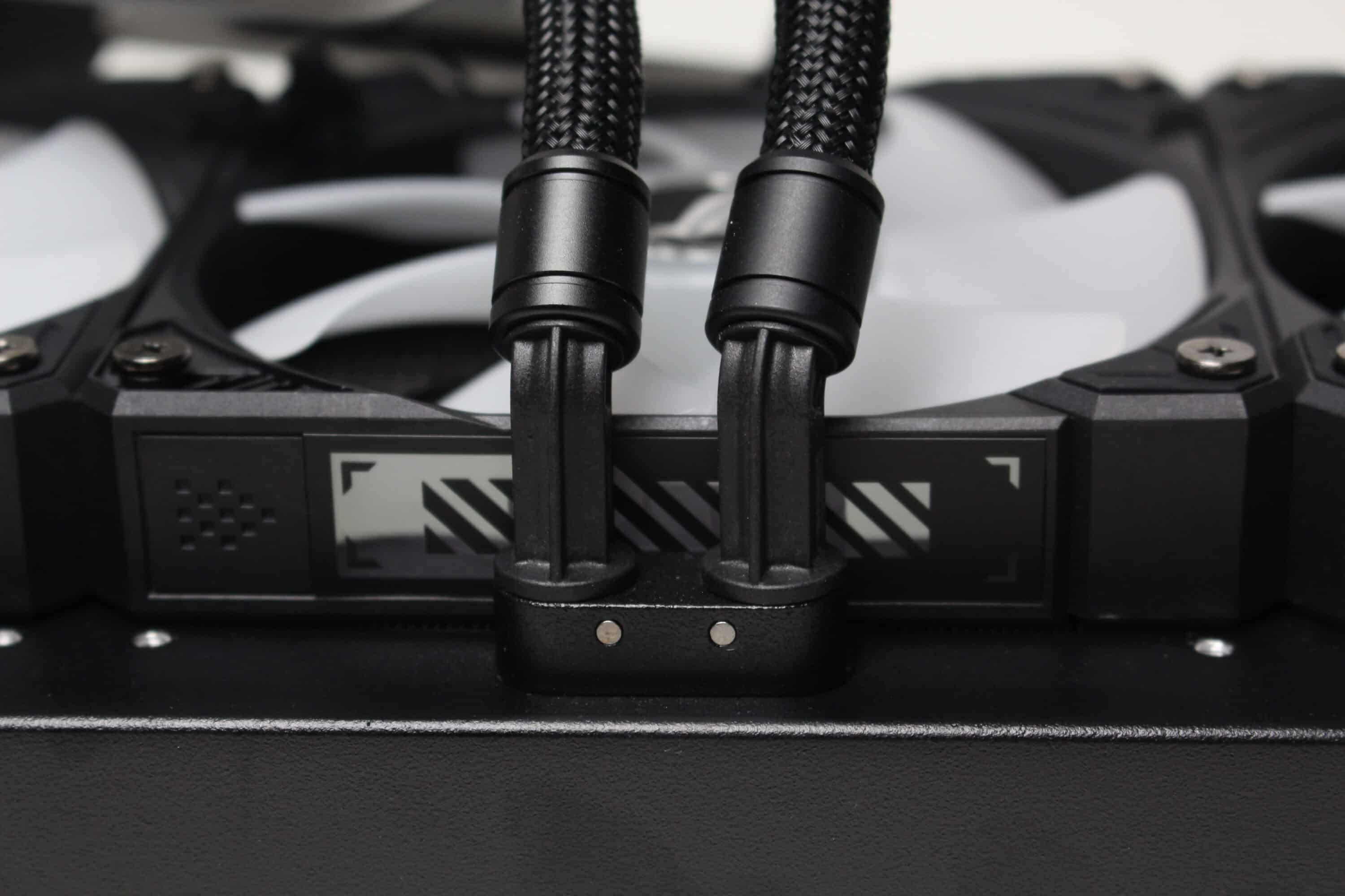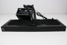 To keep the visible hose as short as possible, ASUS places the connections for the hoses on the long side of the radiator that faces the motherboard tray. They are pressed into movable plastic joints, which unfortunately look a little cheap. In addition, the hoses are only 200 millimeters long, which means that this compact water cooling system can only be installed in the lid of a case. This makes everything look much tidier when installed, but of course significantly limits the compatibility and choice of housing.