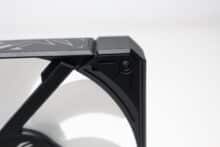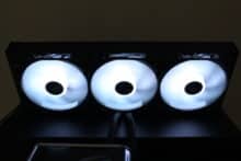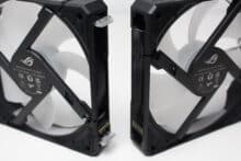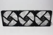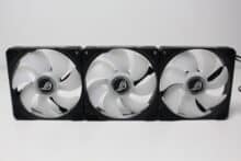 The three included ROG RYUO IV MF-12C ARGB fans have a frame width of 120 millimeters and are 27 millimeters deep. The frame is black and the rotor has a milky white design. The latter consists of seven fan blades and eight ARGB LEDs in the fan hub. All three fans are plugged together at the factory to form a single unit, but can be disassembled if required. Due to the integrated contacts, all three fans are connected via just one 4-pin PWM and one 3-pin 5V ARGB connector.
