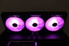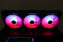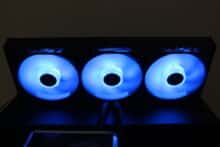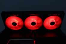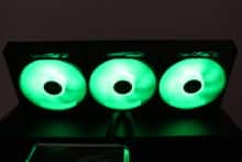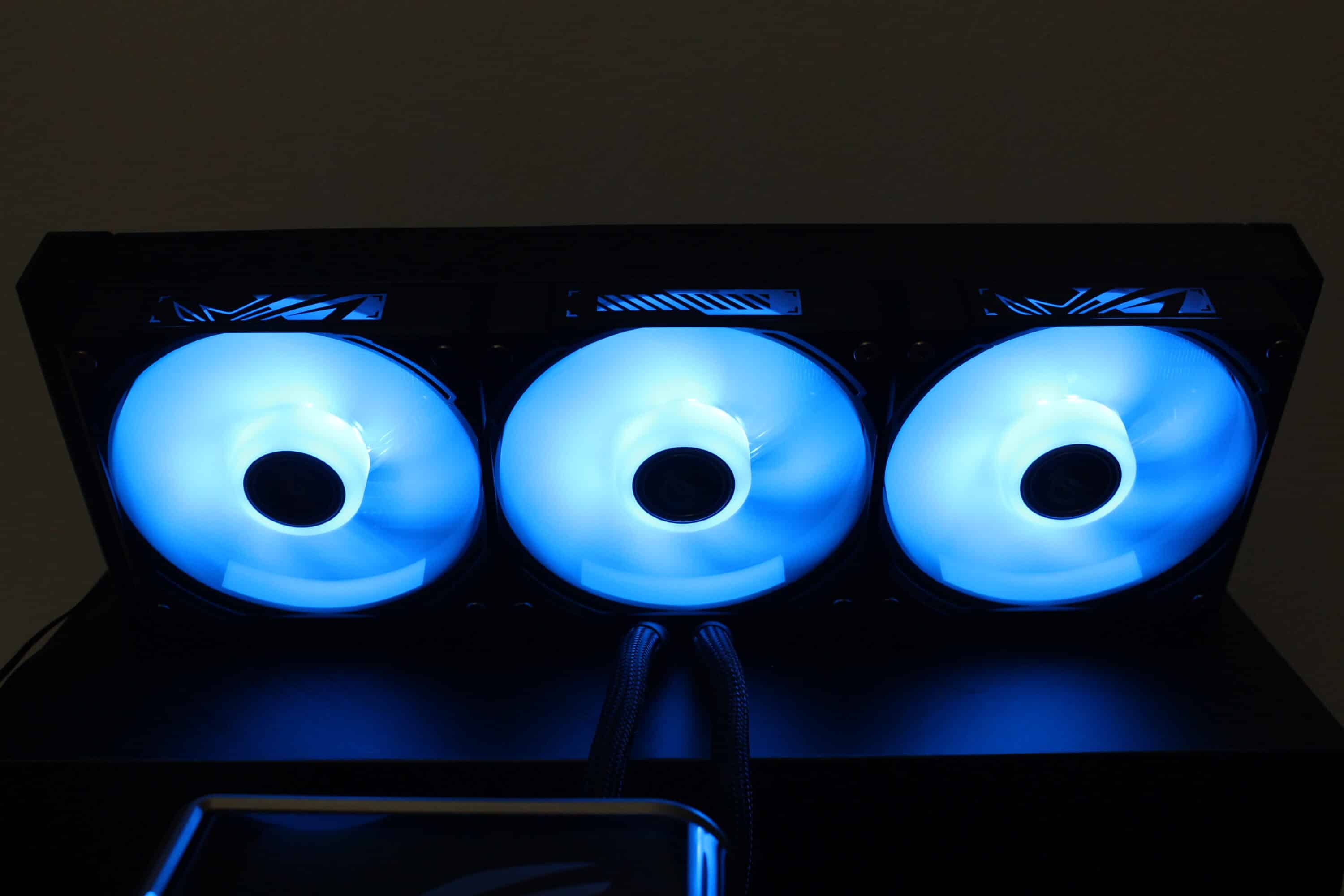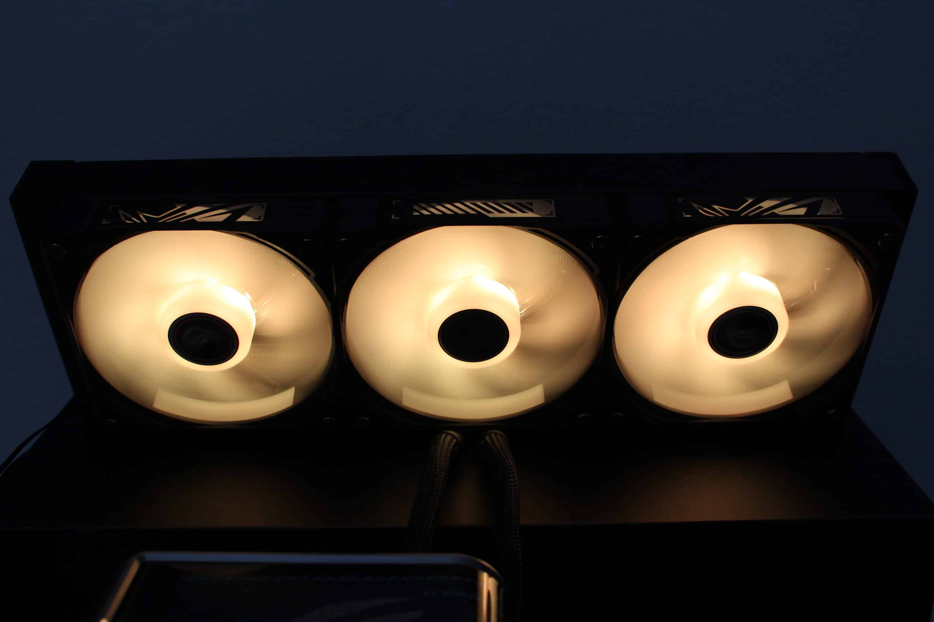 The three fans on the radiator of the ASUS ROG Ryuo IV SLC 360 ARGB provide attractive lighting. ASUS has placed eight ARGB LEDs in each fan hub, which can be controlled via a 3-pin 5V connection. The milky-white fan blades distribute the light evenly across the rotor. The lighting can be controlled both via ASUS Armoury Crate and via the OpenRGB software.