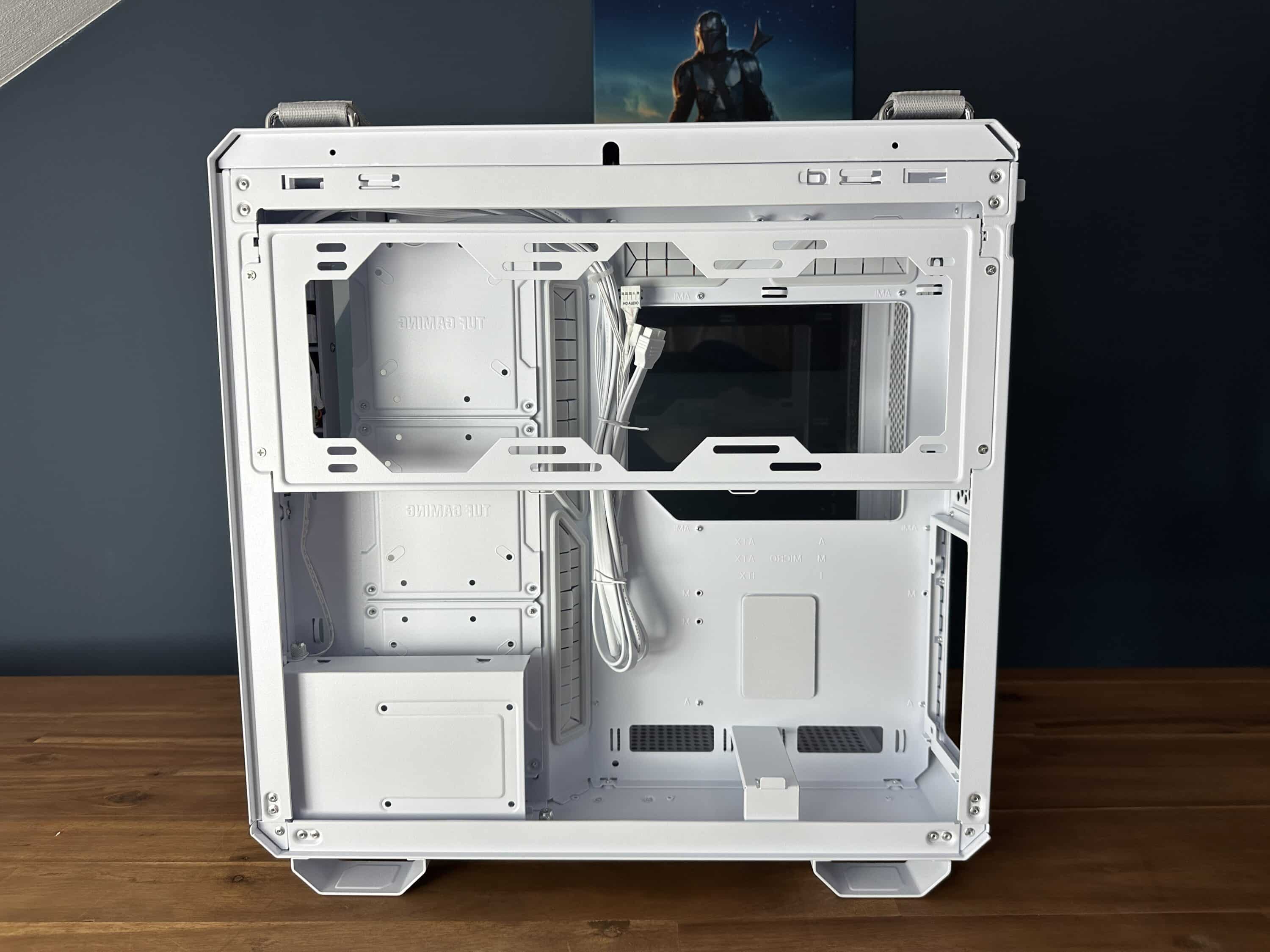 The rear chamber of the TUF Gaming GT502 Horizon also leaves a neatly structured and well thought-out impression. ASUS consistently relies on modularity and flexibility here – particularly visible in the arrangement of the drive bays. Users can decide whether they want to use the available space for hard disks or fans. The corresponding brackets can be individually adjusted or completely removed as required – this accommodates both classic build concepts and modern, minimalist cooled systems.