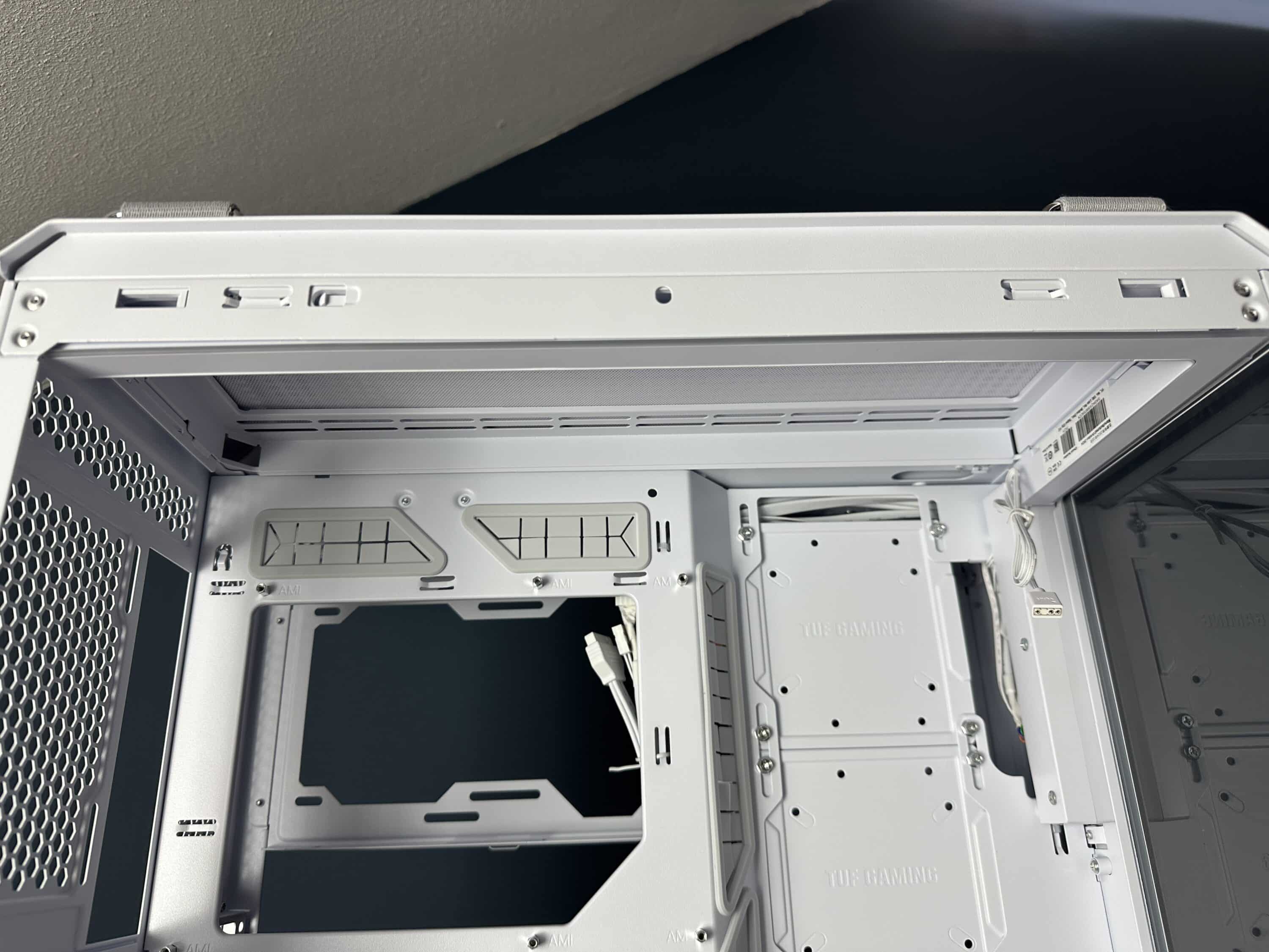 A look inside the TUF Gaming GT502 Horizon quickly shows that ASUS is not just focusing on the exterior – the interior also makes it clear how well thought-out this case has been designed. The main chamber in particular impresses with its very clear structure and generous amount of space. Even larger components such as high-end graphics cards or powerful tower coolers can easily find their place without creating cramped conditions.