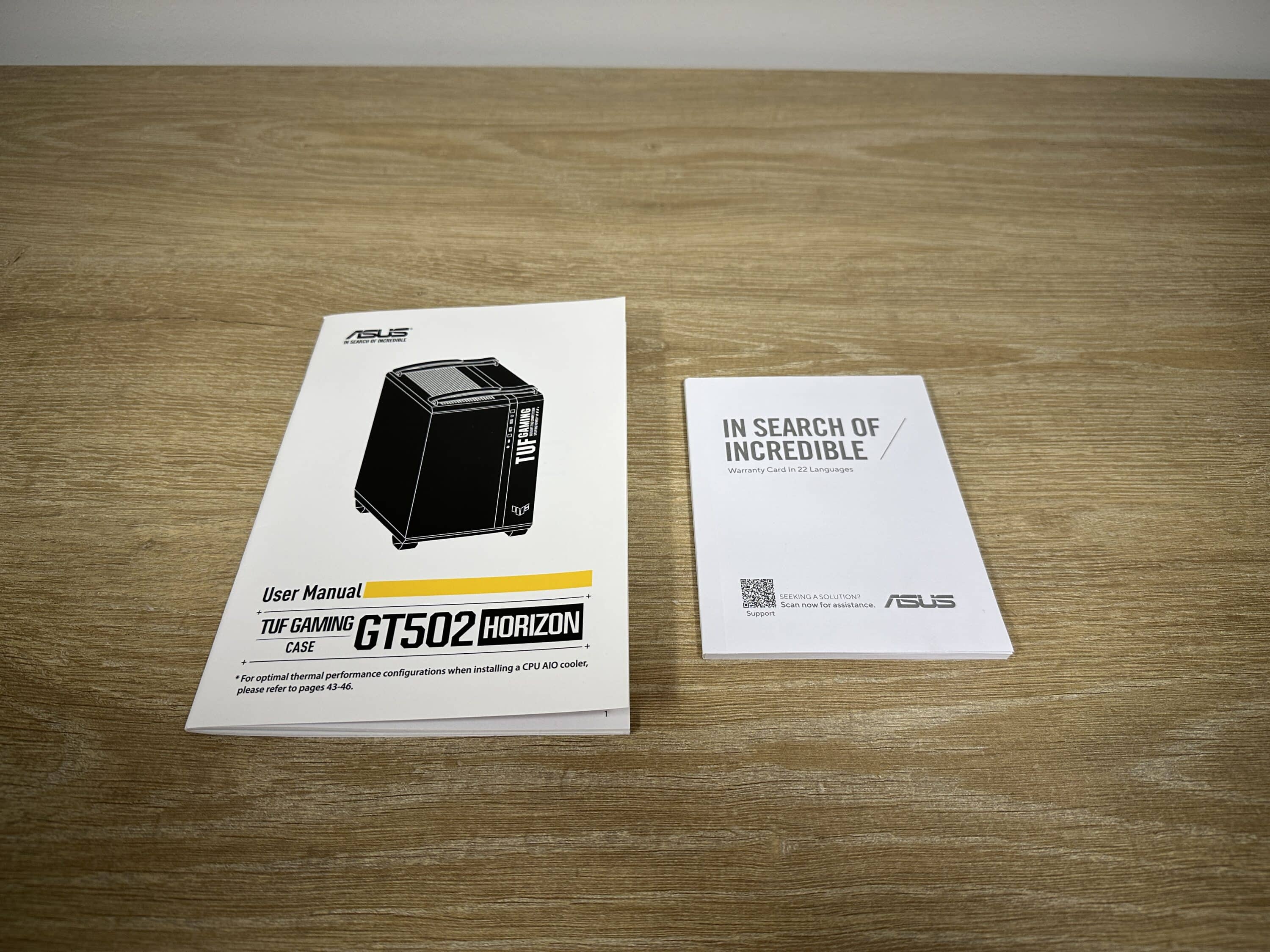 The scope of delivery of the ASUS TUF Gaming GT502 Horizon shows right out of the box that ASUS places great value on user-friendliness and flexibility. The case comes with a comprehensive accessory package that contains all the basic components and tools you need to start building a clean and powerful gaming system right away.