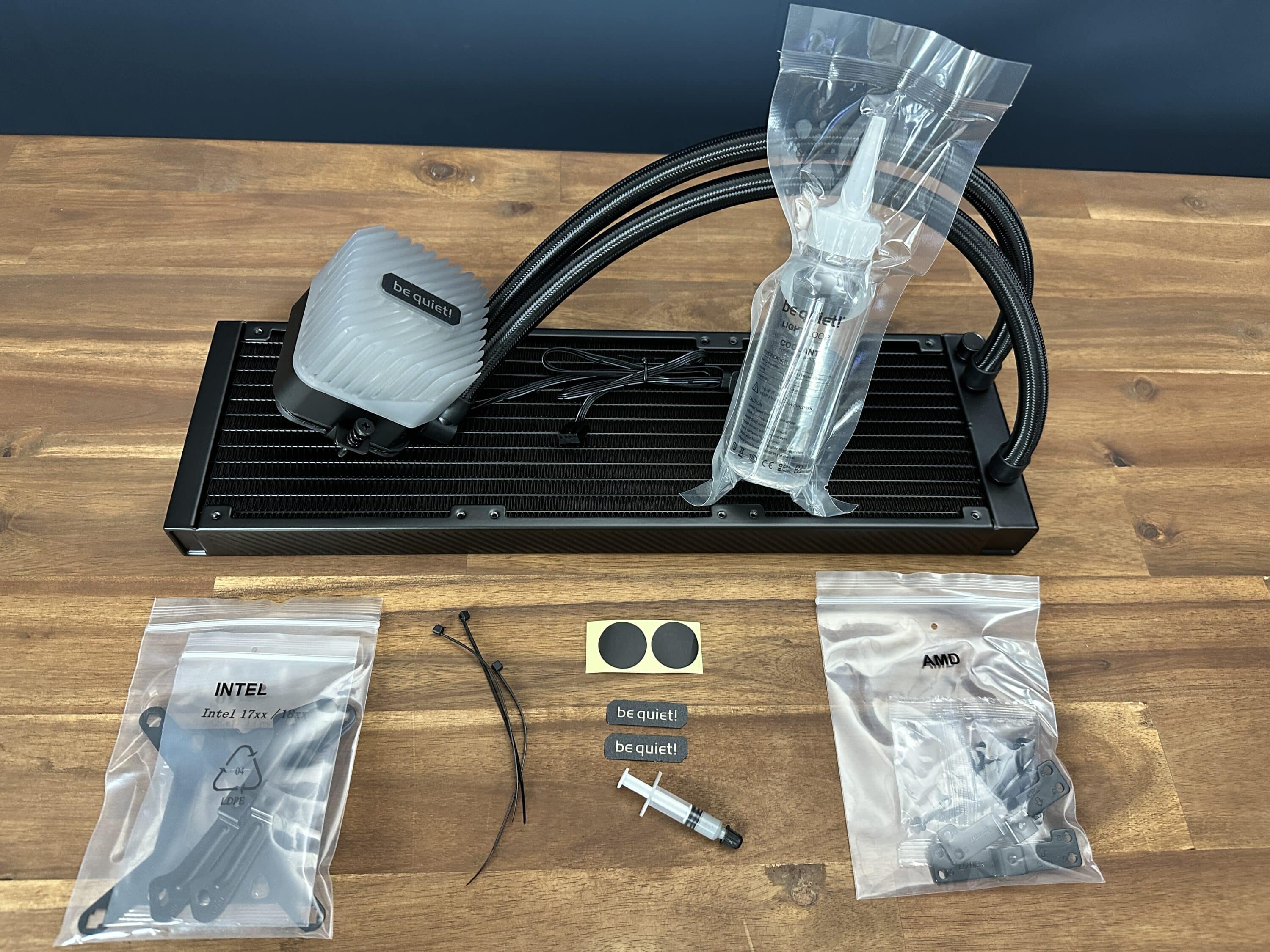 The be quiet! Light Loop 360 reaches us in well-protected packaging that keeps all components safely stowed away. In addition to the 360 mm radiator, which is already firmly connected to the hoses and pump, the package contains three 120 mm Light Wings fans, which are designed to provide effective cooling. The package also includes all screws, brackets and mounting materials to easily install the AiO cooling system on both Intel and AMD sockets. An illustrated and easy-to-understand installation guide makes installation easier, while a small tube of thermal paste is sufficient for the initial installation. The accessories are rounded off with a refill ration of coolant and an RGB PWM hub, which optimizes fan control and at the same time enables tidy cable routing in the case.