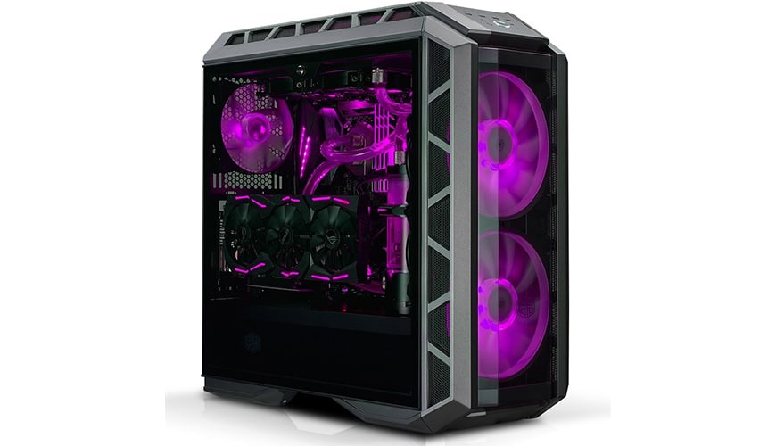 The MasterCase H500P Midi-Tower by Cooler Master with its hard glass side panel and the two large fans illuminated with RGB LEDs is very trendy. The case is large, spacious, modular and offers a design that is both futuristic and archaic. One of the special features of the tower is the possibility to install the graphics card vertically. Thus, the often impressive cooler design of the pixel accelerator can be displayed.
