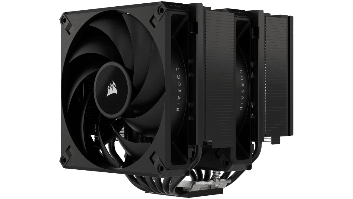 Alongside the A50, A70 (both 2010) and the A500 (2020), the A115 is only Corsair’s fourth new development in the air cooler segment. Corsair describes the A115’s features as high cooling performance, which is achieved by 90 black nickel-plated aluminum fins as a double tower, six 6 mm heapipes and the two CORSAIR AF140 ELITE fans. Added to this are factory-applied thermal paste and a simple mounting system to make installation as easy as possible