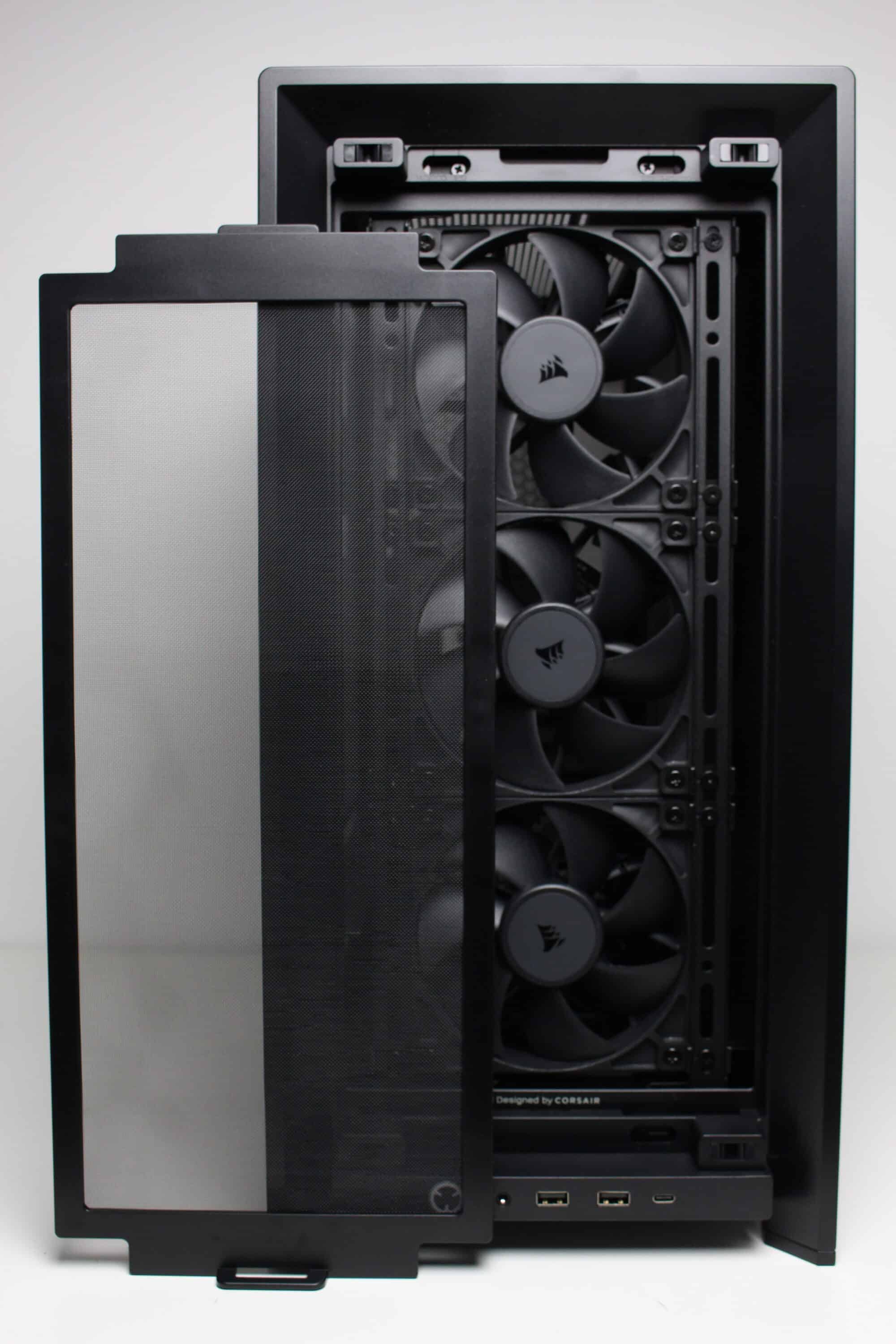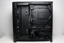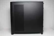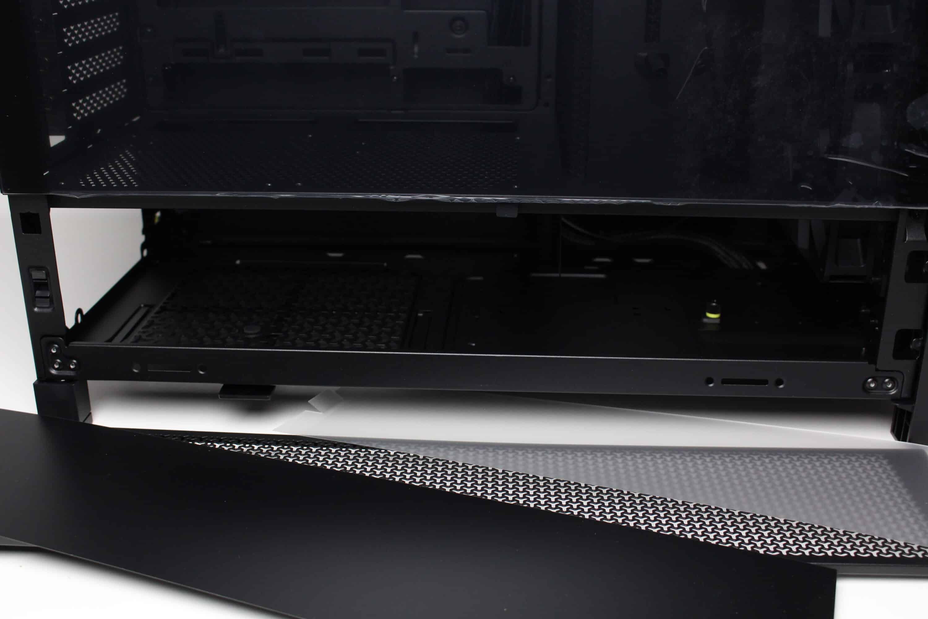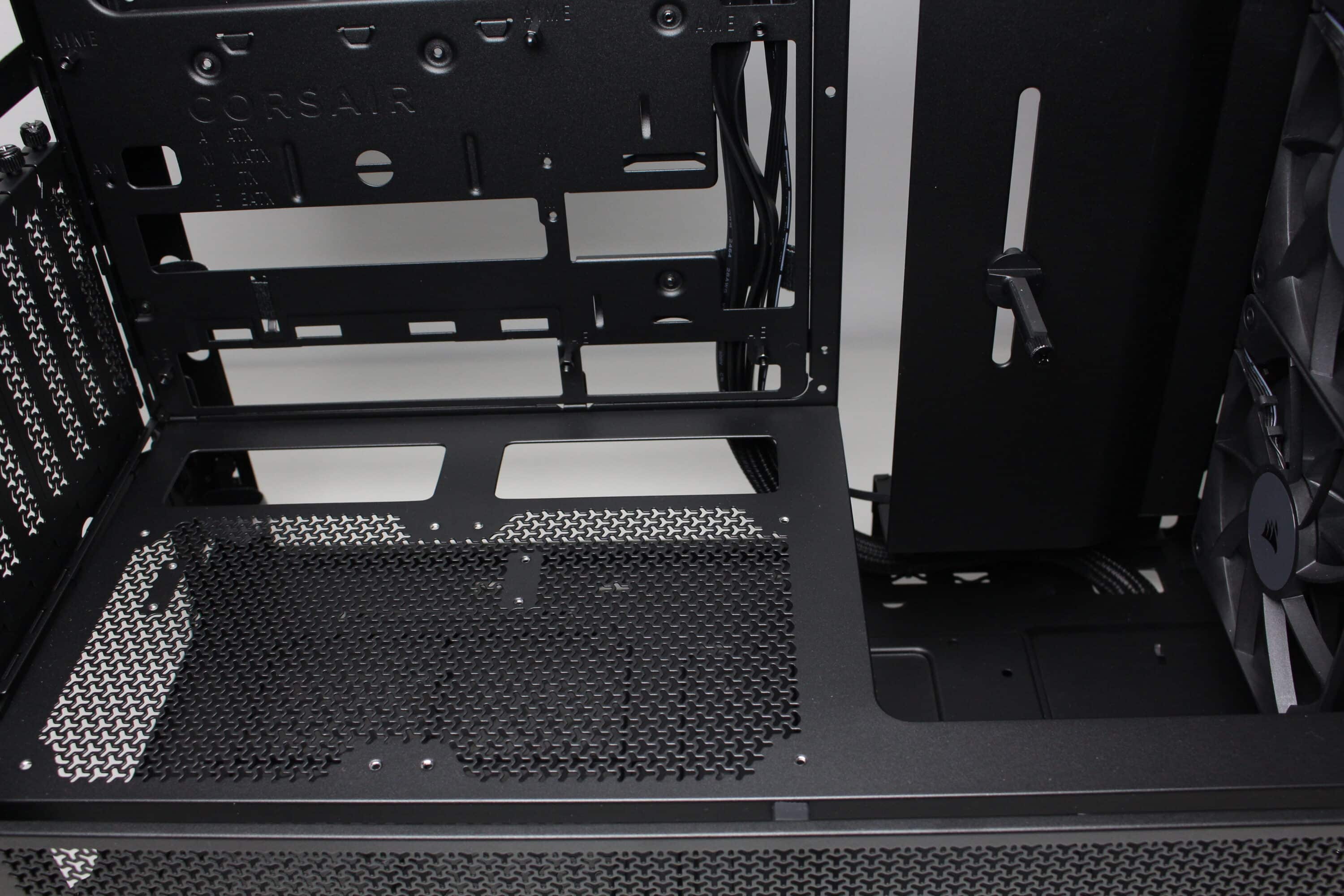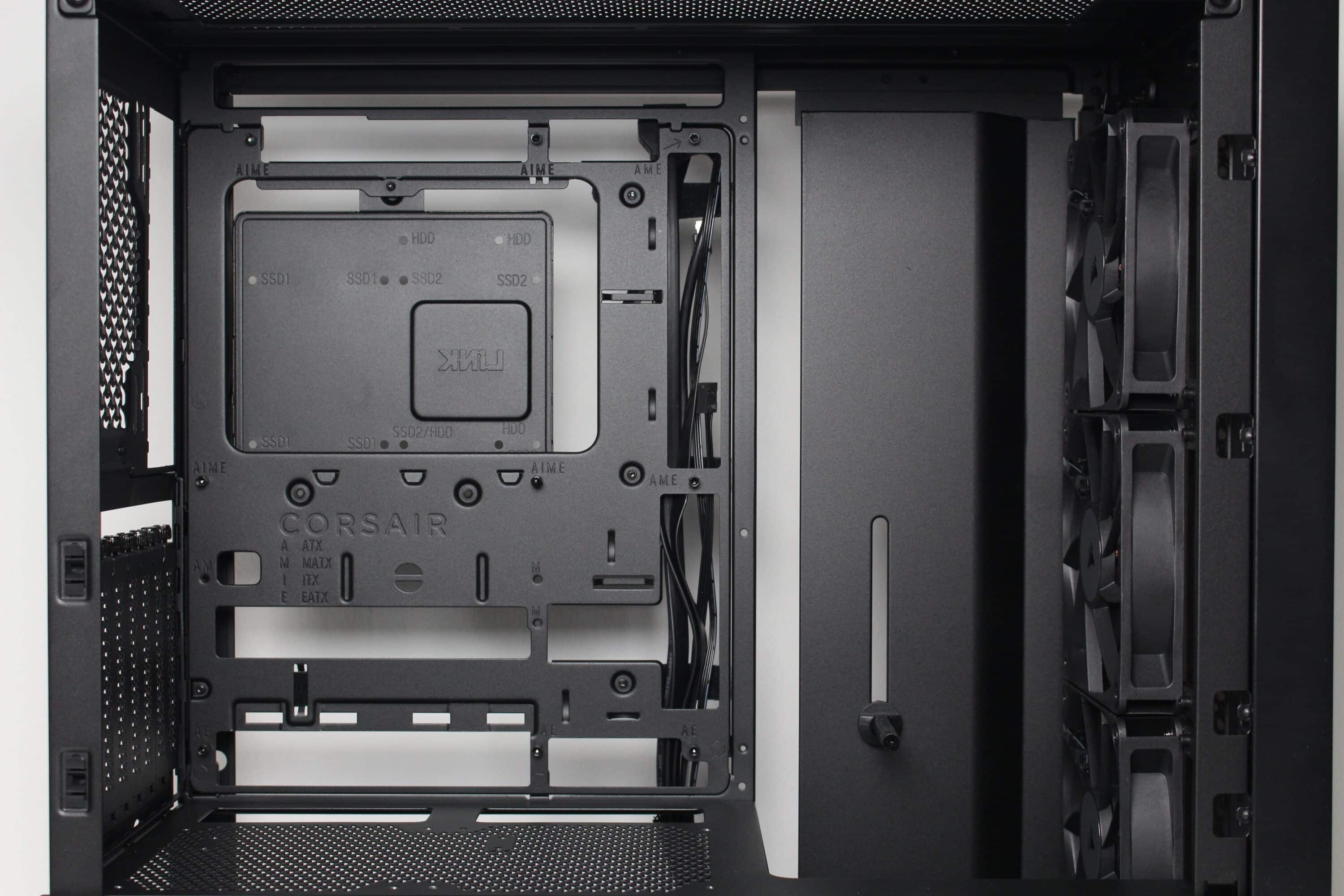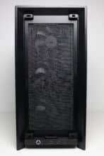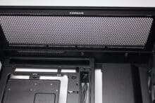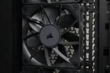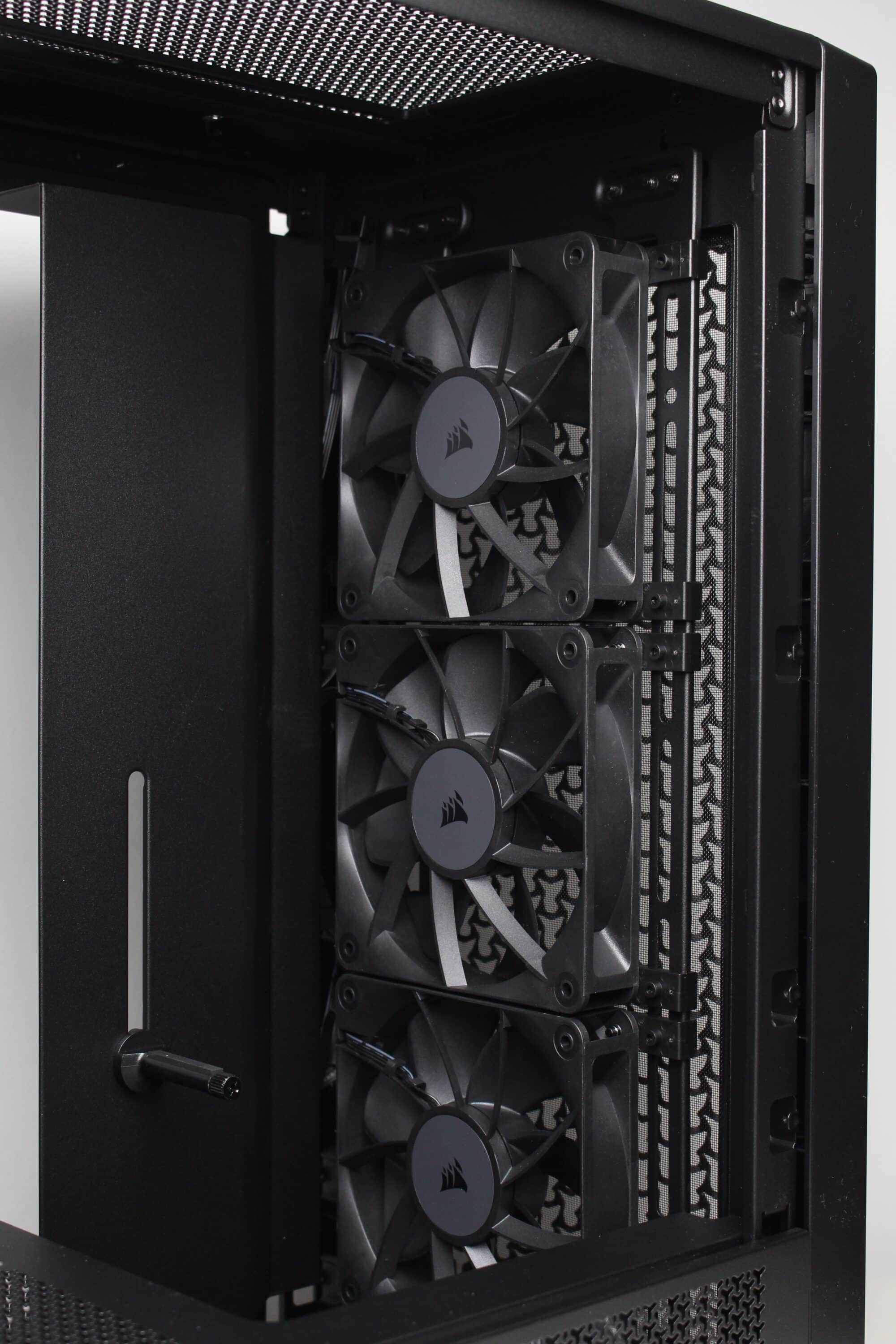 There are no obstacles directly behind the pre-installed front fans that could impair the airflow. Corsair has also placed a cover with a built-in GPU holder on the side behind the fans. Depending on whether fans are to be installed at the front or to the right of the motherboard tray, the side cover can also be removed if necessary and the additional fan frame from the scope of delivery can be installed instead.