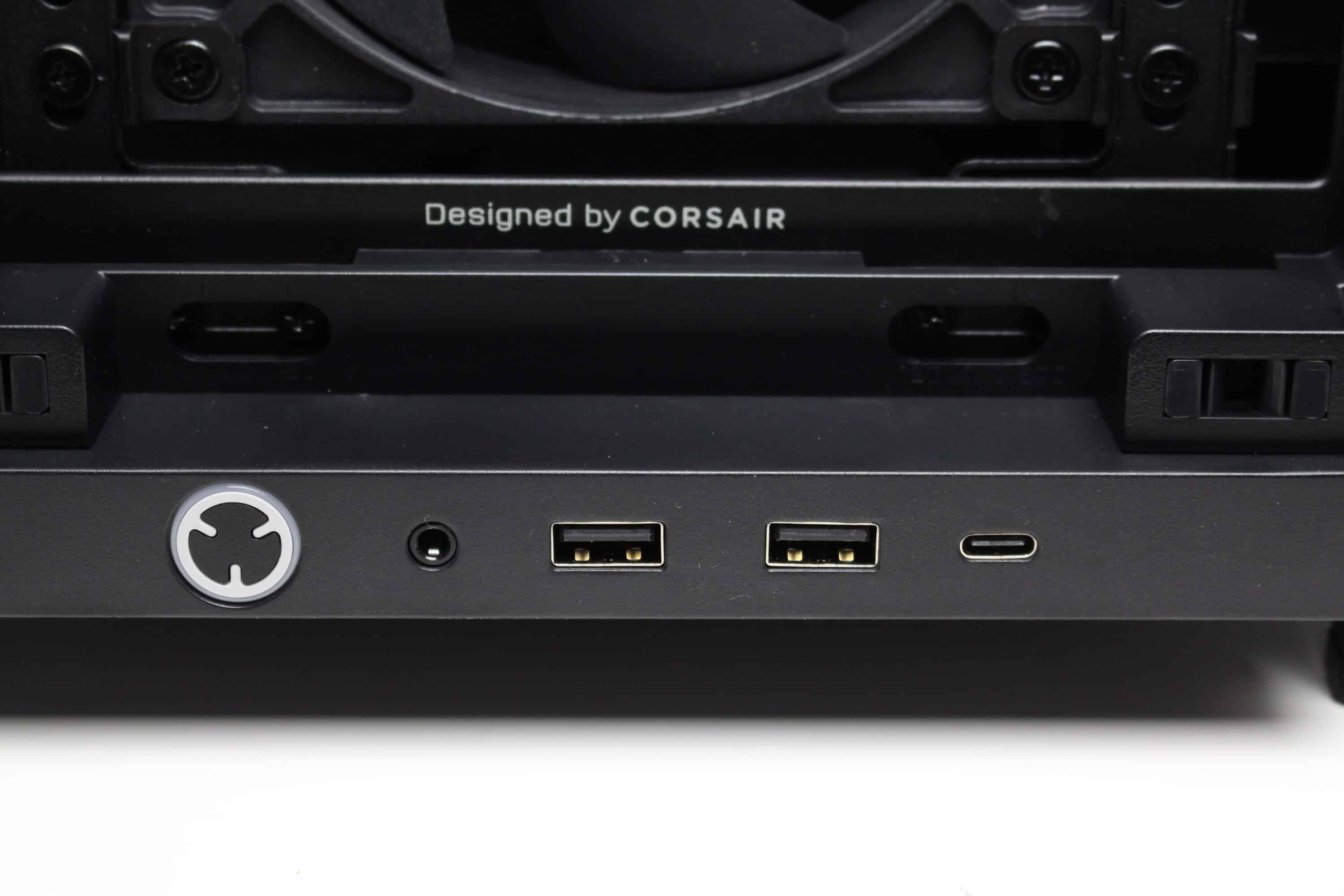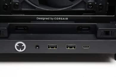 The I/O panel can also be seen in the lower area of the front. This is equipped with a white backlit power button, three USB ports (2x USB-A 3.2 Gen 1, 1x USB-C 3.2 Gen 2) and a 3.5mm jack socket. Unfortunately, Corsair does not offer an alternative mounting position despite the high modularity of the Frame 4000D RS. If you don’t want to place the midi tower on a table, the position is somewhat unfavorable.