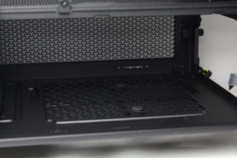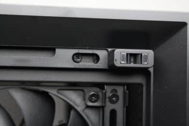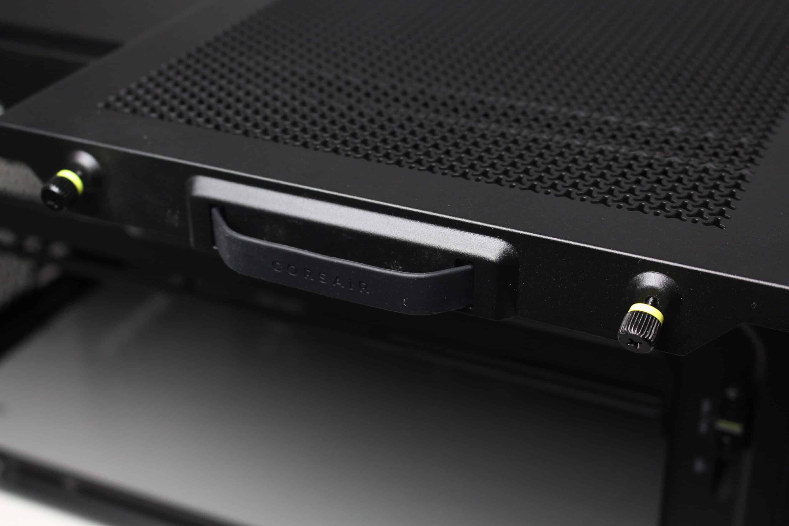 The lid of the midi tower is both airy and modular. A steel ventilation grille spans the entire top and has generously dimensioned openings in the shape of the letter “Y”, under which Corsair has not placed an additional dust filter. Using two knurled screws and a rubber handle, the panel can be pulled off to the rear, revealing two mounting rails for up to three 120 mm or two 140 mm fans. The Infinirail system is also used here, allowing one of the two rails to be moved to a different position.