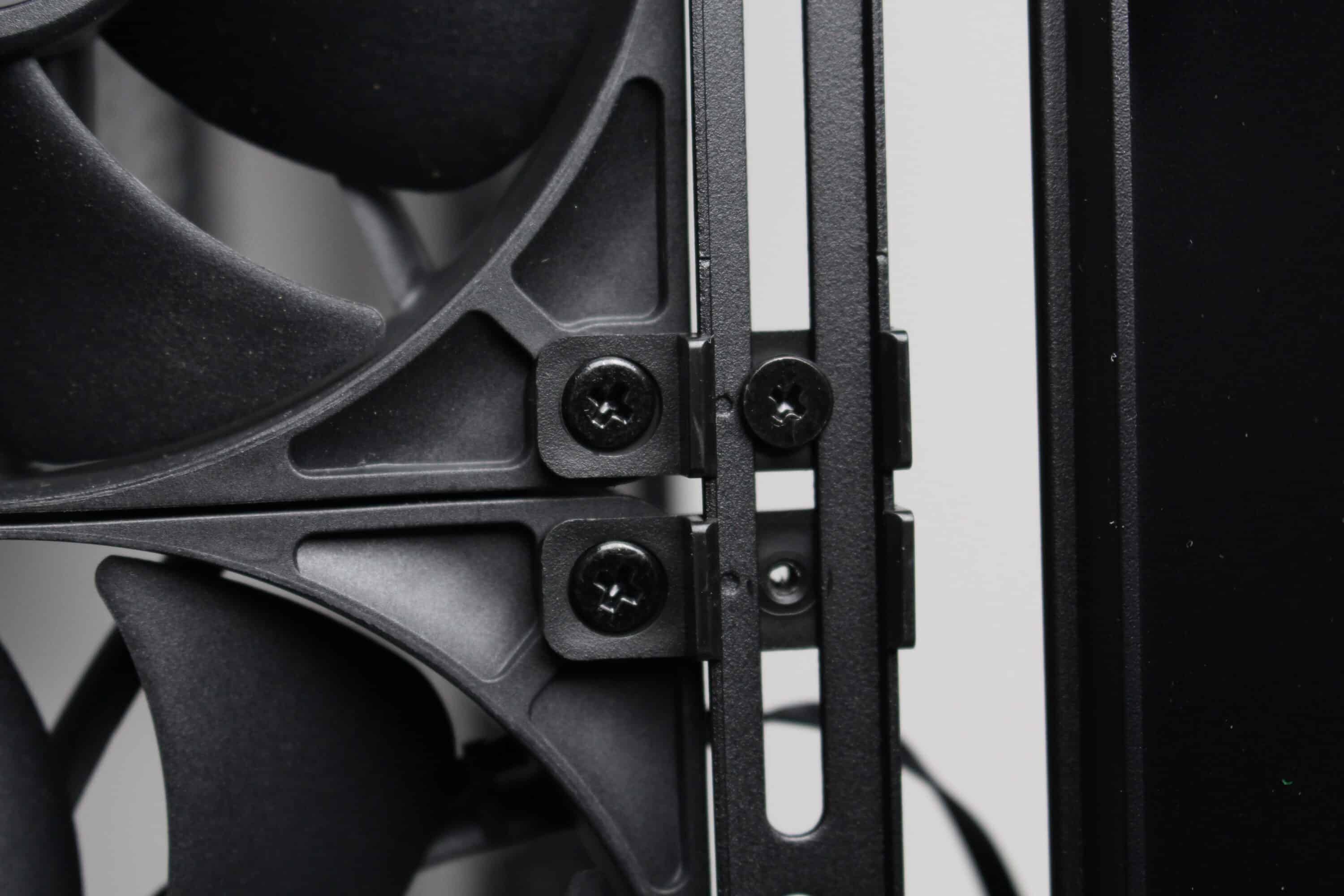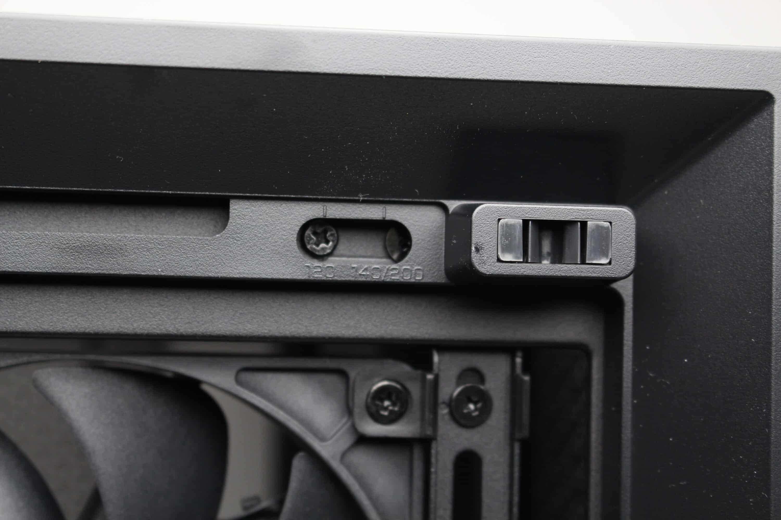 Corsair advertises the Frame 4000D with the Infinirail system, among other things. This is an implementation of mounting rails that can be moved with the help of a few screws. This allows three 120 mm, two 140 mm, two 160 mm or even two 200 mm fans to fit into the front of this midi tower without the need for numerous holes or brackets or steel elements interfering with the airflow. In addition, plastic clips allow the case fans to be mounted on the mounting rails in any position.
