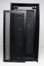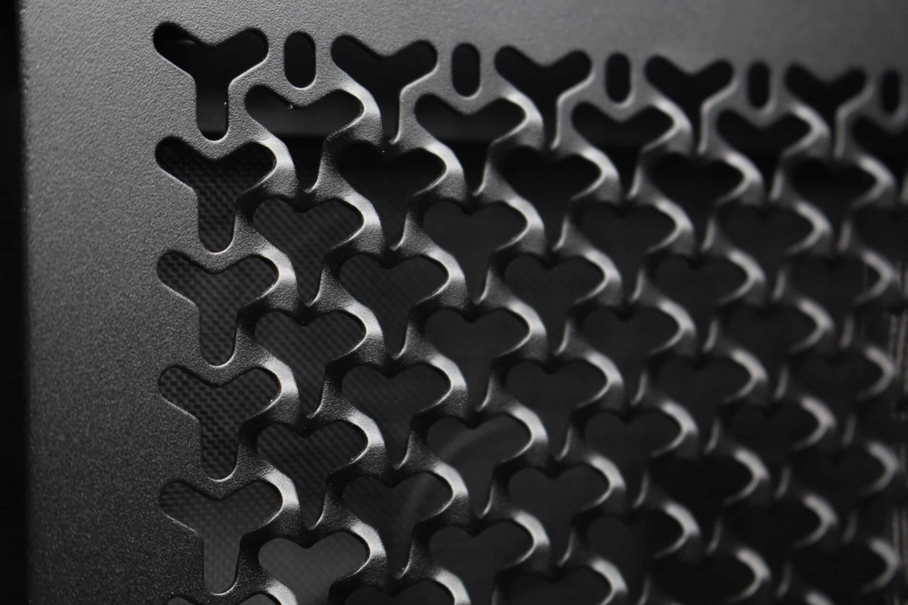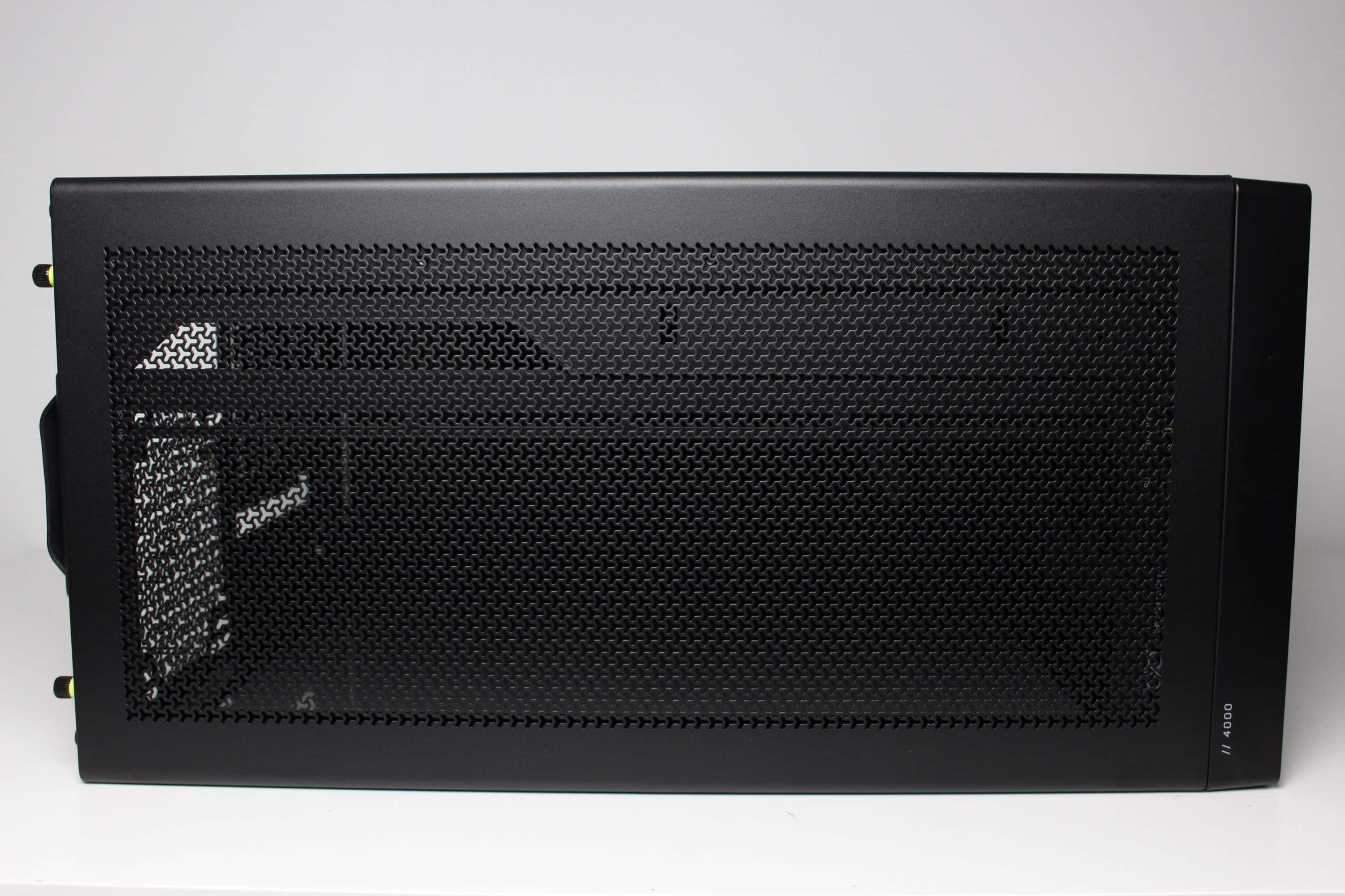 On the outside, the Corsair Frame 4000D RS has changed somewhat compared to its predecessor. The front is dominated by a large metal ventilation grille, which has an interesting 3D structure and is somewhat reminiscent of Apple’s “cheese grater” in the Mac Pro. However, we personally like the look very much. The front panel, which is attached with push pins, is surrounded by a sturdy plastic frame, behind which a magnetic, fine-mesh dust filter and three pre-installed 120 mm fans can be seen.