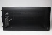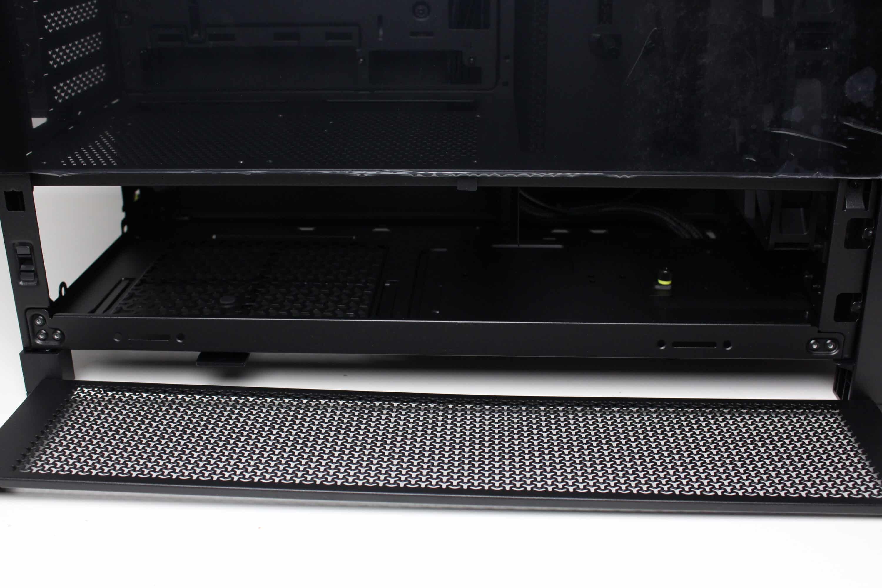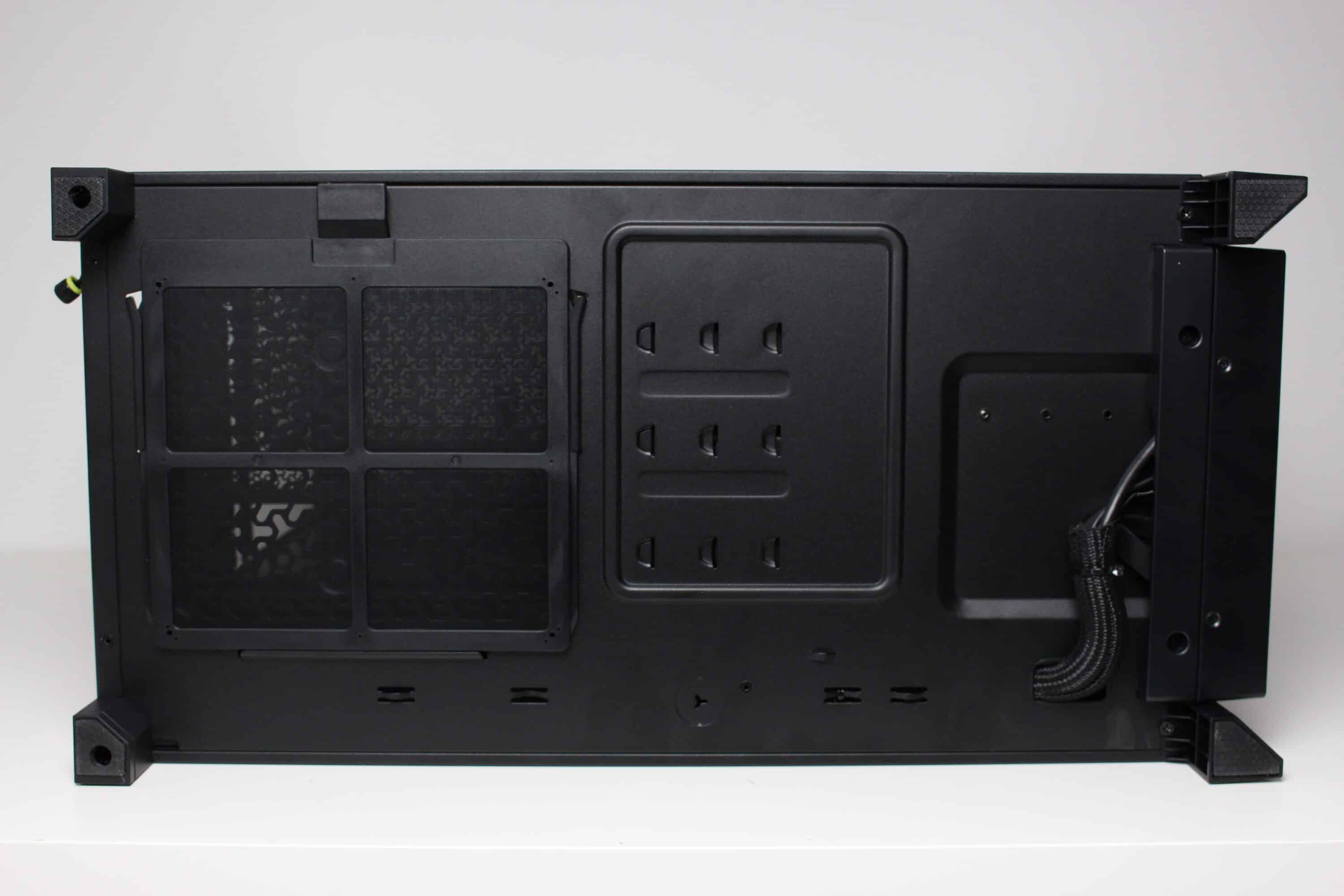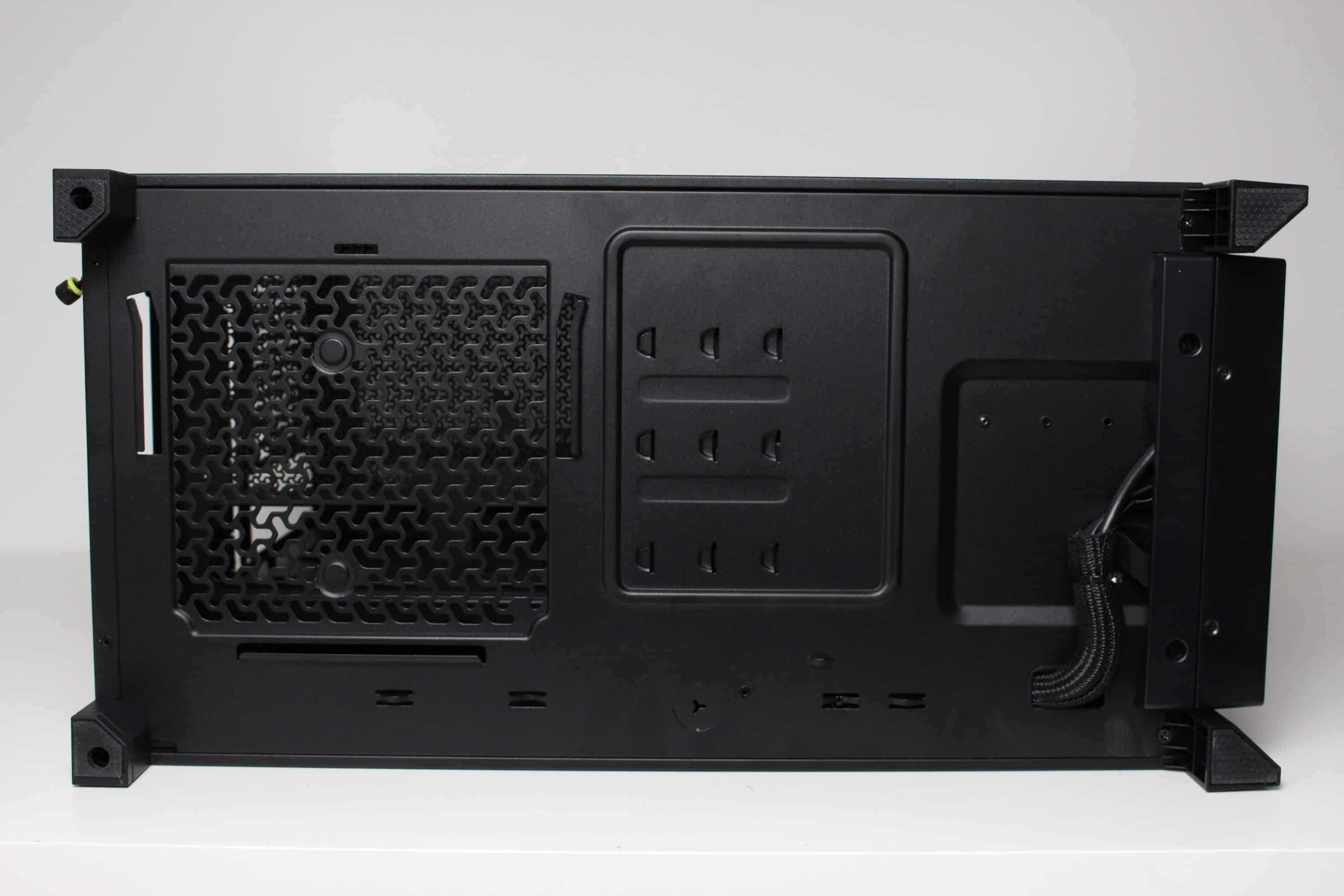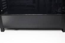The design of the power supply panel in the lower area is different to what is now common. The panel does not cover the entire lower area and offers little privacy due to the generous perforation. On the other hand, two 120 mm fans can be screwed onto the top, which could help with cooling the graphics card in particular. The power supply panel has a particularly large cut-out in the front area so that a particularly deep radiator can be installed behind the front or on the side.
