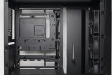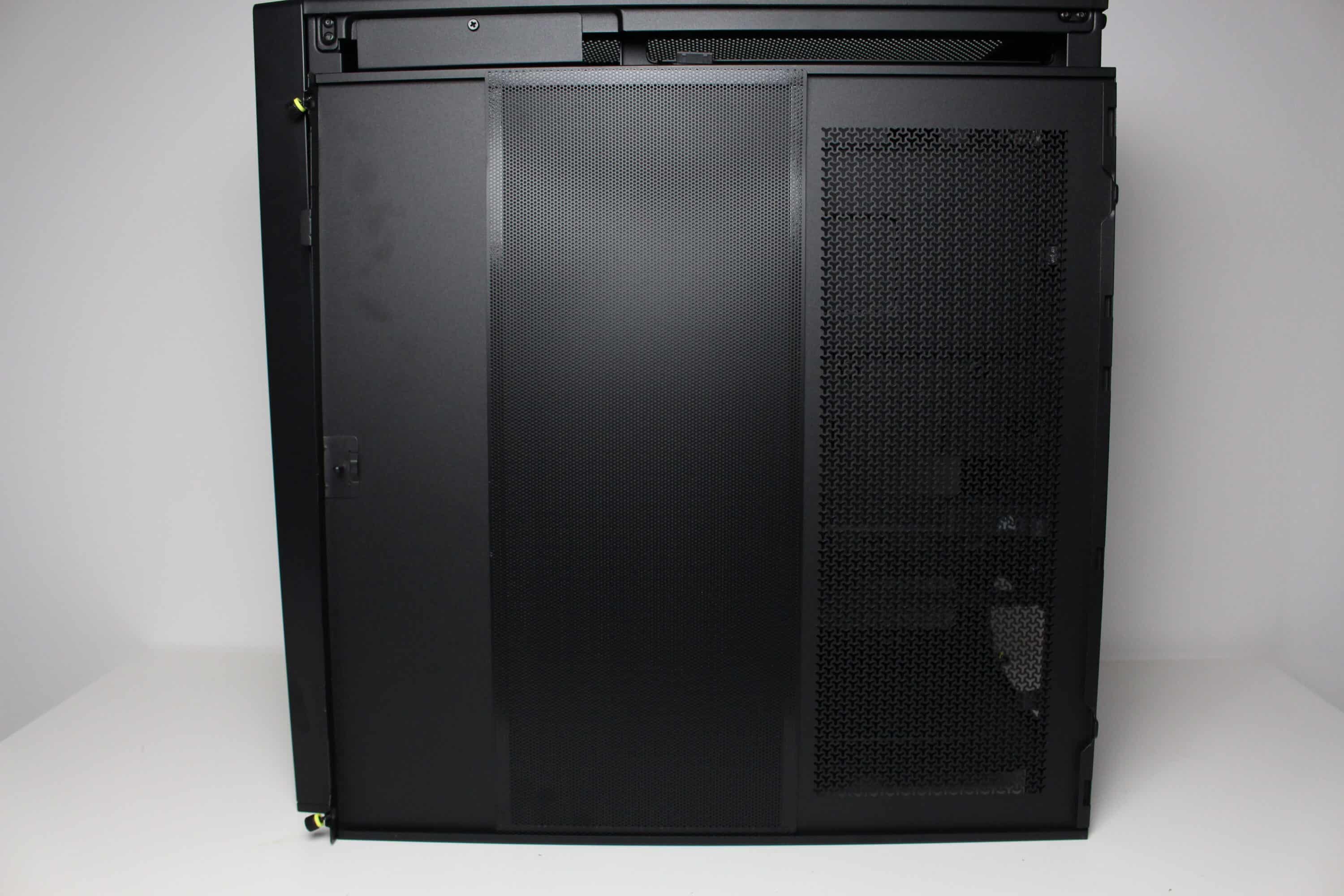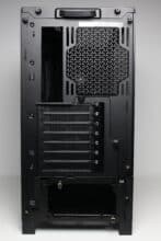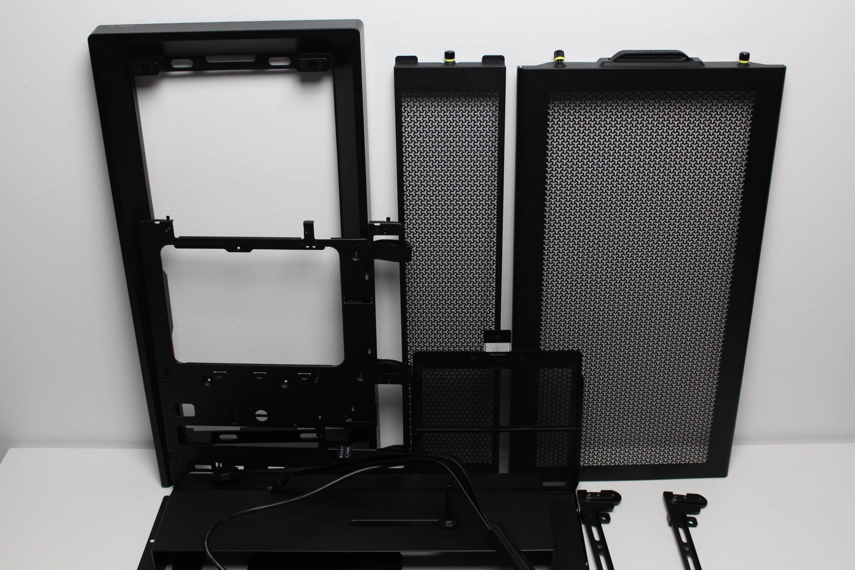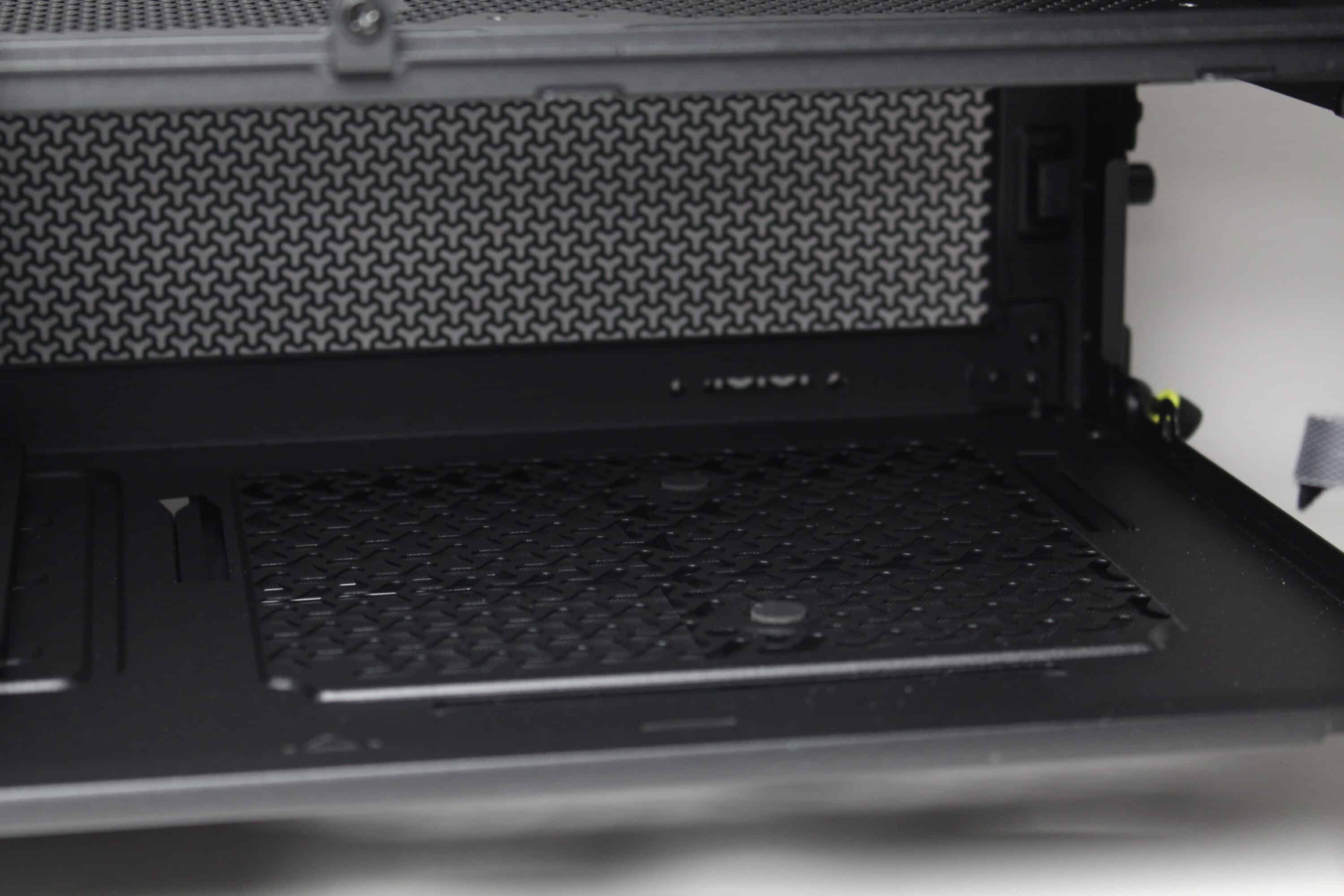 The design of the power supply panel in the lower area is different to what is now common. The panel does not cover the entire lower area and offers little privacy due to the generous perforation. On the other hand, two 120 mm fans can be screwed onto the top, which could help with cooling the graphics card in particular. The power supply panel has a particularly large cut-out in the front area so that a particularly deep radiator can be installed behind the front or on the side.