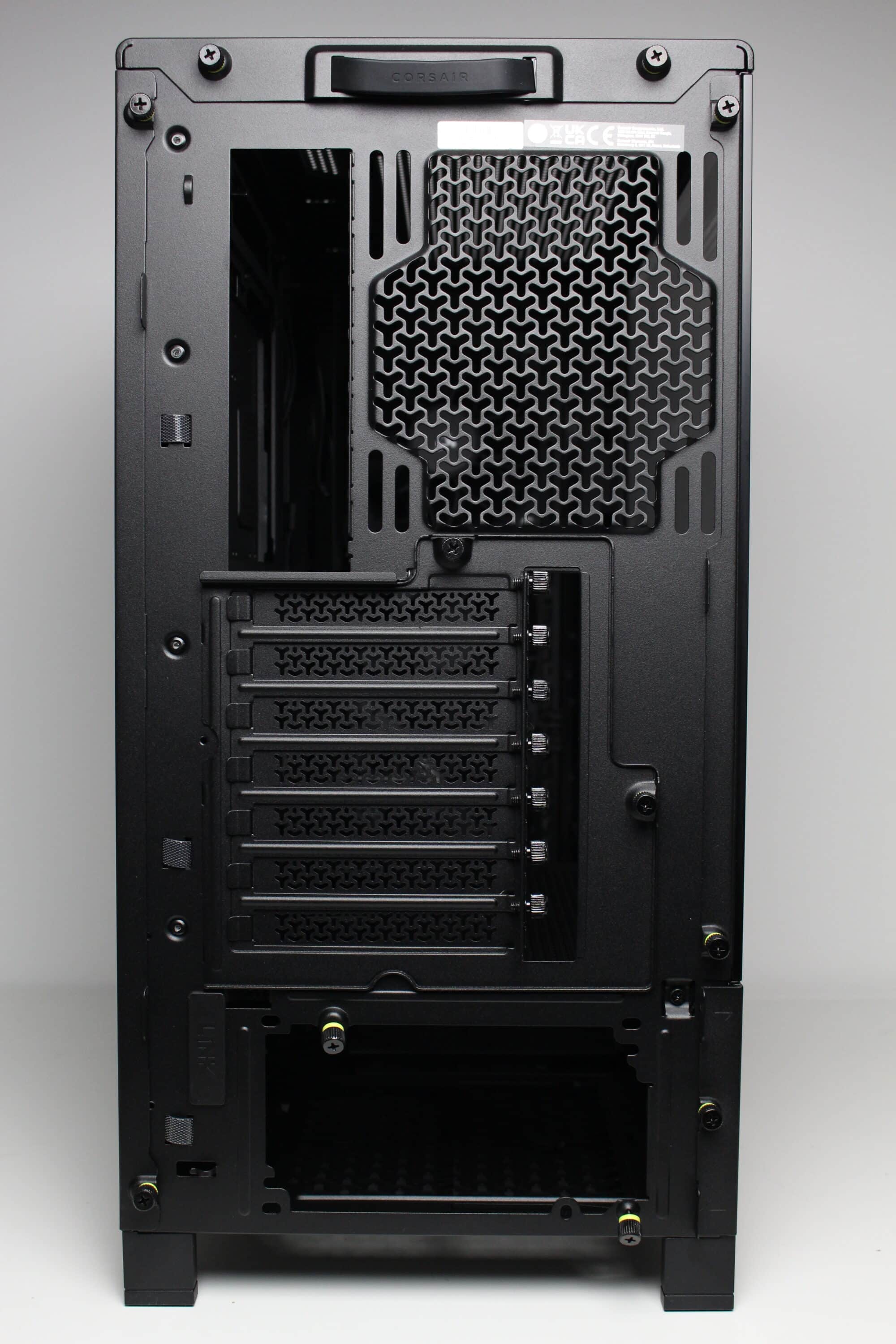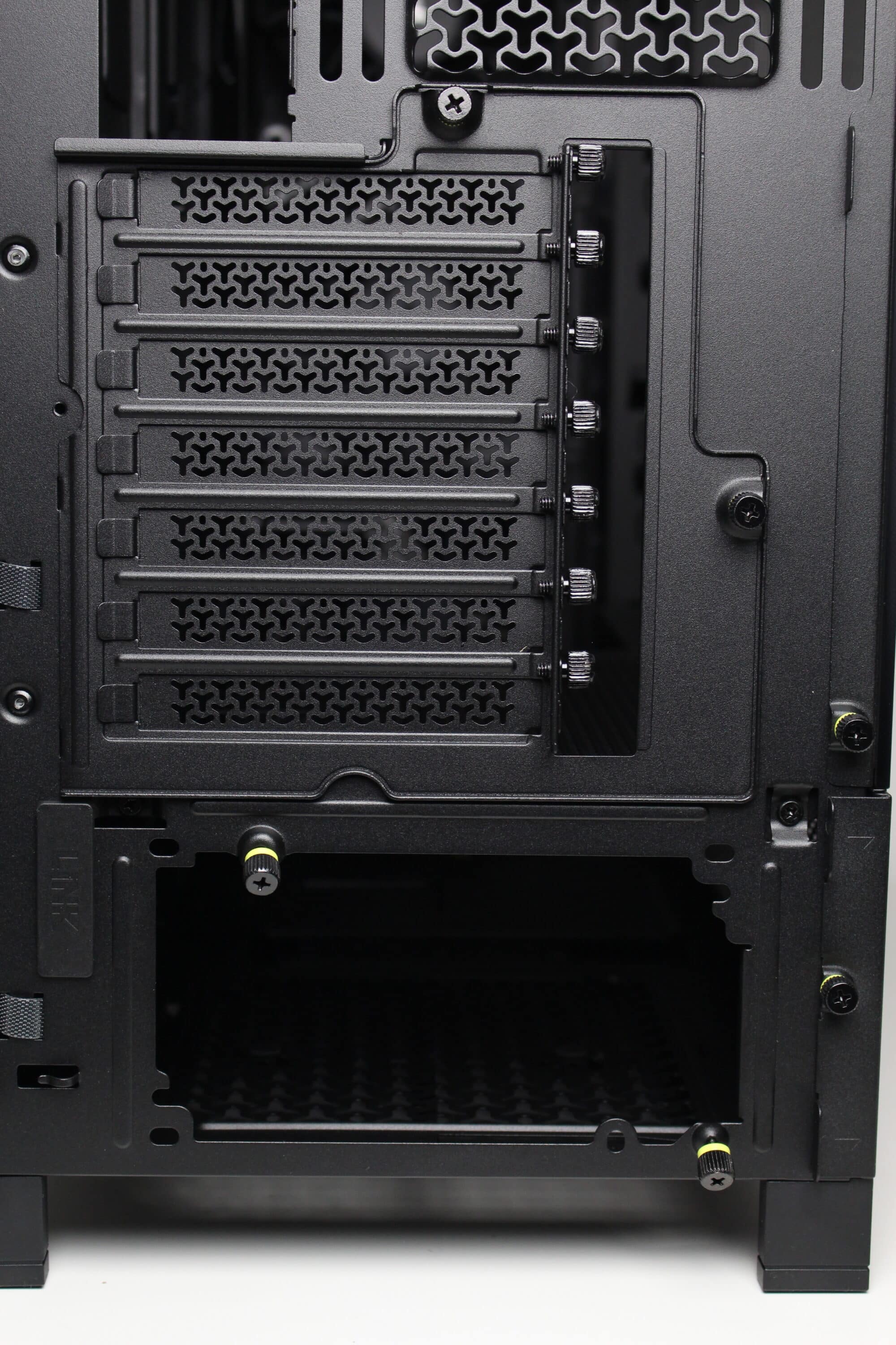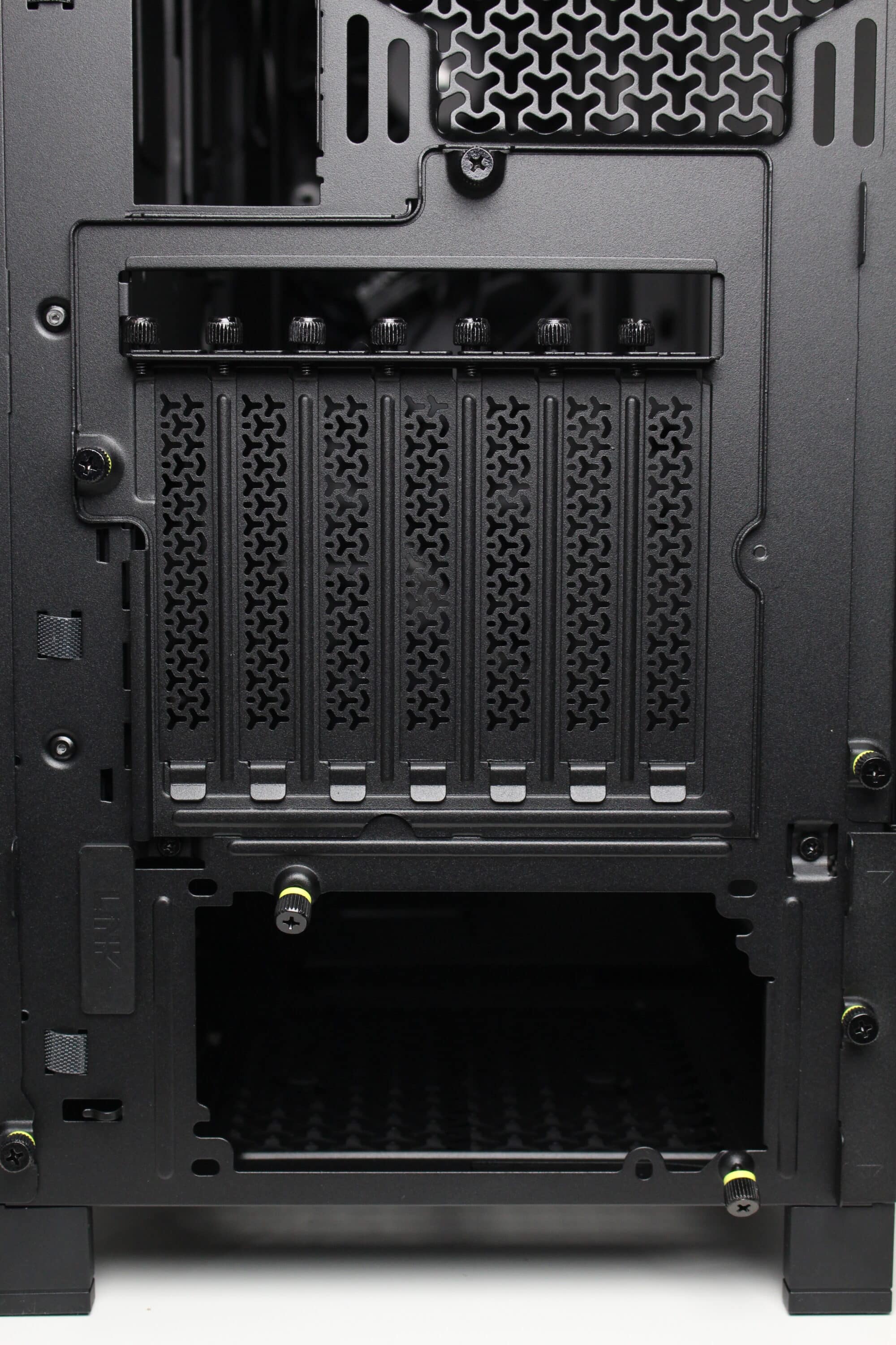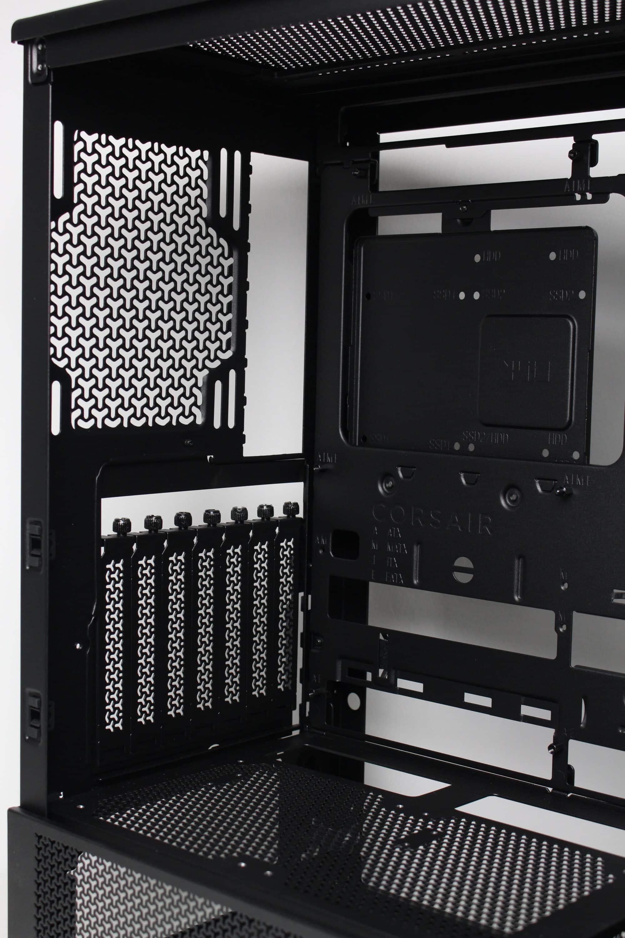 At first glance, the rear of this midi tower looks like that of any other midi tower case. The power supply unit is mounted in the base and seven perforated and reusable panels can be seen above it. The upper section of the Corsair Frame 4000D RS also offers space for a 120 or 140 mm fan. A special feature, however, is the rotating mounting frame for the slot bezels. Only two knurled screws need to be loosened to allow the frame to be rotated and thus enable horizontal GPU mounting.