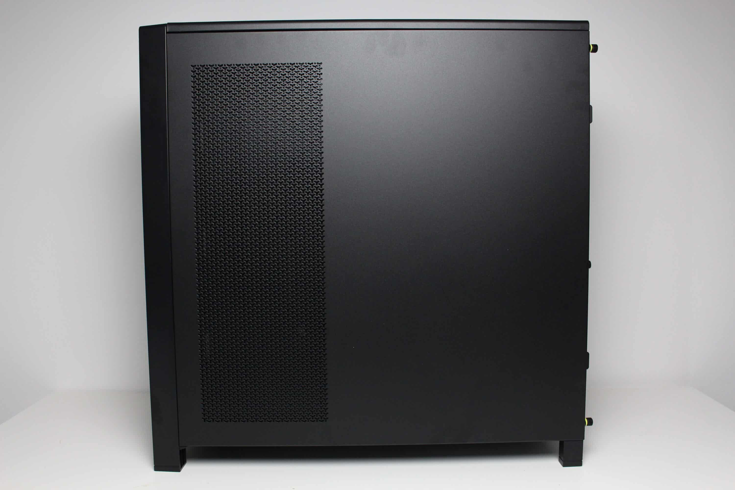 The left side of the Corsair Frame 4000D RS is divided into two parts. The upper part is made of tempered glass, which is glued to a steel frame, which in turn is attached to the body via retaining lugs, push pins and two knurled screws. Underneath we can see a thin ventilation grille, which can also be removed. The right-hand side panel is made of very thin steel and has a filtered ventilation opening as well as knurled screws and push pins for attachment to the body.