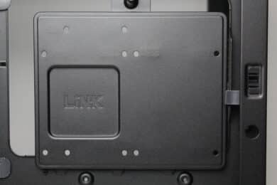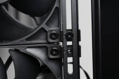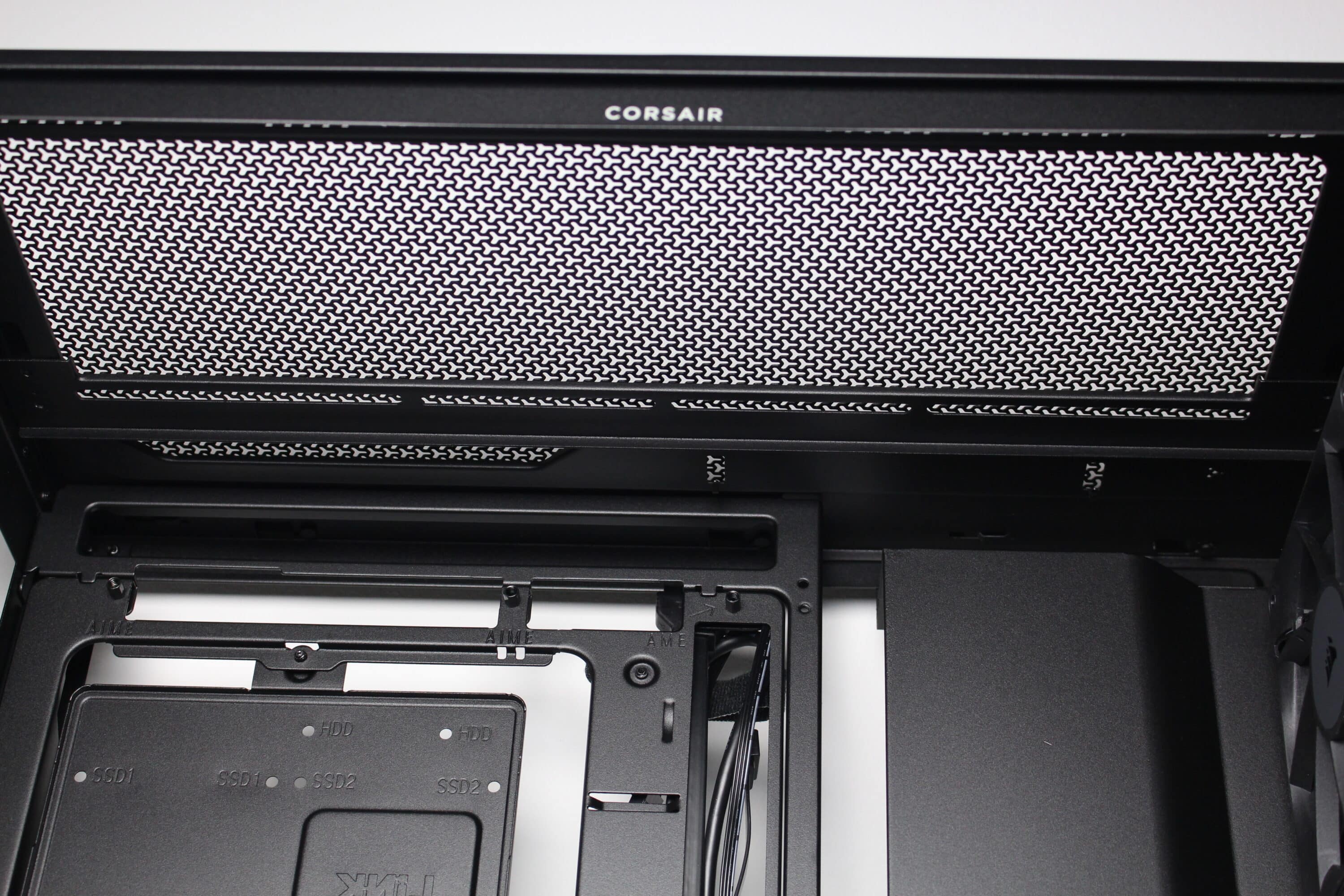 For mounting data carriers, Corsair provides the Frame 4000D RS with two steel frames, each with space for two 2.5″ SSDs or one 3.5″ HDD. Mounting is done with screws and unfortunately a decoupling option is not provided. Nevertheless, the frame itself is mounted using a knurled screw.
