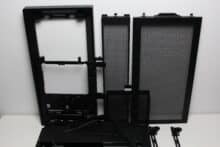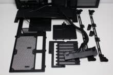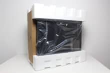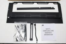 Inside the box, Corsair wraps the Frame 4000D RS in two large blocks of hard polystyrene and a plastic film to protect the case from scratches and fingerprints. Corsair places the accessories in front of the front panel in a very large box. This contains all the necessary screws, cable ties, an adapter cable for the front panel, spare parts for the Infinirail system (more on this later), a black cover for the power supply panel, an additional fan frame and a GPU bracket.
